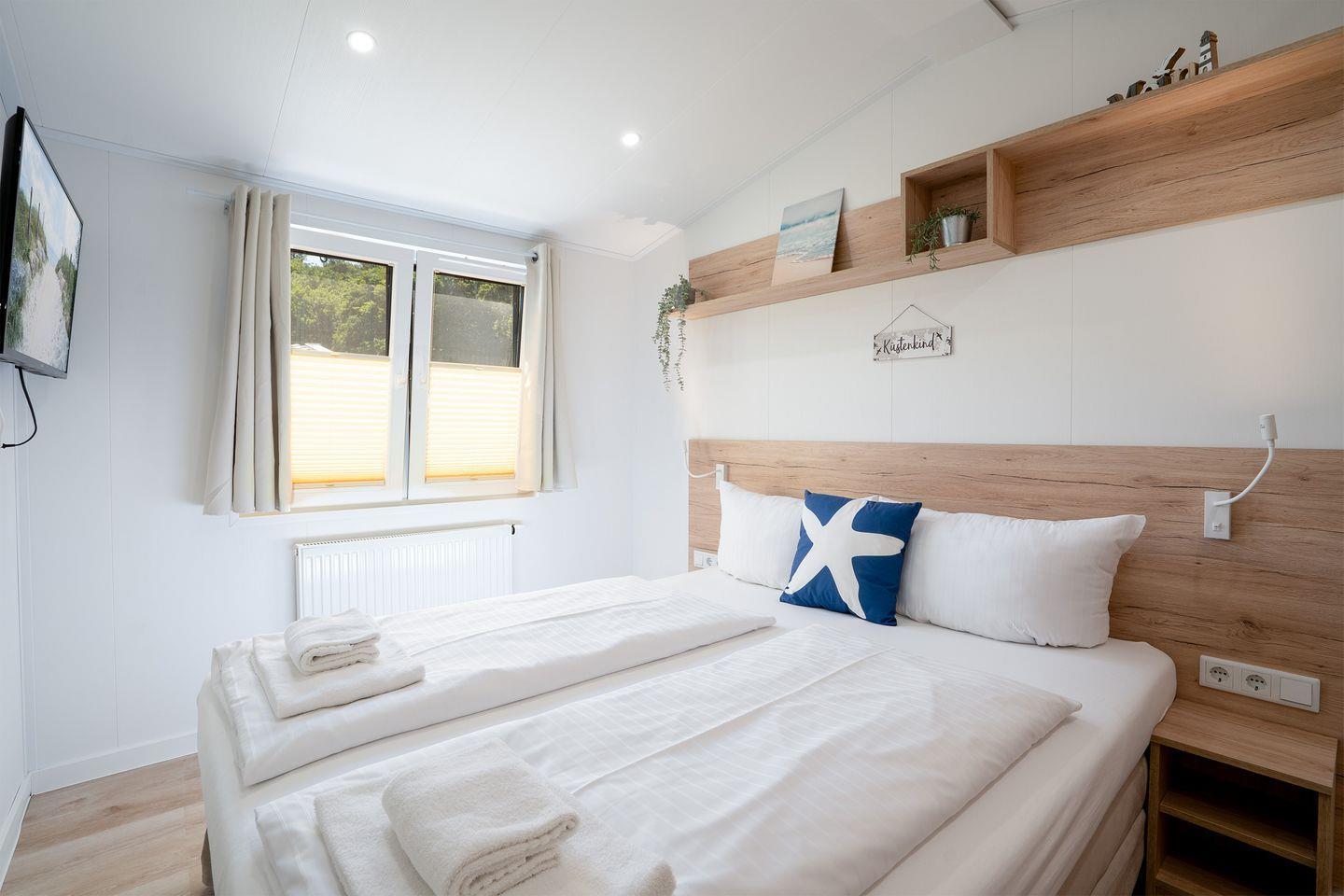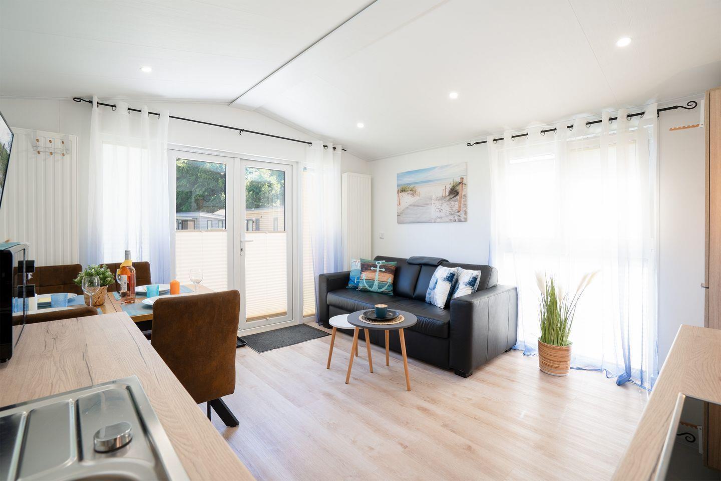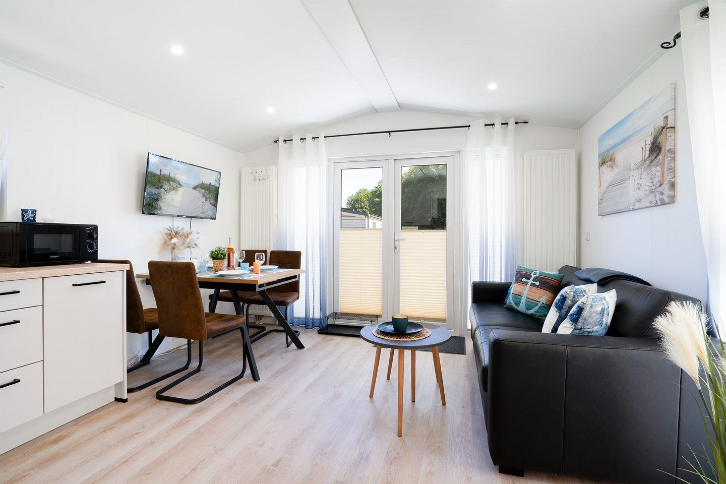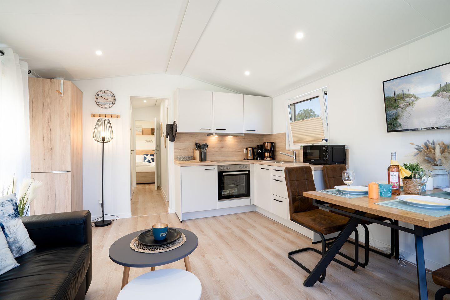 Das Ostseecamp Küstenkind verfügt über insgesamt 3 Zimmer, darunter 2 komfortable Schlafzimmer, die mit einem hochwertigen Vinylboden ausgestattet sind, und ein einladendes Wohnzimmer, das durch seine offene Gestaltung mit der Küche harmonisch verbunden ist. Hier genießen Sie nicht nur den Blick auf die Umgebung, sondern auch die gesellige Atmosphäre, die das gemeinsame Kochen und Beisammensein zu einem besonderen Erlebnis macht. Die moderne Küche ist vollständig ausgestattet inklusive Herd, Backofen, Spülmaschine und allen notwendigen Küchenutensilien. Hier finden Sie alles, was Sie zur Zubereitung Ihrer Mahlzeiten benötigen. Ein Essbereich ist ebenfalls vorhanden und lädt dazu ein, gesellige Abendessen zu genießen.