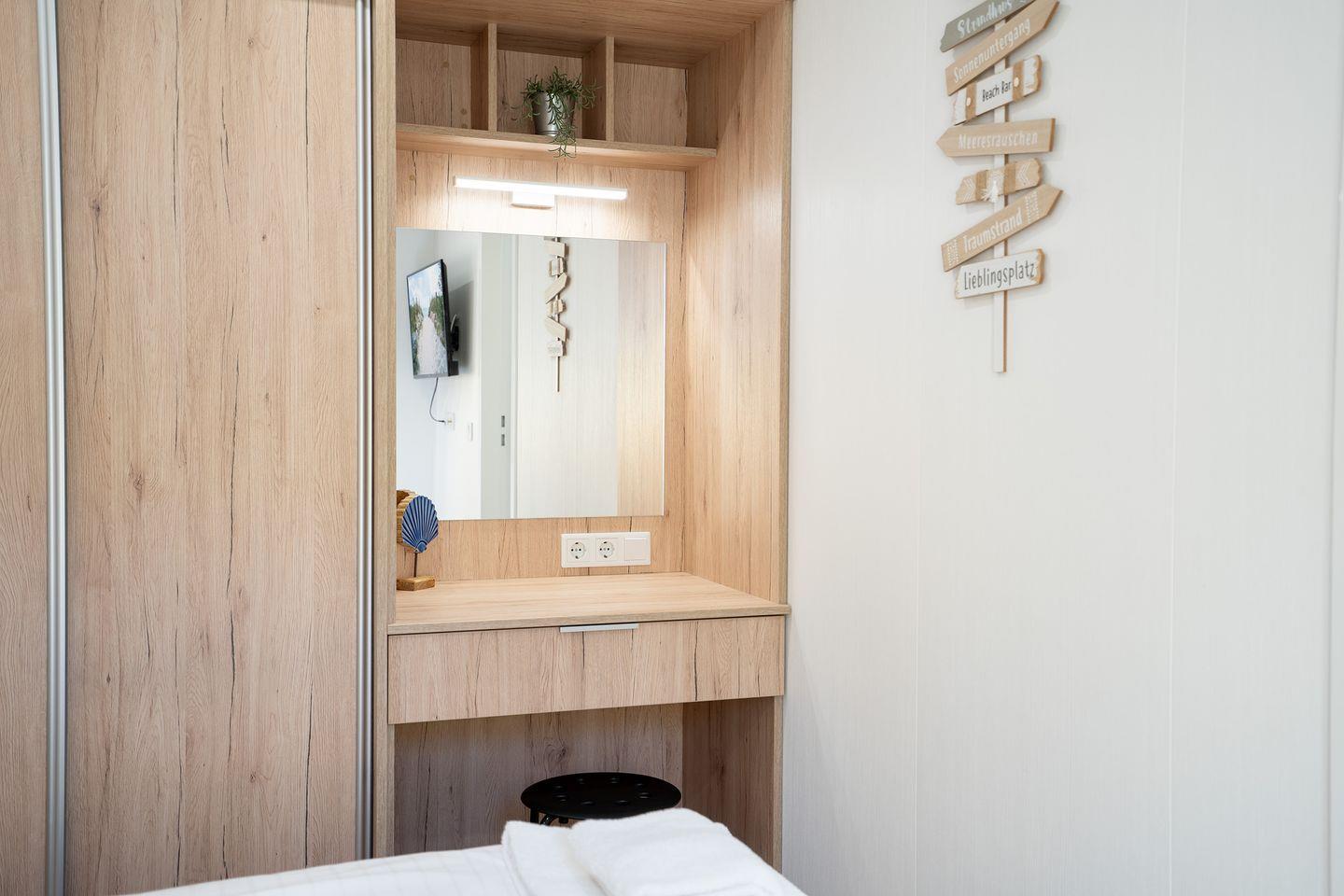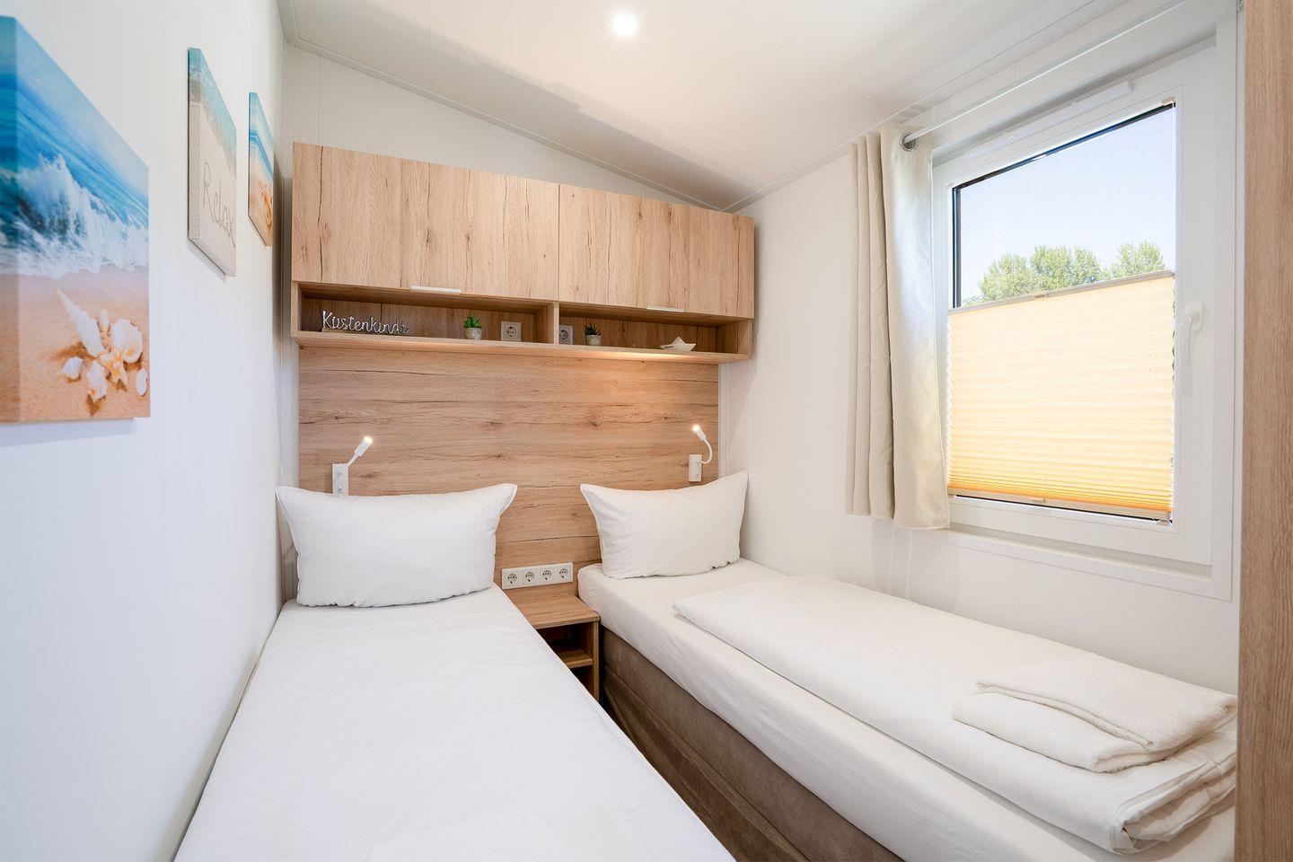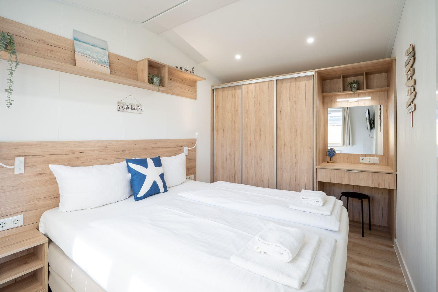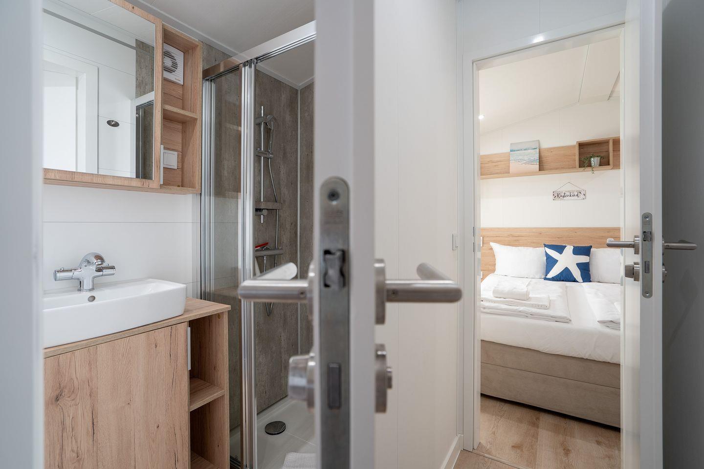 Das Ostseecamp Küstenkind verfügt über insgesamt 3 Zimmer, darunter 2 komfortable Schlafzimmer, die mit einem hochwertigen Vinylboden ausgestattet sind, und ein einladendes Wohnzimmer, das durch seine offene Gestaltung mit der Küche harmonisch verbunden ist. Hier genießen Sie nicht nur den Blick auf die Umgebung, sondern auch die gesellige Atmosphäre, die das gemeinsame Kochen und Beisammensein zu einem besonderen Erlebnis macht. Die moderne Küche ist vollständig ausgestattet inklusive Herd, Backofen, Spülmaschine und allen notwendigen Küchenutensilien. Hier finden Sie alles, was Sie zur Zubereitung Ihrer Mahlzeiten benötigen. Ein Essbereich ist ebenfalls vorhanden und lädt dazu ein, gesellige Abendessen zu genießen.