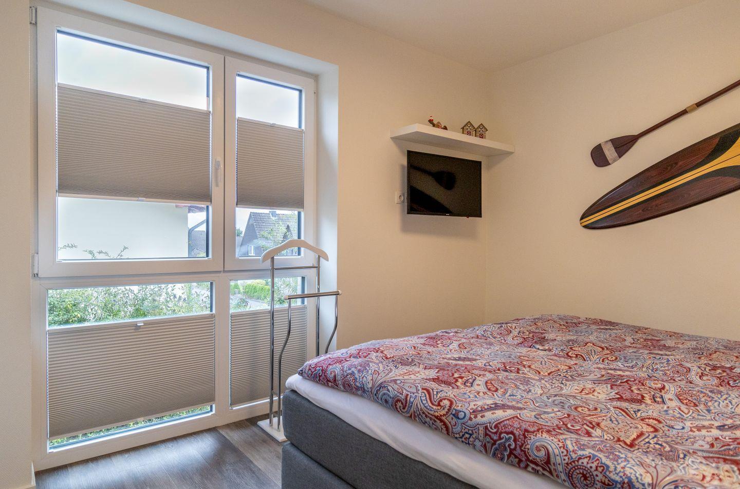 Zwei gemütliche Schlafzimmer bieten jeweils ein komfortables Doppelbett (je 180 x 200 cm) – ideal für Paare, Freunde oder Familien. Beide Räume verfügen über ausreichend Stauraum und lassen sich bei Bedarf verdunkeln – für erholsame Nächte nach einem Tag an der Ostsee.