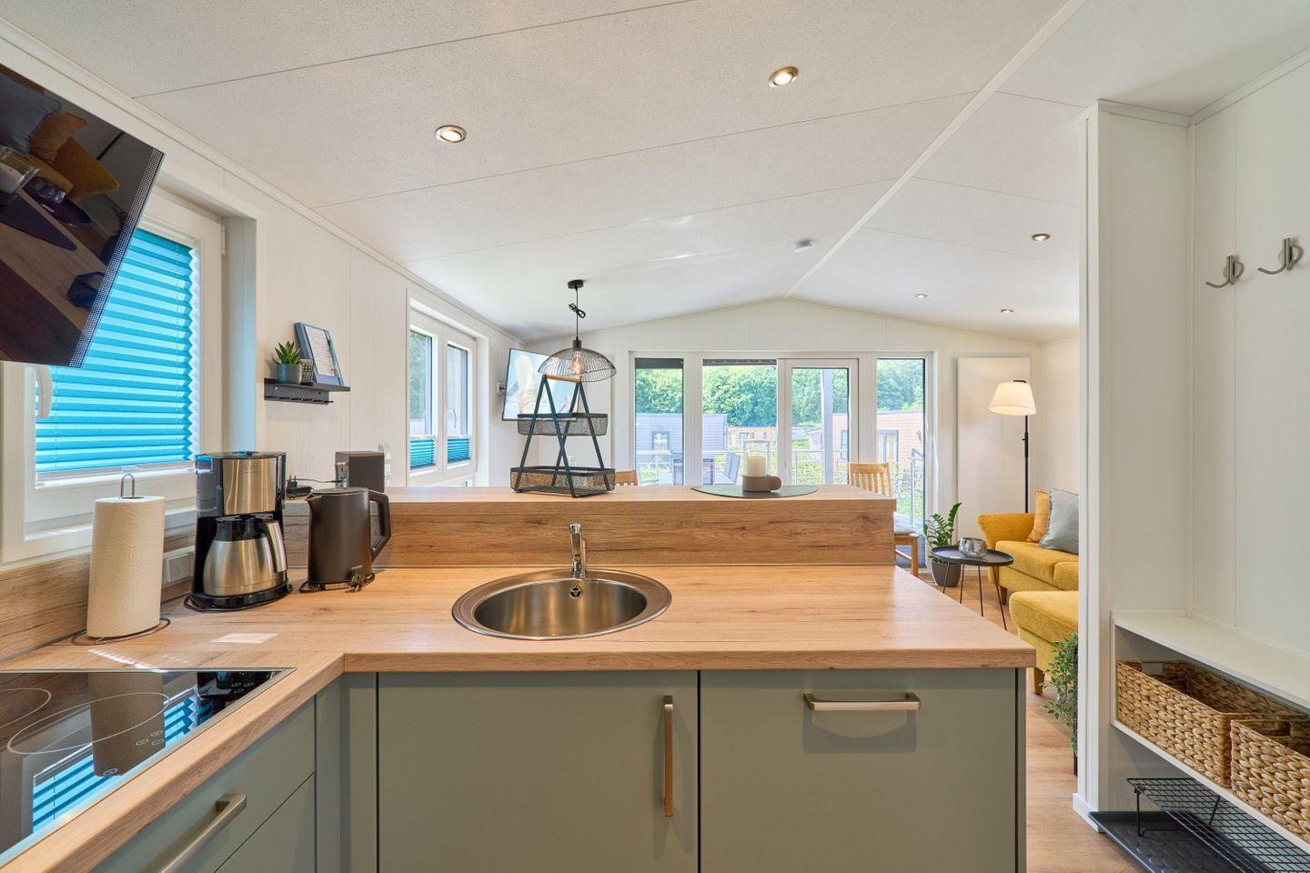 Der offene Wohn- und Essbereich ist mit einem gemütlichen Sofa, einem Esstisch und einem Fernseher ausgestattet, der für entspannte Abende sorgt. Die Küche lässt keine Wünsche offen: Egal ob Sie ein schnelles Frühstück zaubern oder ein aufwendiges Abendessen zubereiten möchten – Herd, Geschirrspüler, Backofen und Kühlschrank sind bereit, Ihre kulinarischen Ideen umzusetzen.