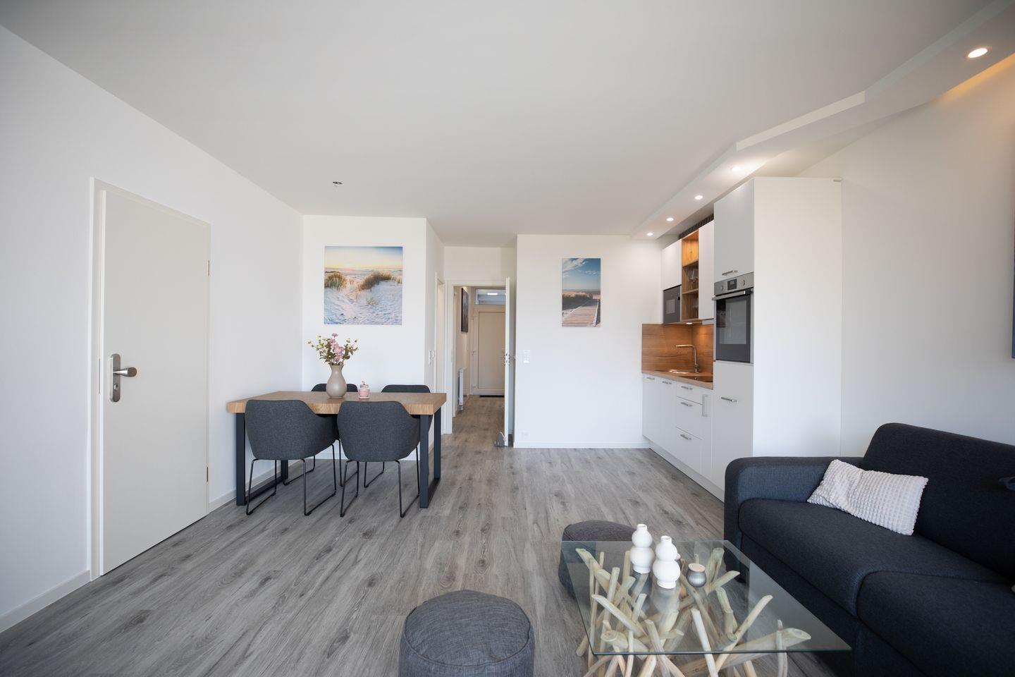 Der helle Wohn-Essbereich mit offener Küche lädt zum gemeinsamen Kochen und Entspannen ein. Eine große Schlafcouch bietet eine zusätzliche Schlafmöglichkeit, sodass die Wohnung flexibel genutzt werden kann. Der nach Süden ausgerichtete Balkon verspricht ganztägig Sonne und bietet einen Teilmeerblick, der zum Verweilen einlädt.