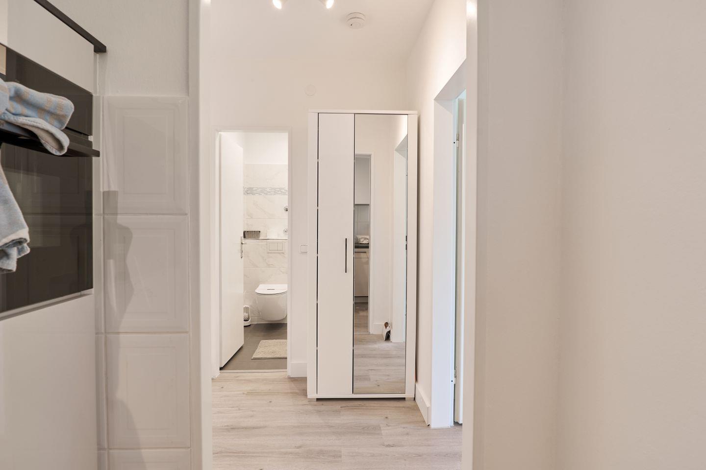 Das Schlafzimmer ist mit einem komfortablen Doppelbett (140x200) und einem großzügigen Schrank ausgestattet, sodass Sie genügend Stauraum für Ihr Gepäck haben. Die warmen Farben und das moderne Design sorgen für eine behagliche Atmosphäre, in der Sie zur Ruhe kommen können.