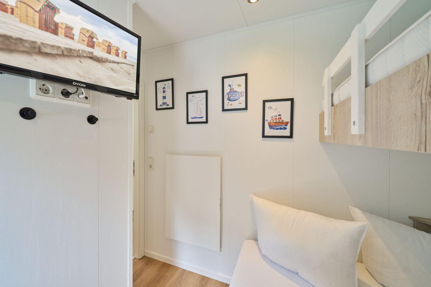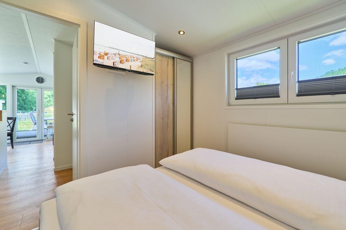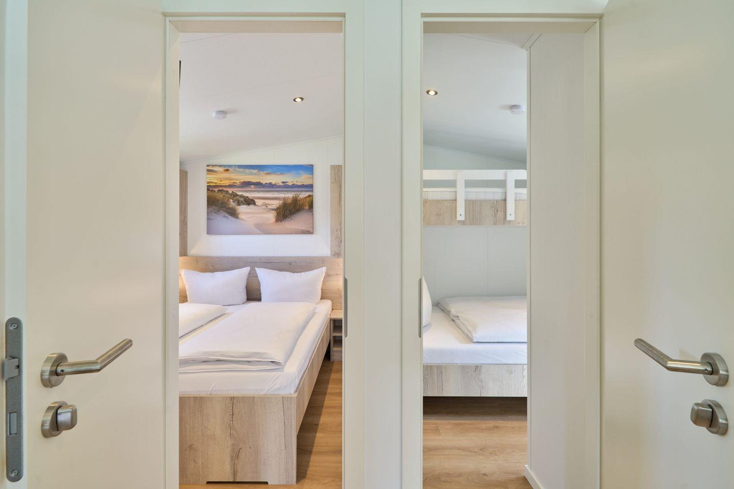 Die geschmackvolle Einrichtung umfasst zwei separate Schlafzimmer, die mit hochwertigen Vinylboden ausgestattet sind, sowie ein helles und freundliches Wohnzimmer, das offen mit der voll ausgestatteten Küche verbunden ist. Der Essbereich mit einem großzügigen Esstisch bietet Platz für gesellige Mahlzeiten, während das komfortable Sofa für entspannende Stunden nach einem aufregenden Tag am Strand einlädt. Hier haben Sie zudem die Möglichkeit, bequem einen Film über den Satelliten-TV zu genießen oder das kostenfreie WLAN für Ihre digitalen Bedürfnisse zu nutzen.