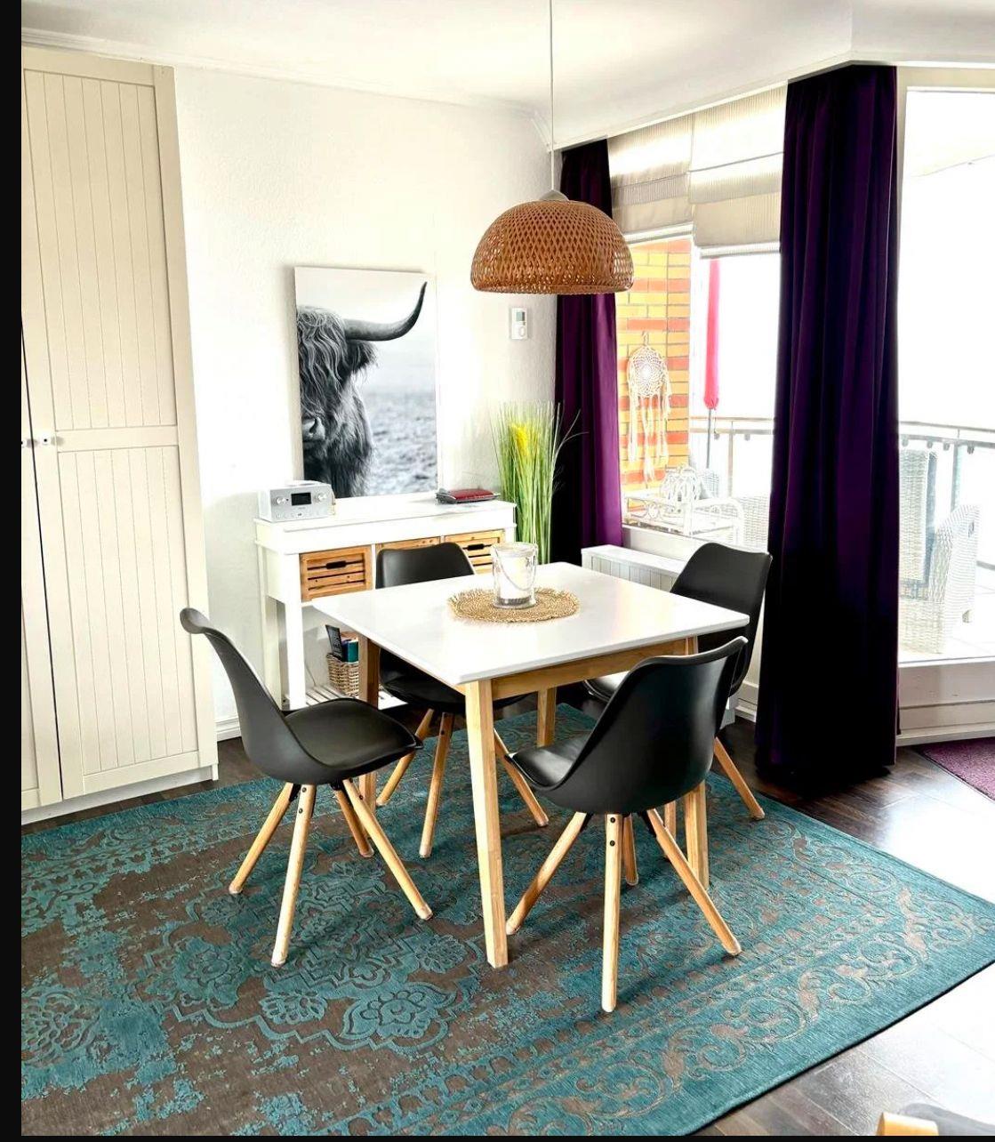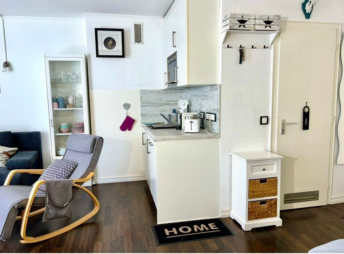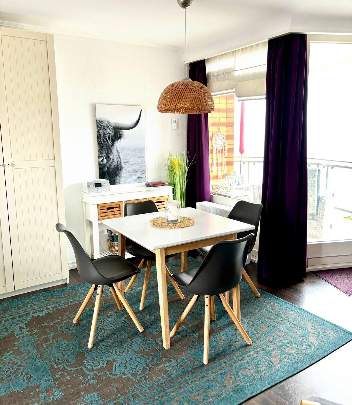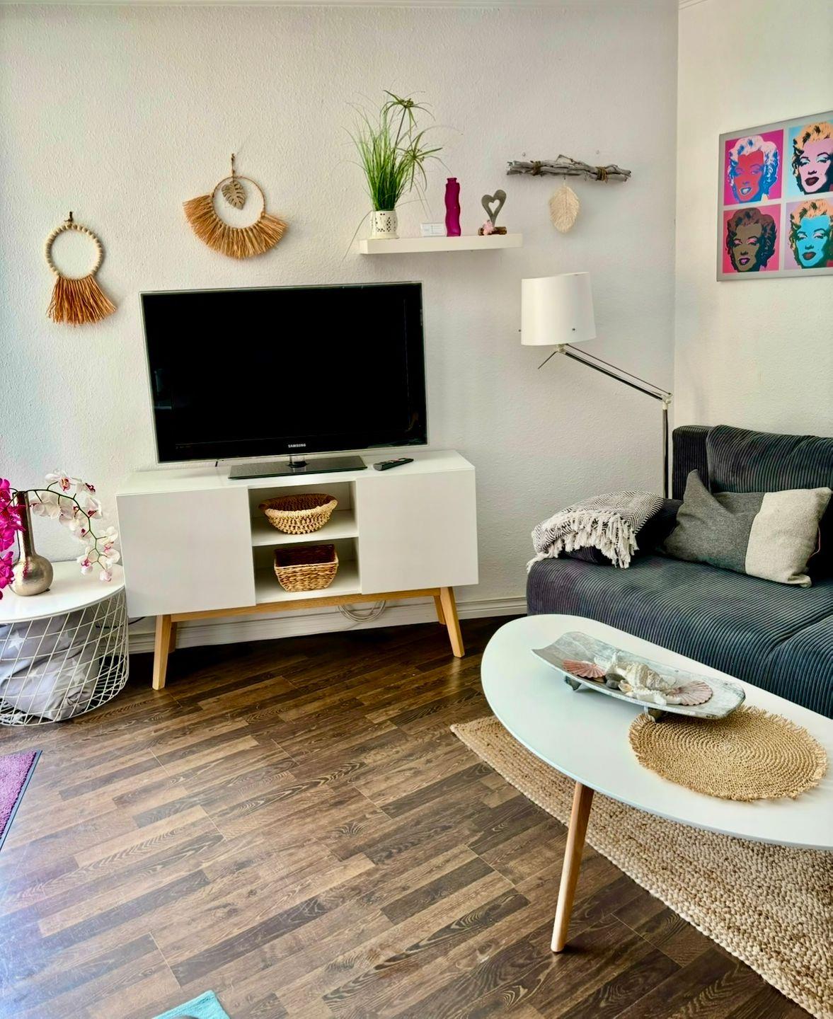 Die hochwertige Ausstattung der 1-Zimmer-Wohnung lässt keine Wünsche offen. Der offene Grundriss verbindet das Wohnzimmer mit der Küche, wodurch eine moderne und wohnliche Atmosphäre entsteht. Die Küche ist ausgestattet mit einem 2-Platten-Ceranherd, Geschirrspüler, Kühlschrank mit integriertem Gefrierfach, Mikrowelle, Kaffeemaschine, Wasserkocher, Toaster sowie umfangreiches Koch- und Essgeschirr. Im Essbereich finden bis zu vier Personen Platz am Esstisch. Die Sofaecke lädt zum Entspannen ein, während ein modernes TV-Gerät, Radio und kostenfreies WLAN für Unterhaltung sorgen.