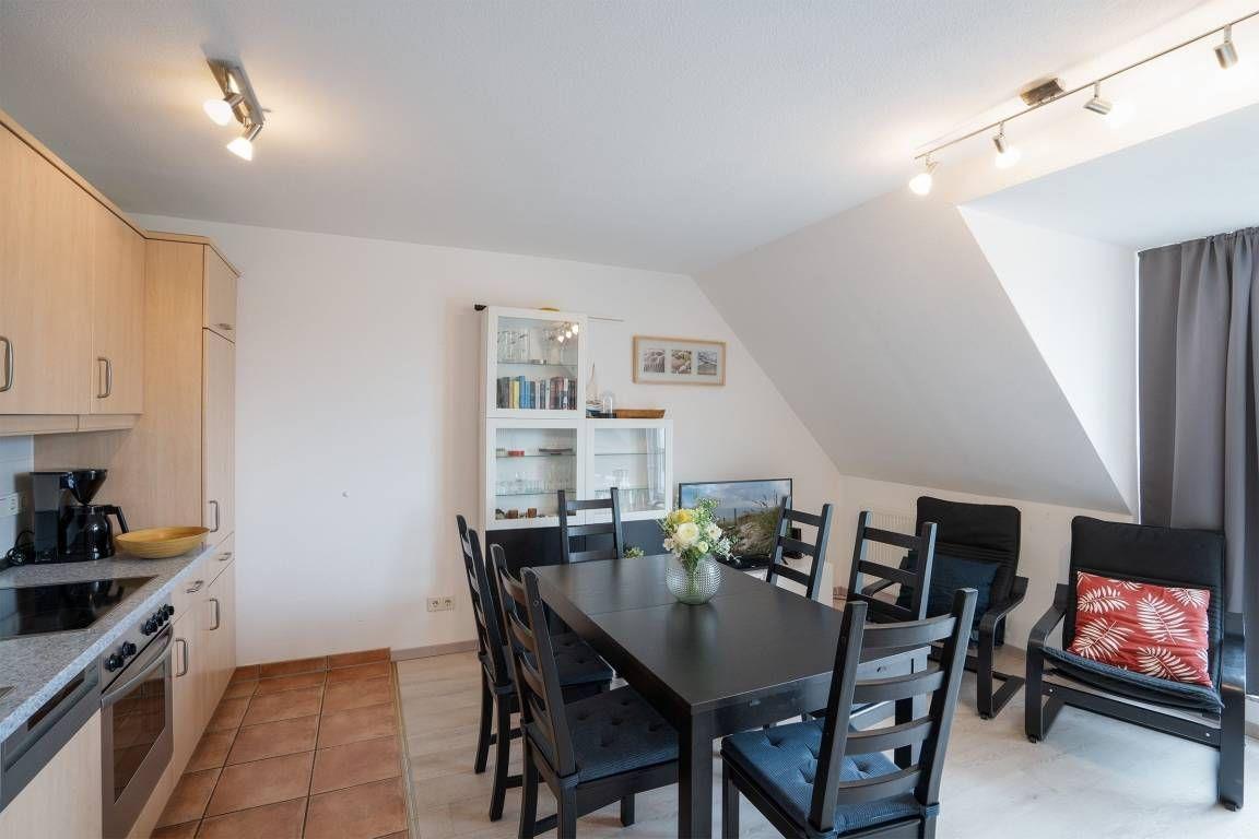 Das Wohnzimmer mit TV-Gerät und DVD-Spieler ist hell und einladend gestaltet und besticht durch eine gemütliche Sofaecke mit Sessel für entspannte Stunden. Der offene Wohnbereich integriert eine moderne Küche, die zum Wohnzimmer hin ausgerichtet ist. Die Ausstattung der Küche umfasst einen Ceranherd, Backofen, Mikrowelle, Kühlschrank mit Gefrierfach, Spülmaschine, Kaffeemaschine, Toaster, Küchenutensilien, sowie Geschirr und Besteck und ermöglicht komfortables Kochen – ob für kleine Snacks oder ausgedehnte Mahlzeiten. Am großzügigen Esstisch können Sie gemeinsam speisen. Das Schlafzimmer verfügt über ein bequemes Doppelbett (2x 90 cm x 200 cm), sowie ein TV-Gerät.