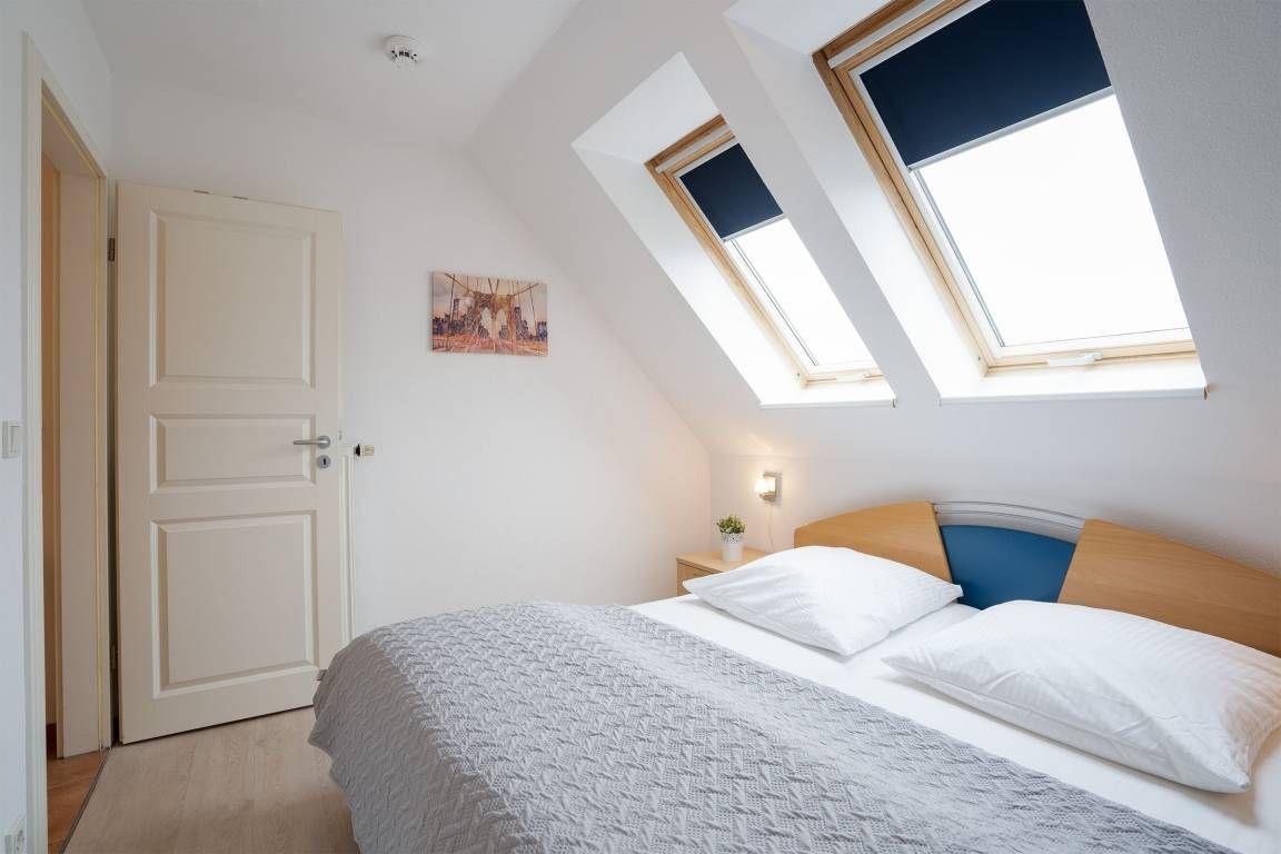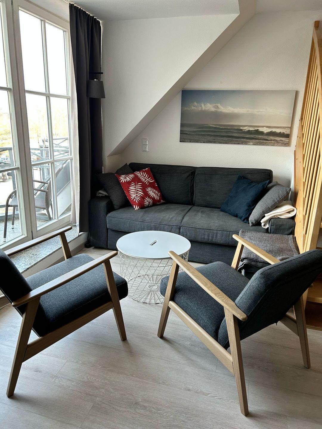 Der geräumige Wohn- und Schlafbereich in der 1. Etage verfügt über ein komfortables Doppelbett (140 x 200 cm), sowie ein Schlafsofa (130 cm x 185 cm). Auch dieser Bereich verfügt über ein TV-Gerät und einen kleinen Balkon.