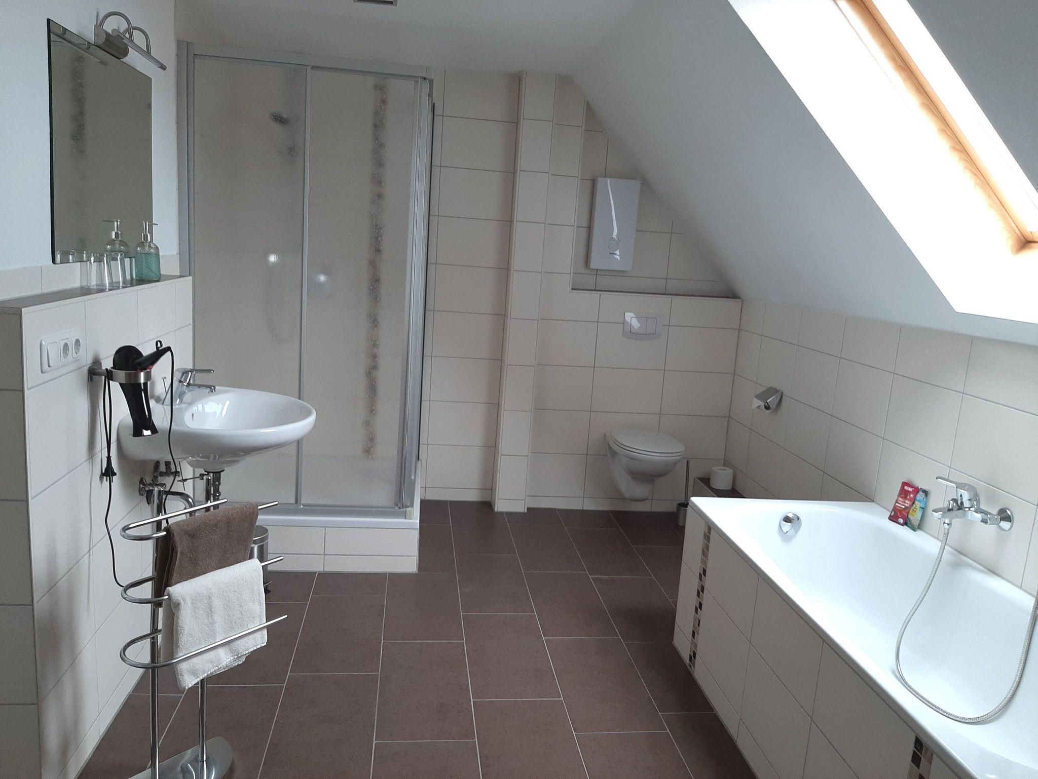 Unsere Ferienwohnung MERLIN ist ca. 64 qm groß und befindet sich im Dachgeschoss unseres Hauses. Sie besteht aus einer eingerichteten Küche mit Essbereich, einem Wohnzimmer, einem Schlafzimmer (Bettengröße: 180x200 cm) und einem sehr großen Badezimmer mit Badewanne und Dusche.