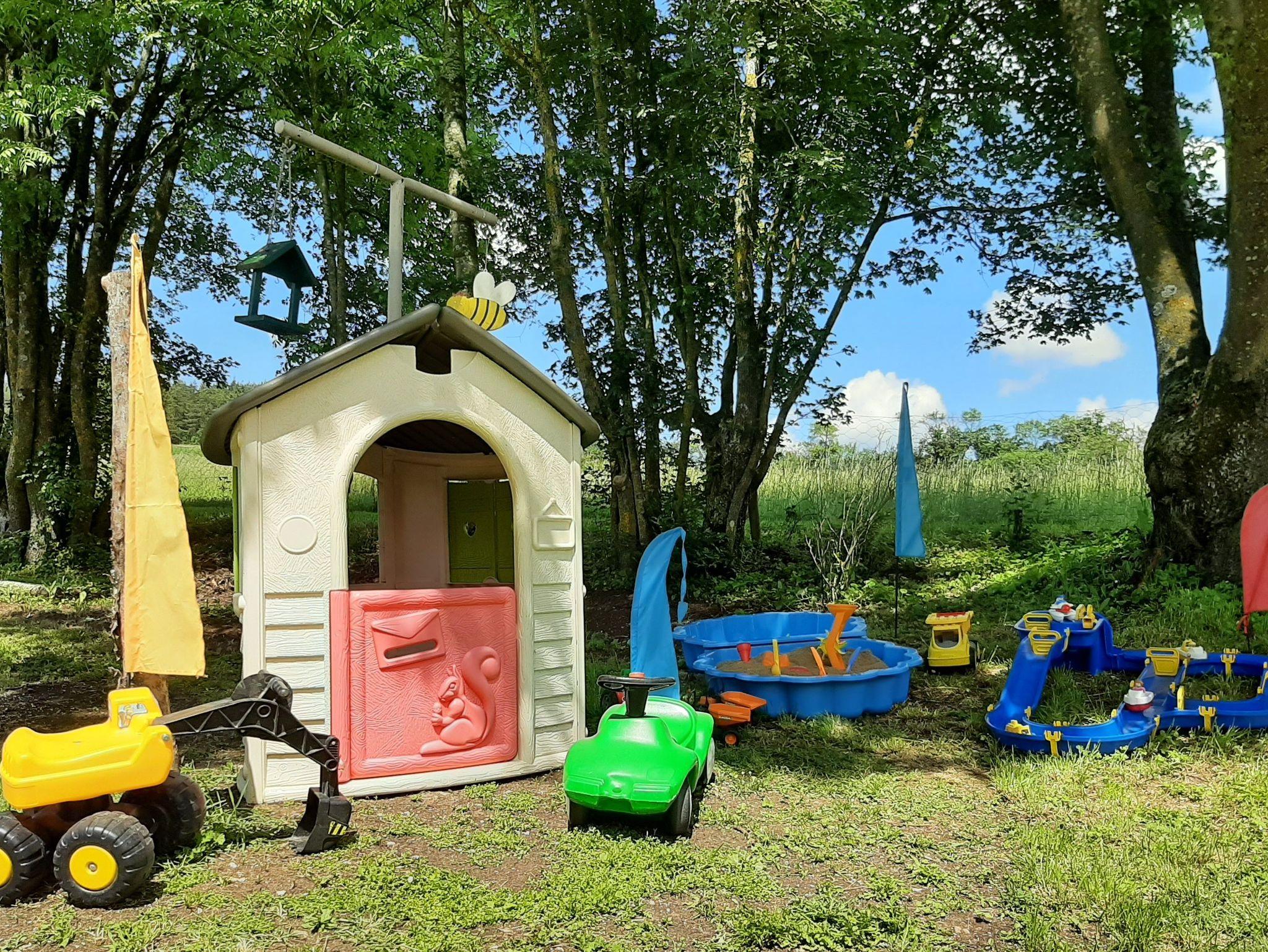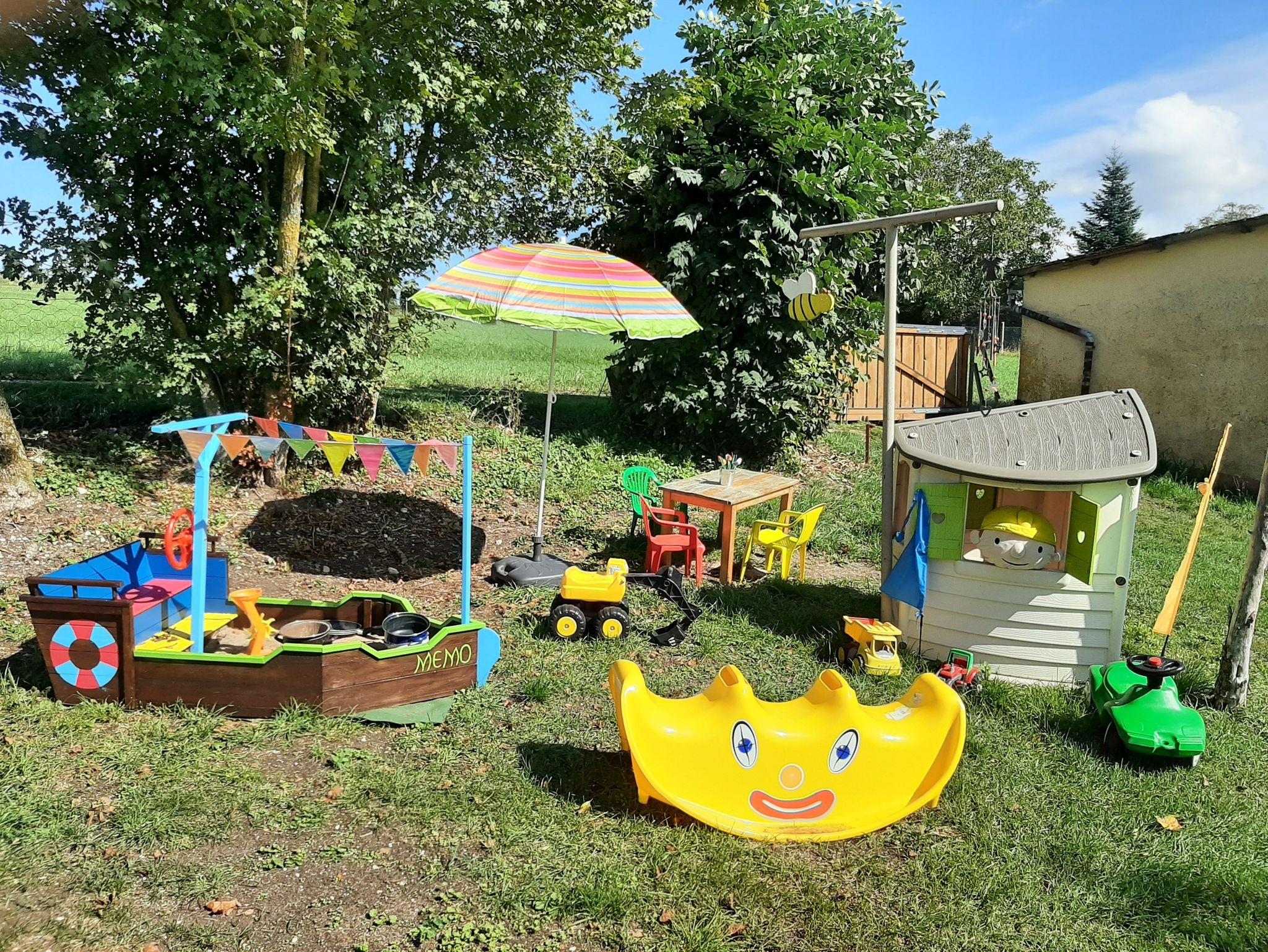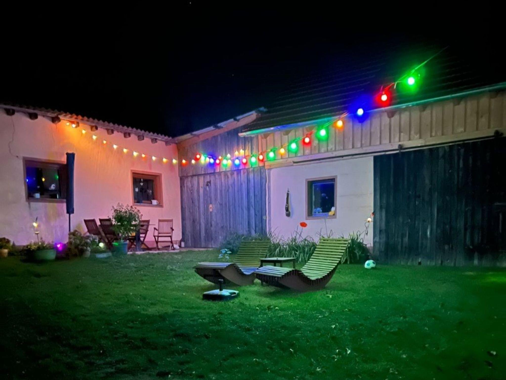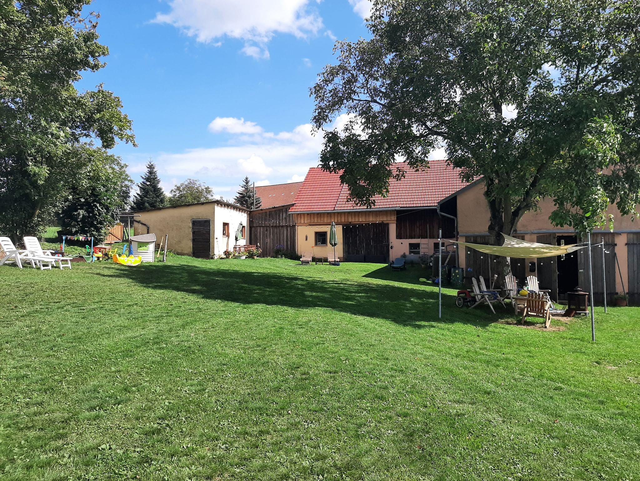 Die großzügige Außenanlage (Garten- und Hofbereich) mit verschiedenen Sitzgelegenheiten, einem überdachten Freisitz, sowie einer großen Spiel- und Liegewiese verwandeln das Anwesen in eine Wohlfühloase und steht allen Gästen des Ferienhauses zur Verfügung.