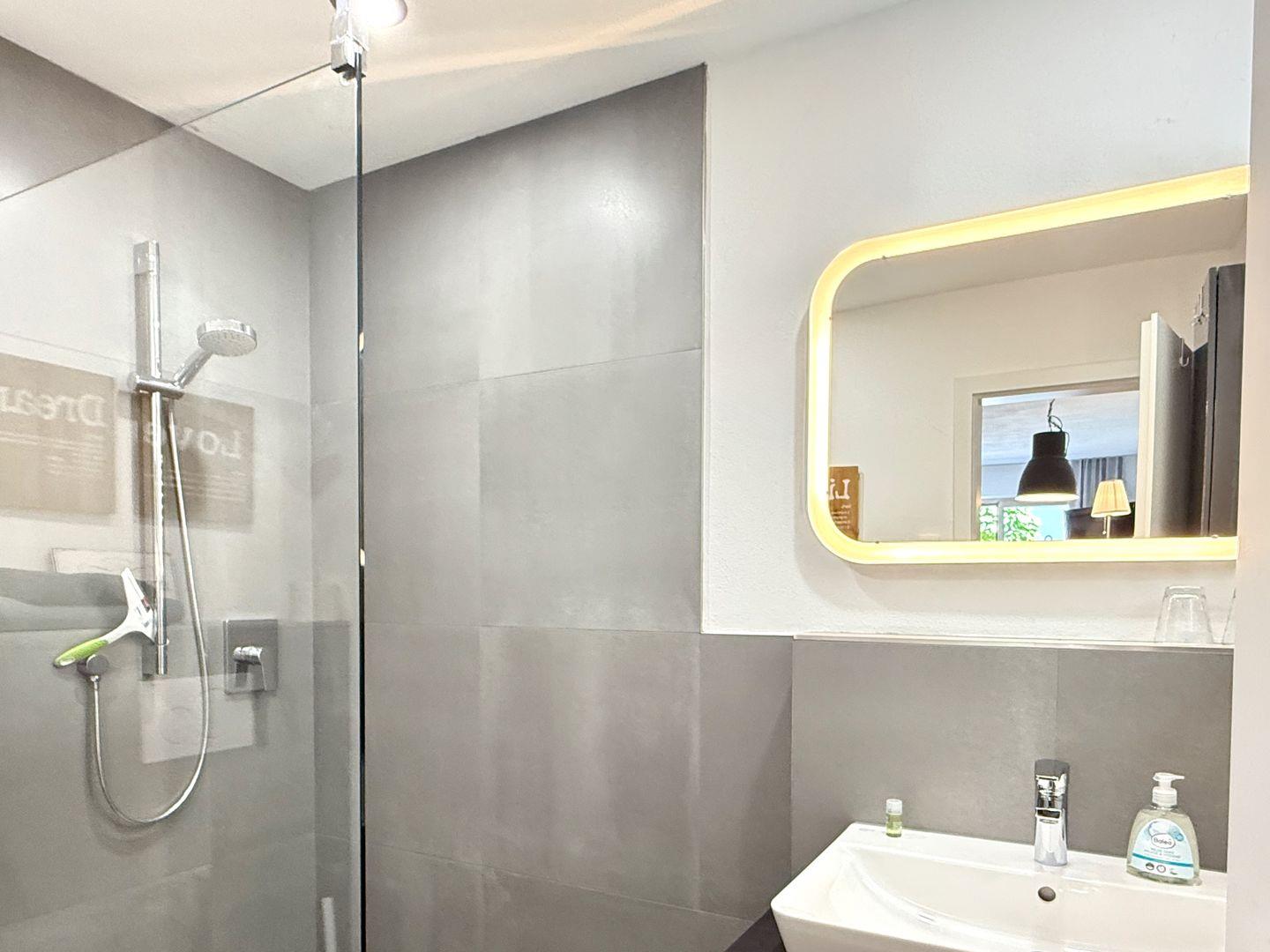 Der lichtdurchflutete Wohn- und Schlafbereich ist durchdacht gestaltet und kombiniert Komfort mit modernem Design. Ein bequemes Doppelbett (140x200 cm), ein Essplatz und eine gut ausgestattete Küchenzeile sorgen für entspannte Urlaubstage. Das helle Badezimmer verfügt über eine bodengleiche Dusche und hochwertige Ausstattung.