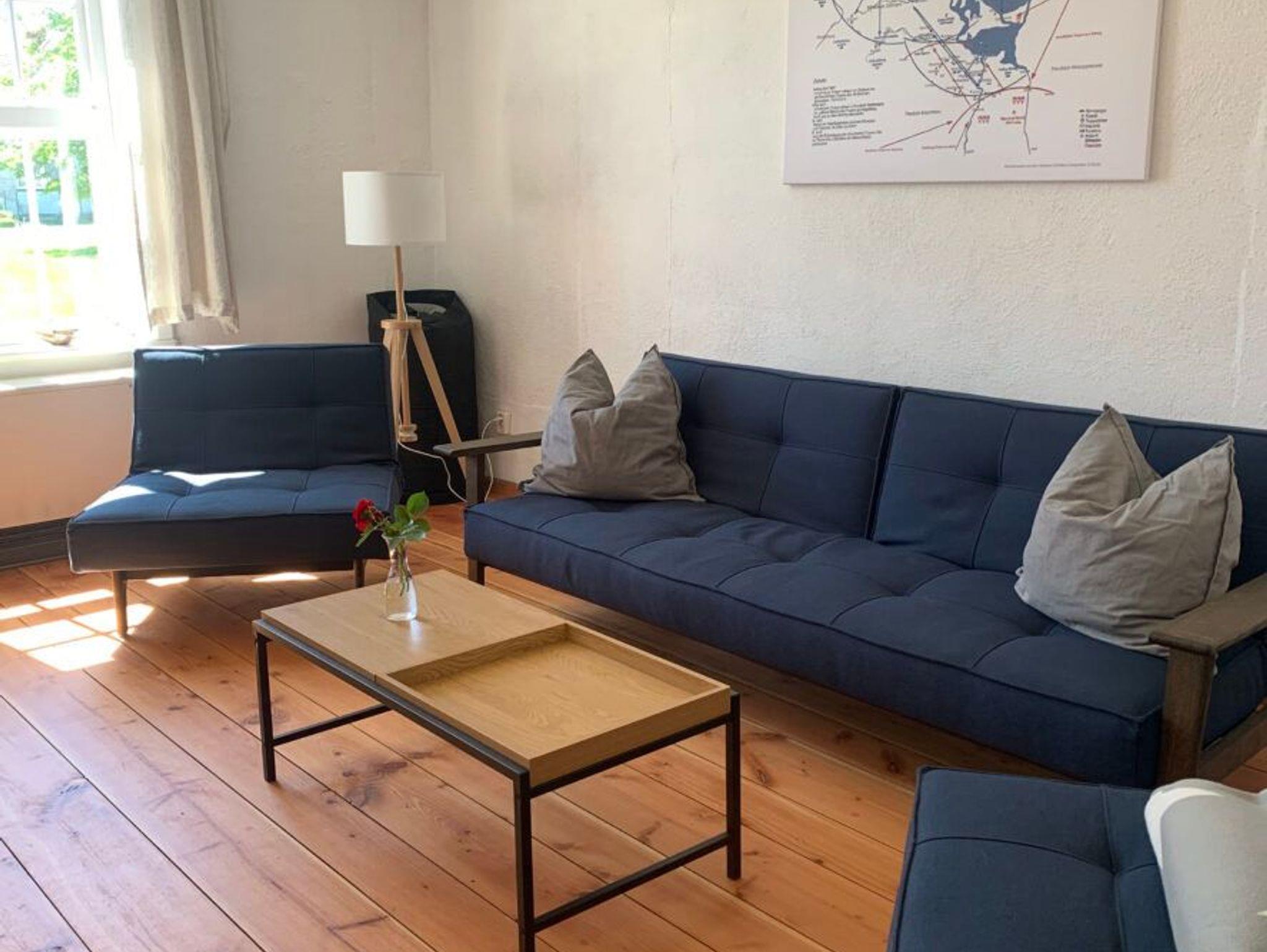 Die Fewo 2 besteht aus einem geräumigen Wohnzimmer mit offener Küche, hohen Decken, großen Fenstern und alten Holzdielen sowie einem Schlafzimmer mit Queensize-Doppelbett und einem Bad mit Dusche und WC. Die voll ausgestattete Küche bietet viel Platz für gemeinsames und kommunikatives Kochen. In dieser Wohnung können 2 Personen im Schlafzimmer und 2 Personen im Wohnzimmer auf einem breiten, gemütlichem Sofa mit Topper übernachten. So ist die Wohnung für 4 Personen geeignet.