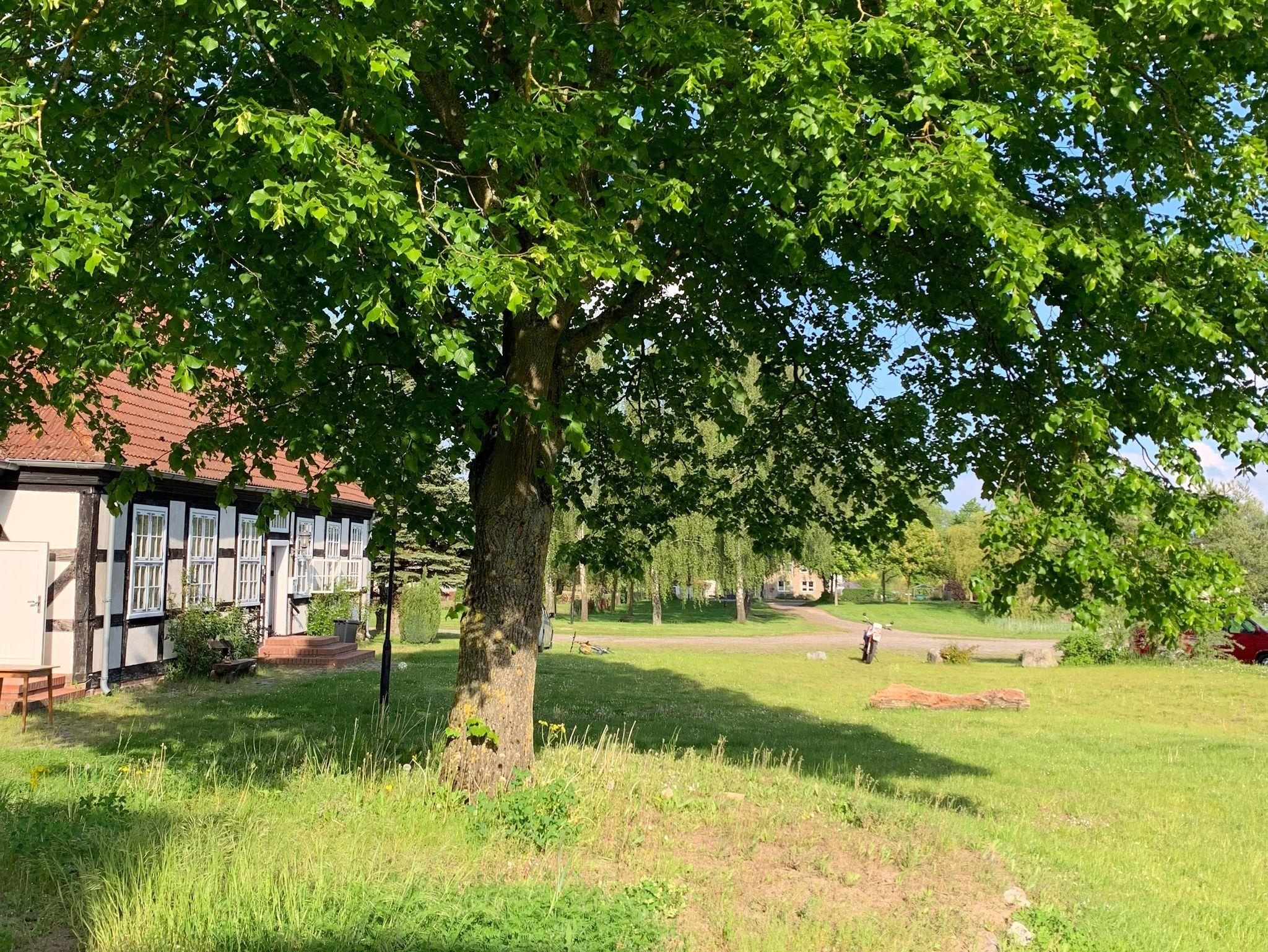 Das Gutshaus und die zwei Fachwerkhäuser stehen auf einem fußballfeldgroßen Grundstück im Ortszentrum von Schlatkow.