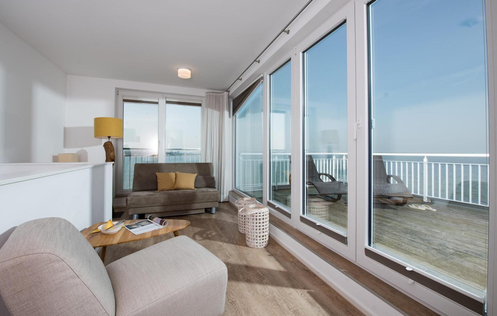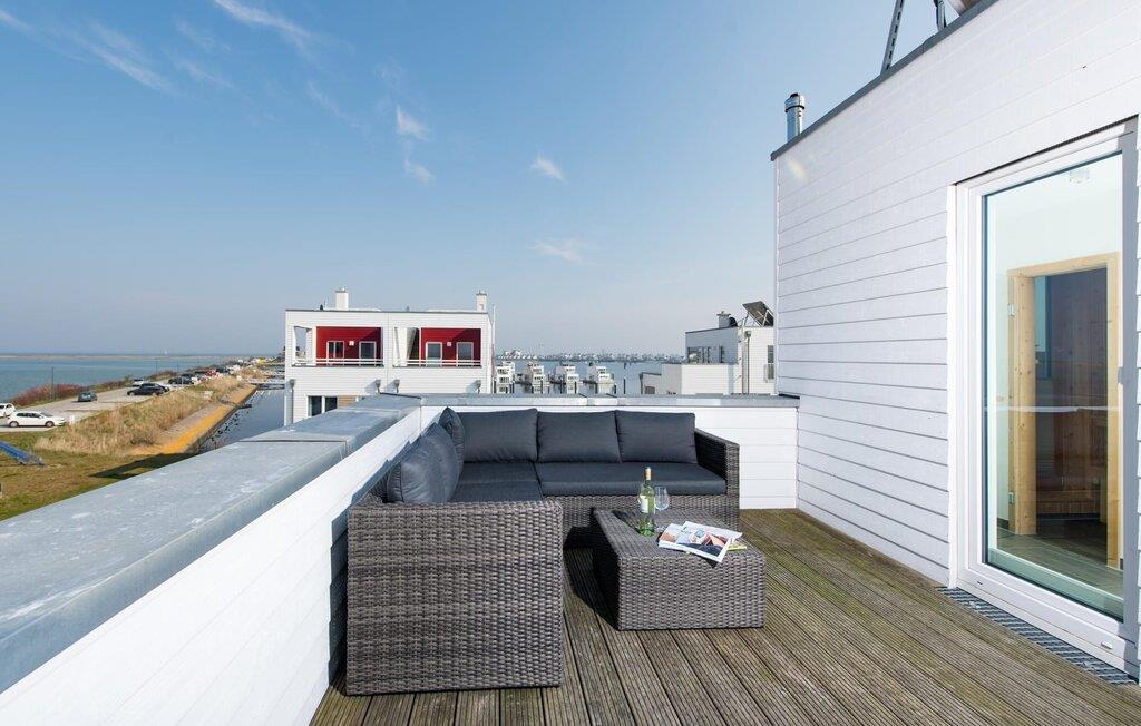 Et niveau højere ligger studioet, et ekstra opholdsrum med panoramaudsigt, et arbejdsområde og en komfortabel sovesofa til to. Den komplette wellnessoplevelse inkluderer en sauna med tilhørende bruser. Studioets tagterrasse fuldender afslapningsoplevelsen og lægger op til at solbade og nyde romantiske solnedgange efter en saunatur.