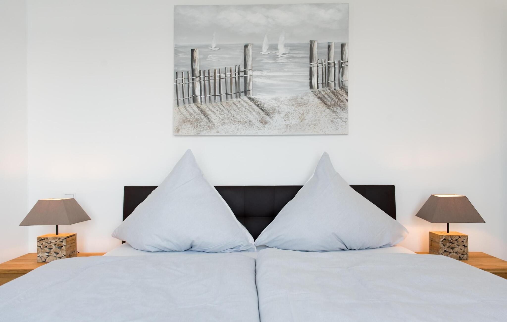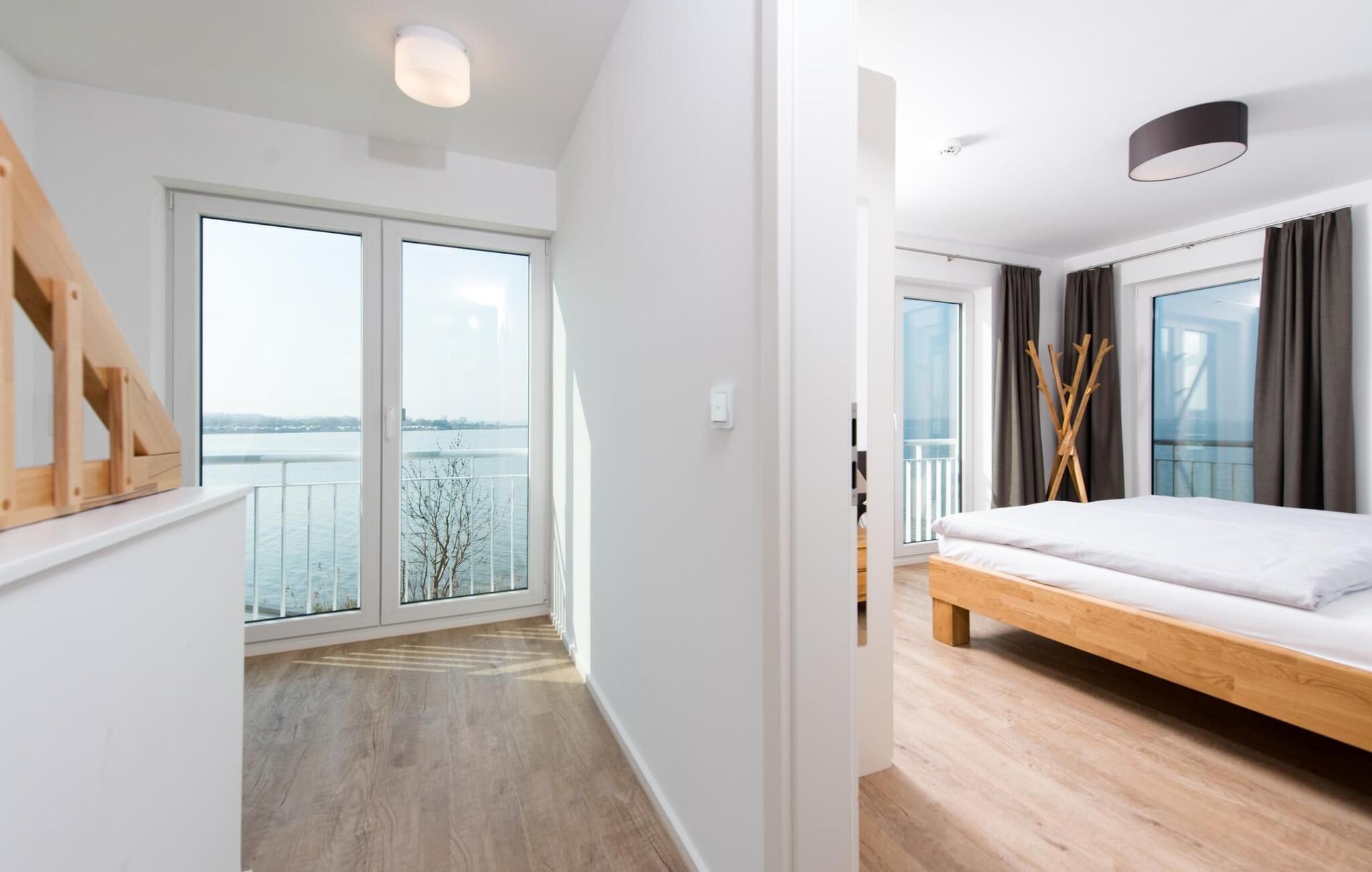 På første sal er der to soveværelser med udsigt over vandet, det ene ud mod Slien og det andet mod havnen. Mens soveværelset med udsigt over Sli-fjorden har en dobbeltseng, kan de to enkeltsenge i det andet soveværelse, som også har et tv, nemt skubbes sammen. Mørklægningsgardiner i begge soveværelser giver varmeisolering. Et fuldt udstyret badeværelse på denne etage tilbyder afslapningsmomenter, da spabadet også har uhindret udsigt over Slien.