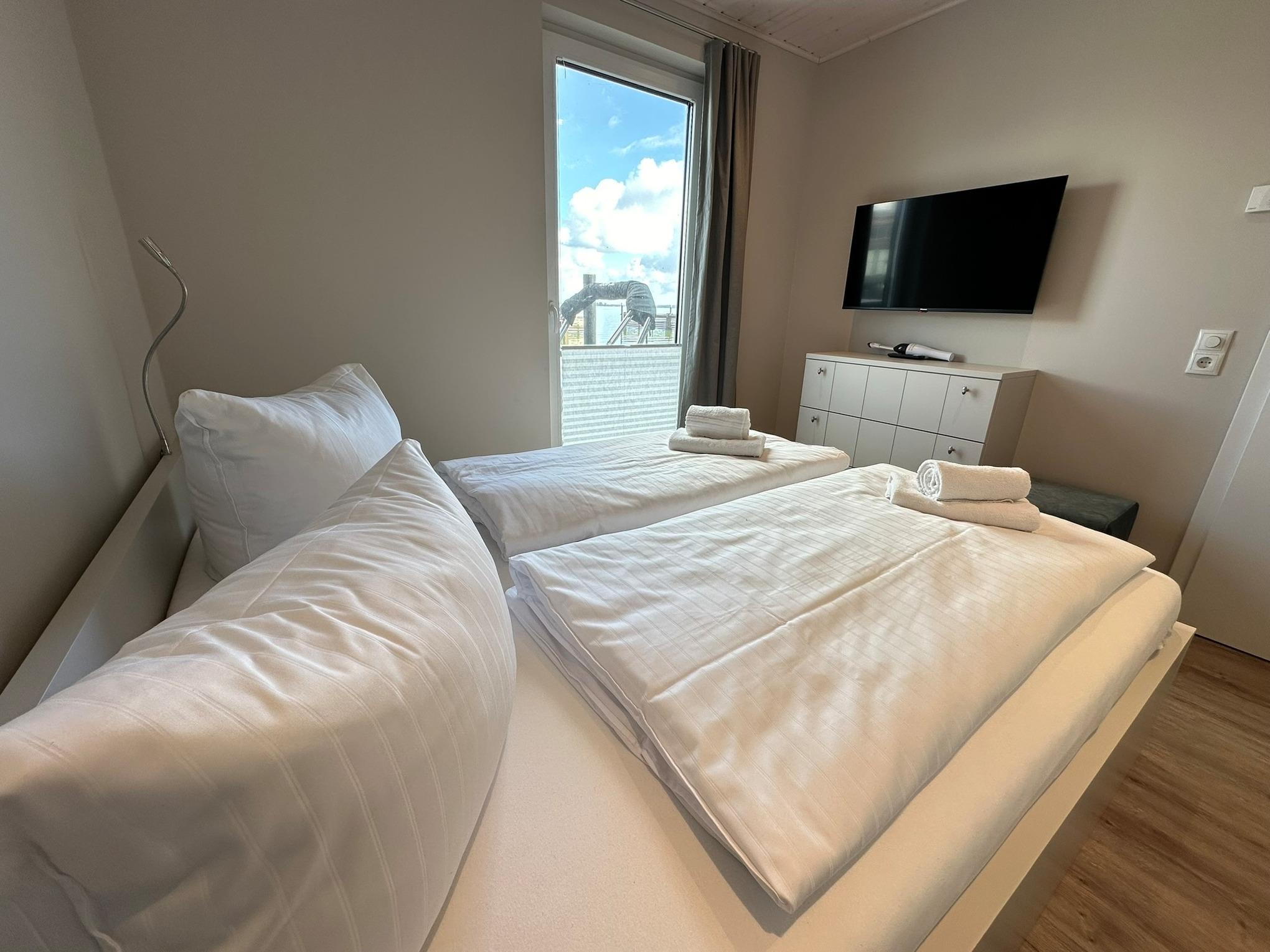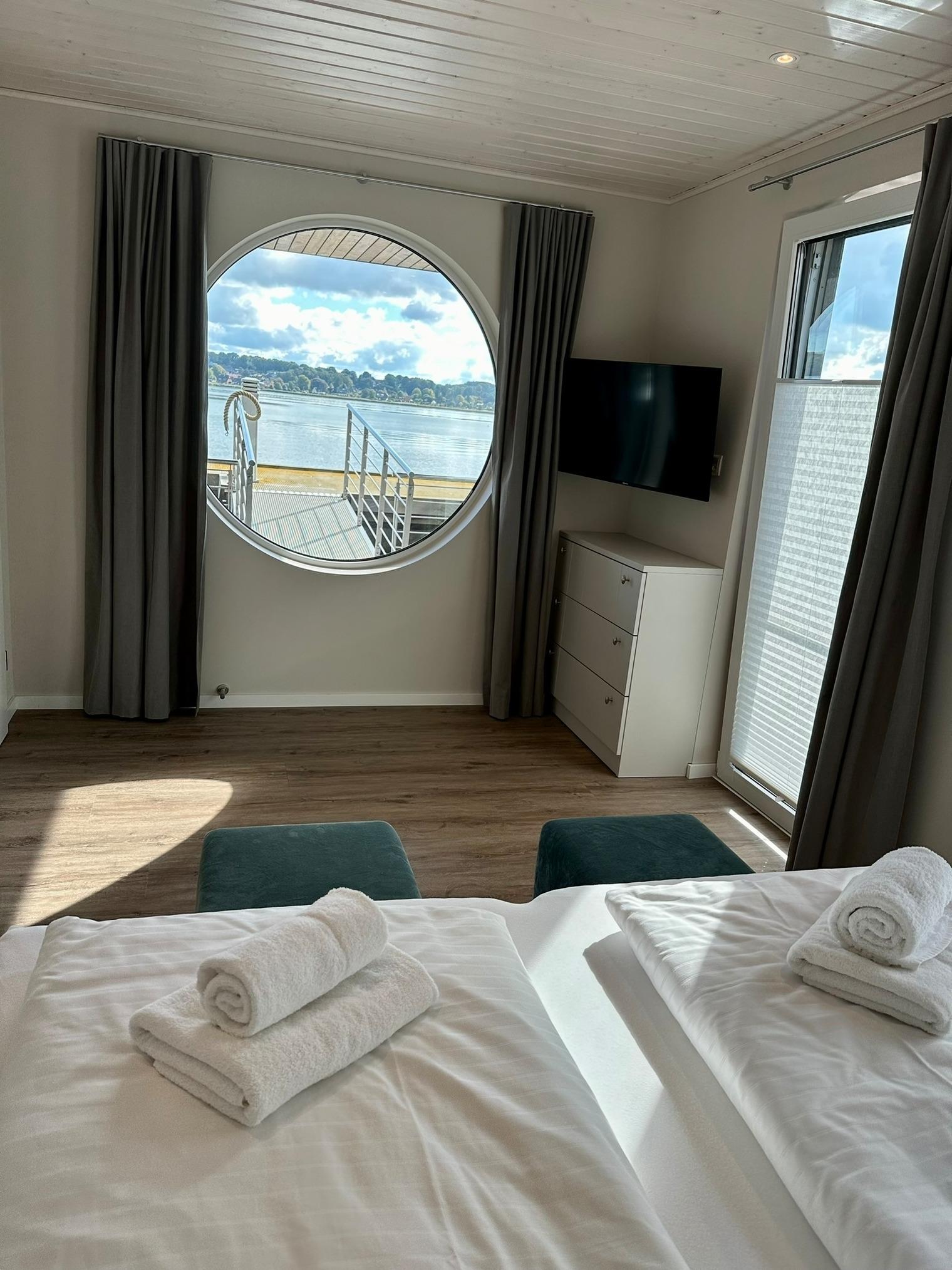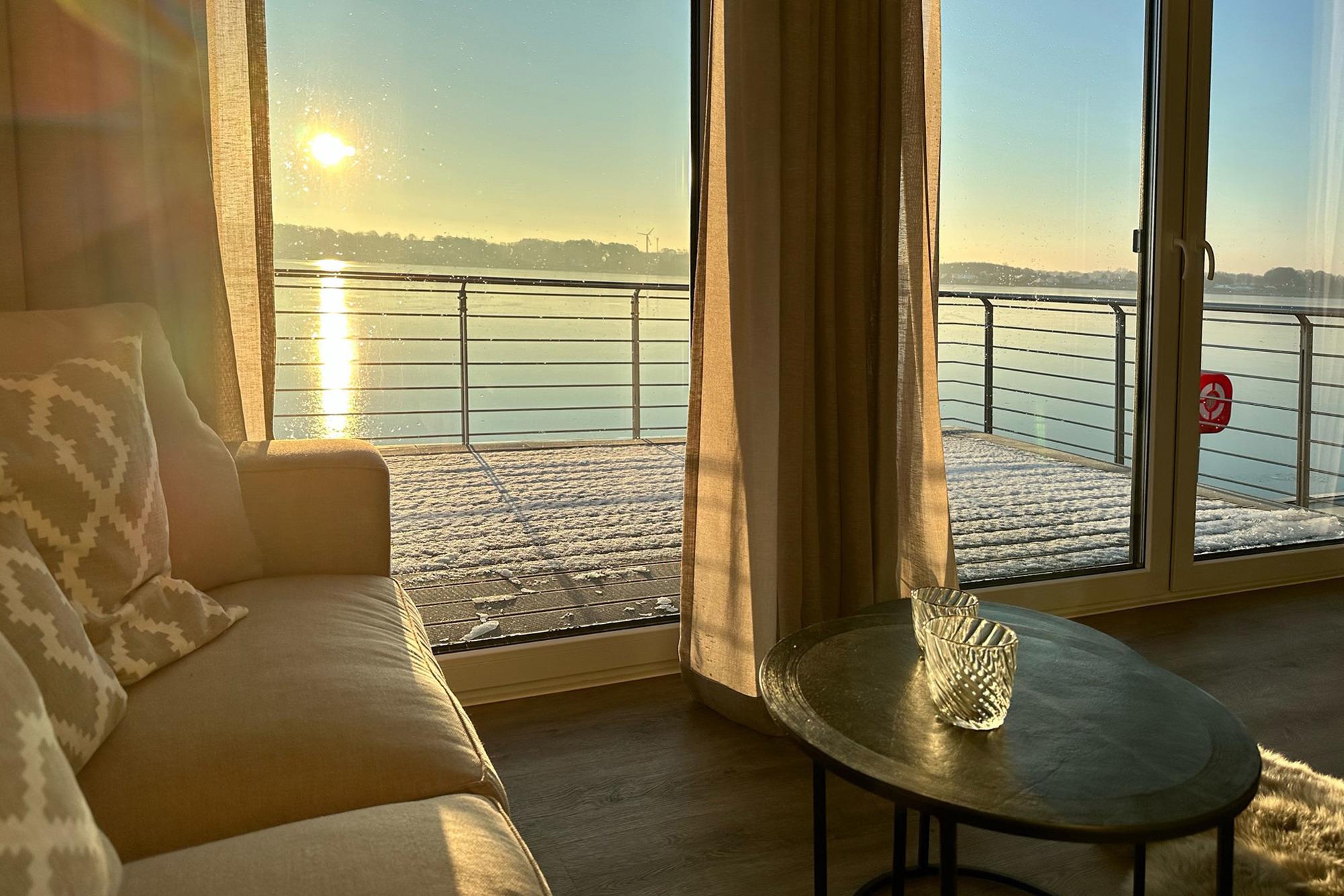 Einzigartiger Urlaub auf dem Wasser – Wasserhaus Schlei – Im historischen Pionierhafen Schleswig erwartet Sie ein schwimmendes Feriendomizil mit ca. 150 qm Wohnfläche für bis zu 6 Personen. Genießen Sie Wasserblick in erster Reihe, einen großzügigen Wohnbereich, Sonnendeck, Kamin, Fußbodenheizung, eine voll ausgestattete Küche sowie zahlreiche Extras