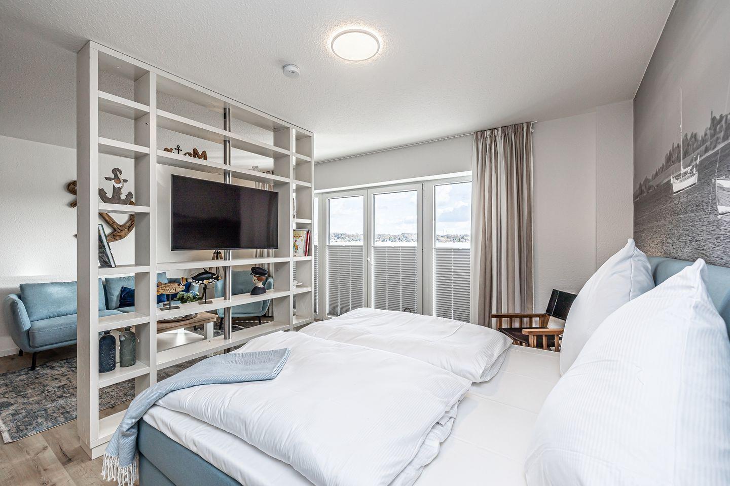 Mit direktem Wasserblick und in einzigartiger Lage direkt an der Schlei bietet die „Schlei-Koje 4“ am Pionierhafen Schleswig den perfekten Ort für Ihren Urlaub. Die Ferienwohnung im 1. OG bietet auf ca. 45m² einen offenen Wohn- und Essbereich mit Küche und angrenzendem offenen Schlafzimmer, ein Badezimmer und einen Balkon. Die vollausgestattete Küche lässt keine Wünsche offen und im Wohnzimmer können Sie Ihre Urlaubstage auf dem Sofa vor dem Smart-TV ausklingen lassen. Das Schlafzimmer bietet ein gemütliches Doppelbett (180x200cm) sowie Verdunklungsmöglichkeiten für erholsame Nächte. In dem Badezimmer finden Sie einen Föhn und eine Dusche vor. Auf dem Balkon können Sie sich entspannen und an lauen Abenden Ihre Urlaubstage ausklingen lassen. Ein eigener Parkplatz steht Ihnen direkt vor dem Haus zur Verfügung. Ihre Fahrräder können Sie im offenen gemeinschaftlich genutzten Fahrradraum unterstellen. Im Erdgeschoss steht eine Waschmaschine zur gemeinschaftlichen Nutzung kostenfrei für Sie zur Verfügung. Am Pionierhafen wird Wert auf Nachhaltigkeit gelegt, daher wird 77 % der Energie durch Erdwärme bezogen. Durch die einzigartige Lage am Ostseefjord Schlei kann auch ein Boot mitgebracht und auf einem Liegeplatz gegen Gebühr direkt am Pionierhafen angelegt werden. Bitte sprechen Sie uns hierfür an.