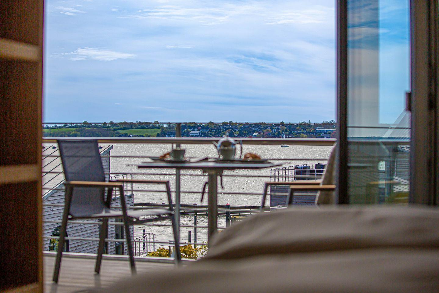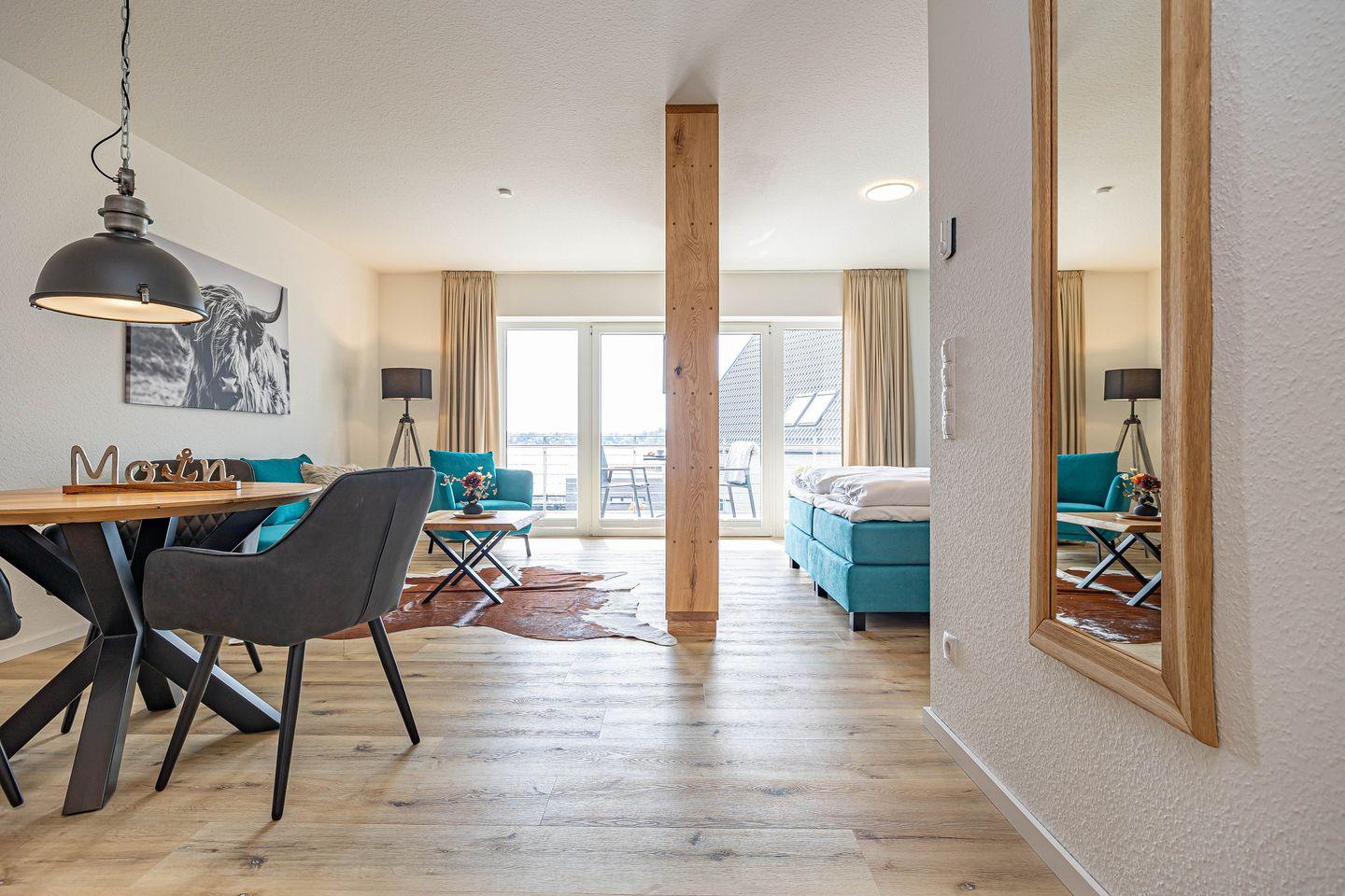 Das barrierearme Studio-Apartment "Wiking-Koje 7" am Pionierhafen in Schleswig bietet auf 45m² mit hochwertiger Einrichtung offen gestaltet einen Wohn- und Essbereich mit angrenzender Küche, ein Boxspring Doppelbett, ein Badezimmer mit bodengleicher Dusche und einen Balkon mit beeindruckendem Blick über den Ostseefjord Schlei. Über einen Aufzug ist die Wohnung im 2. OG erreichbar. Eine Parkfläche, Fahrradunterstellmöglichkeiten und E-Ladestationen stehen zur Verfügung.