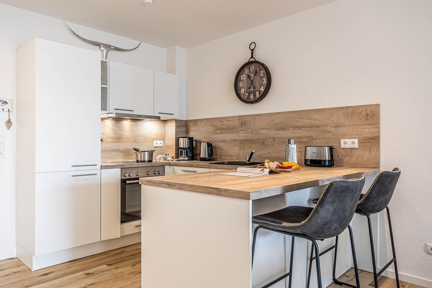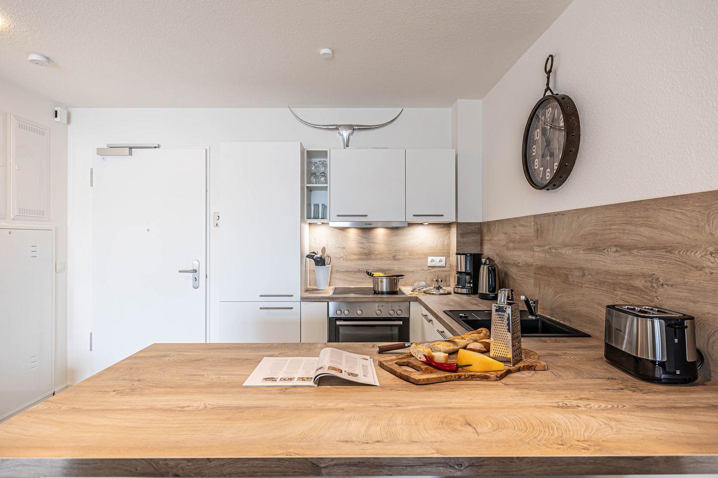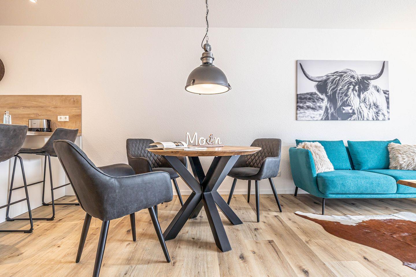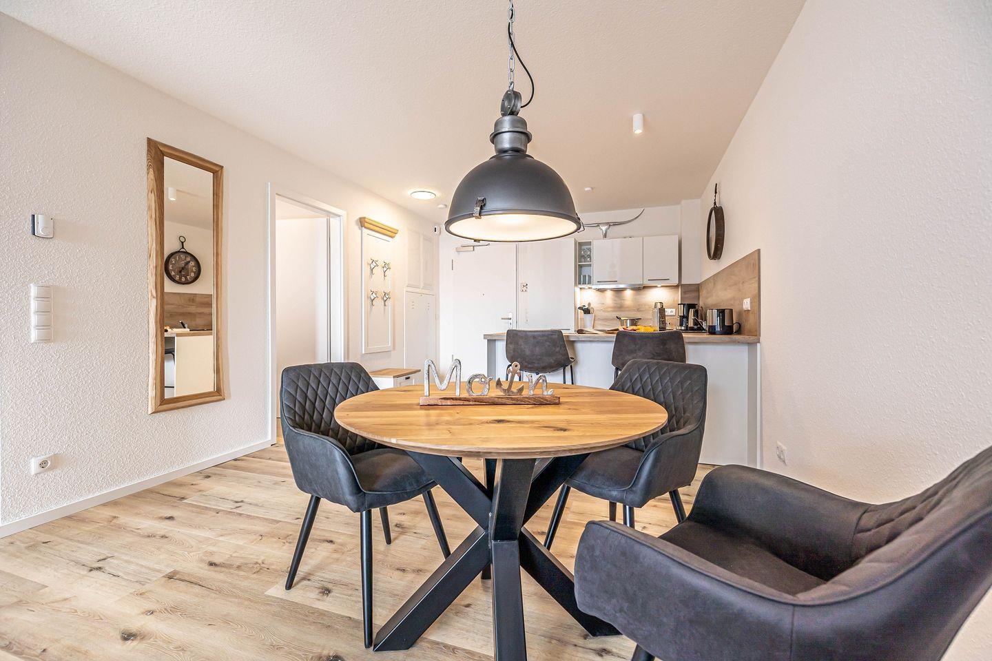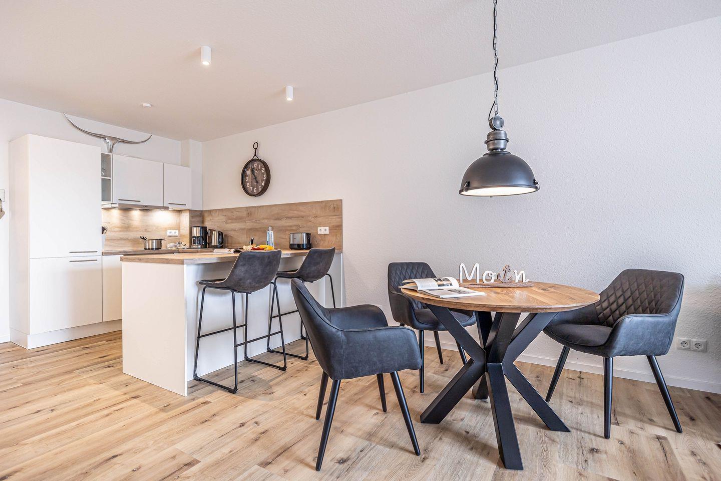 Das Apartment verfügt über ein einladendes Wohnzimmer, das durch seine offene Gestaltung zur Küche eine entspannte Atmosphäre ausstrahlt. Genießen Sie gemütliche Abende auf dem komfortablen Sofa oder einem Abendessen am Esstisch, der genügend Platz für gesellige Stunden bietet. Für Ihre Unterhaltung sorgt ein digitaler TV-Anschluss, und auch WLAN ist kostenfrei für Sie verfügbar.