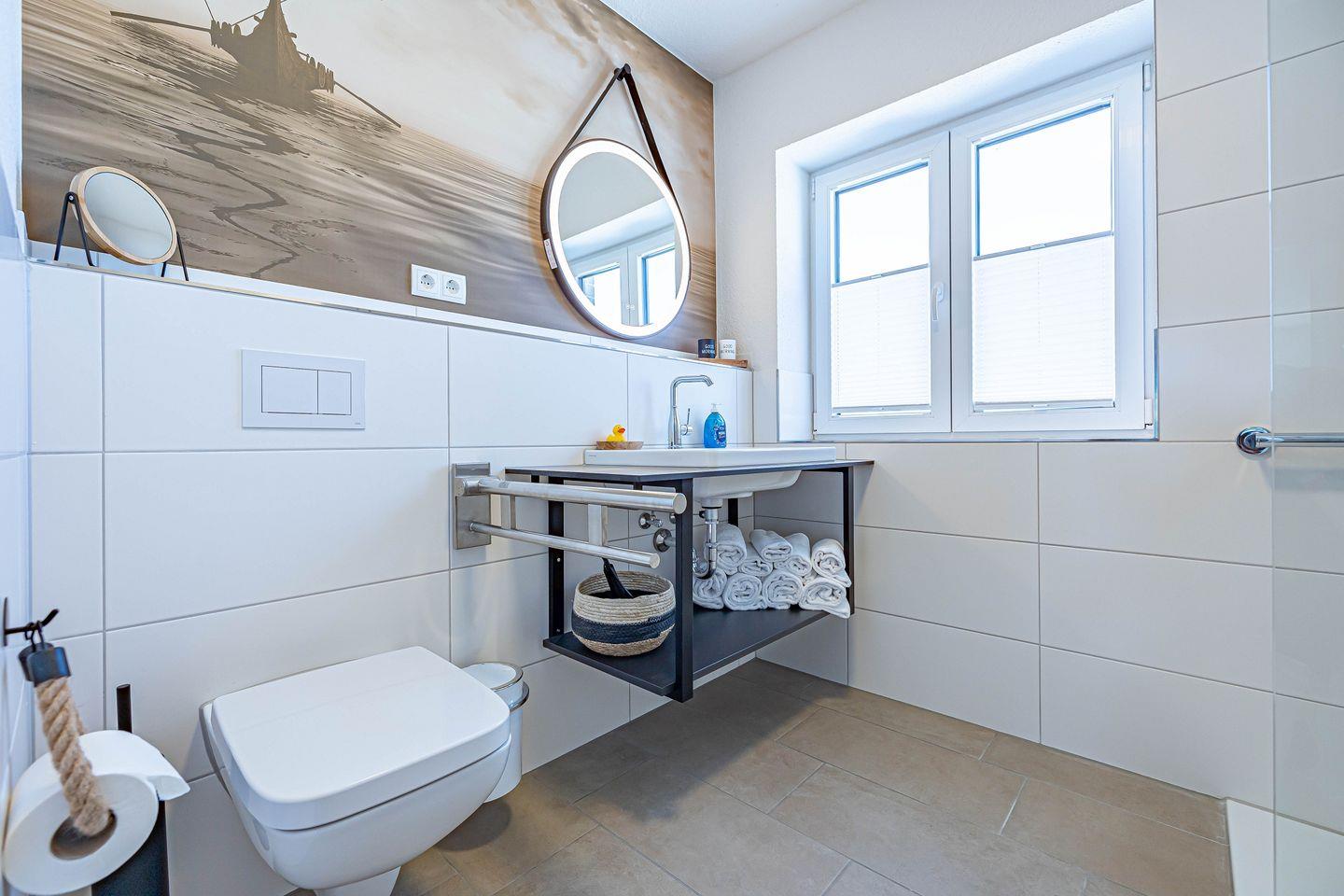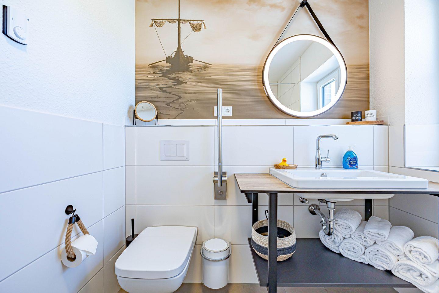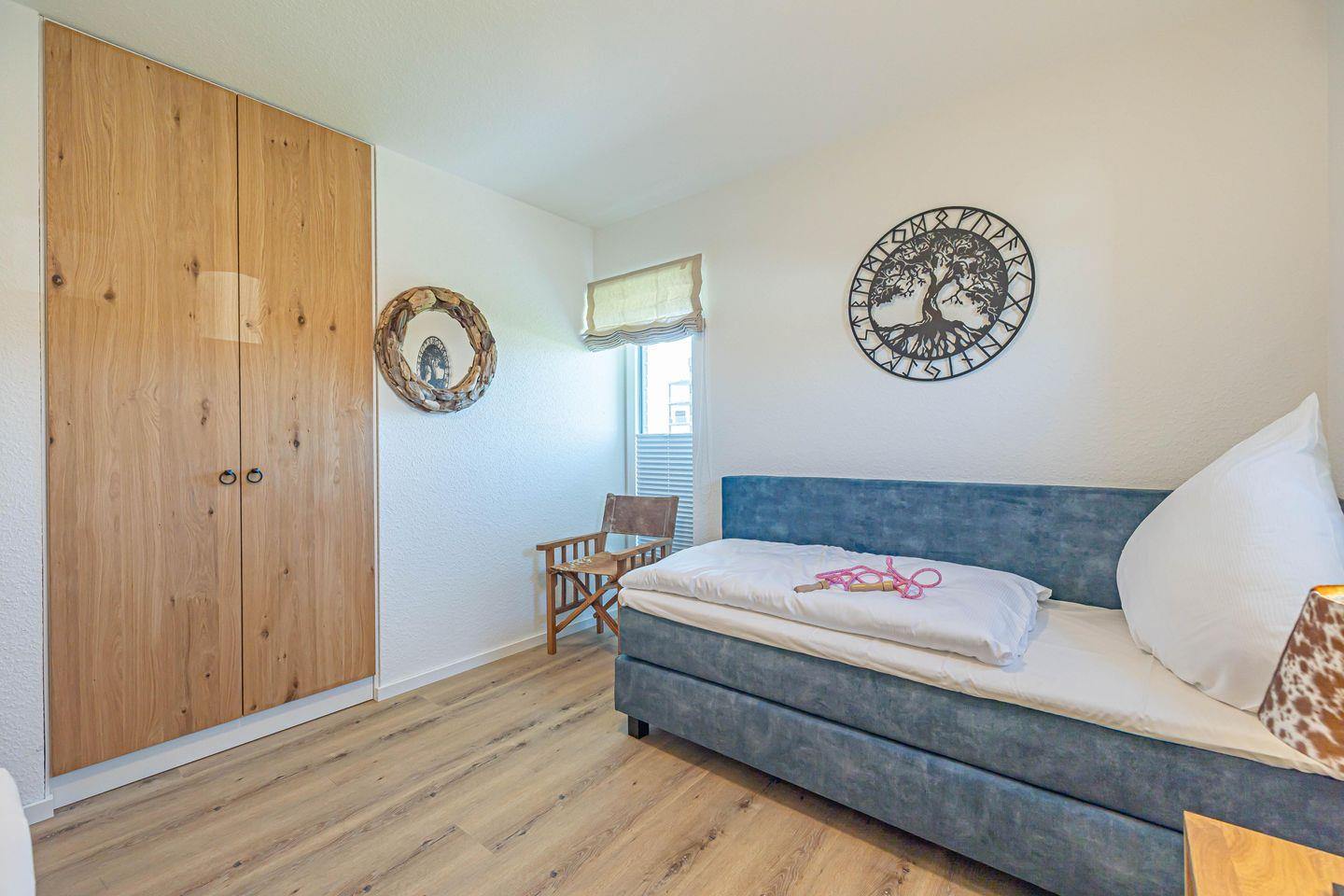 Zwei Schlafzimmer bieten jeweils ein gemütliches Boxspring Doppelbett (180x200cm) sowie eine Verdunkelungsmöglichkeit für erholsame Nächte. Das Badezimmer ist modern gestaltet und bietet eine bodengleiche Dusche mit Haltegriff, sowie eine Fußbodenheizung, die für zusätzlichen Komfort sorgt. Ebenfalls stehen ein Kosmetikspiegel und Föhn bereit. Eine Waschmaschine steht zur gemeinschaftlichen Nutzung im Nachbarhaus zur Verfügung, damit Sie auch bei längeren Aufenthalten immer frisch gewaschene Kleidung haben. Durch die einzigartige Lage am Ostseefjord Schlei kann auch ein Boot mitgebracht und auf einem Liegeplatz gegen Gebühr direkt am Pionierhafen angelegt werden. Bitte sprechen Sie uns hierfür an.