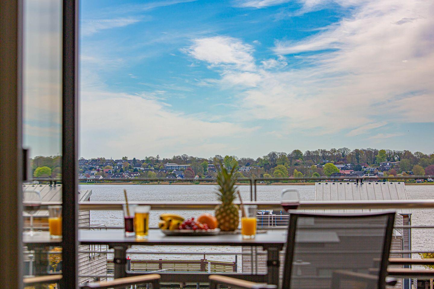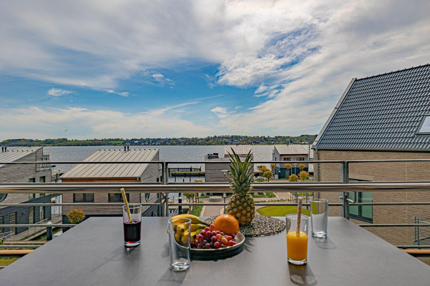 Die barrierearme Ferienwohnung "Wiking-Koje 8" am Pionierhafen in Schleswig bietet auf 74 m² mit hochwertiger Einrichtung offen gestaltet einen Wohn- und Essbereich mit angrenzender Küche, zwei Schlafzimmer mit Boxspring Doppelbetten, ein Badezimmer mit bodengleicher Dusche und einen Balkon mit beeindruckendem Blick über den Ostseefjord Schlei. Über einen Aufzug ist die Wohnung im 2. OG erreichbar. Eine Parkfläche, Fahrradunterstellmöglichkeiten und E-Ladestationen stehen zur Verfügung.