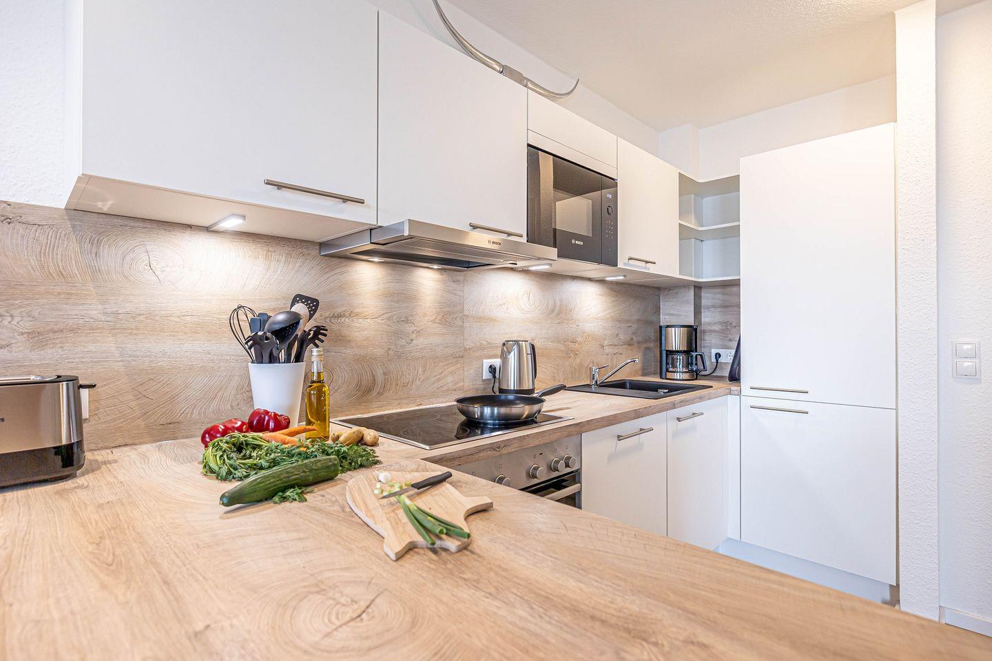 Ein besonderes Highlight der Unterkunft ist der Balkon, von dem Sie einen beeindruckenden Blick über die Umgebung genießen können – der perfekte Ort, um den Tag mit einem Kaffee zu beginnen oder abends den Sonnenuntergang zu beobachten. Die Küche ist voll ausgestattet mit modernen Geräten, darunter ein Cerankochfeld, Backofen, Mikrowelle, Kühlschrank, Spülmaschine und Kaffeemaschine, sodass Sie Ihre Lieblingsgerichte zubereiten können.