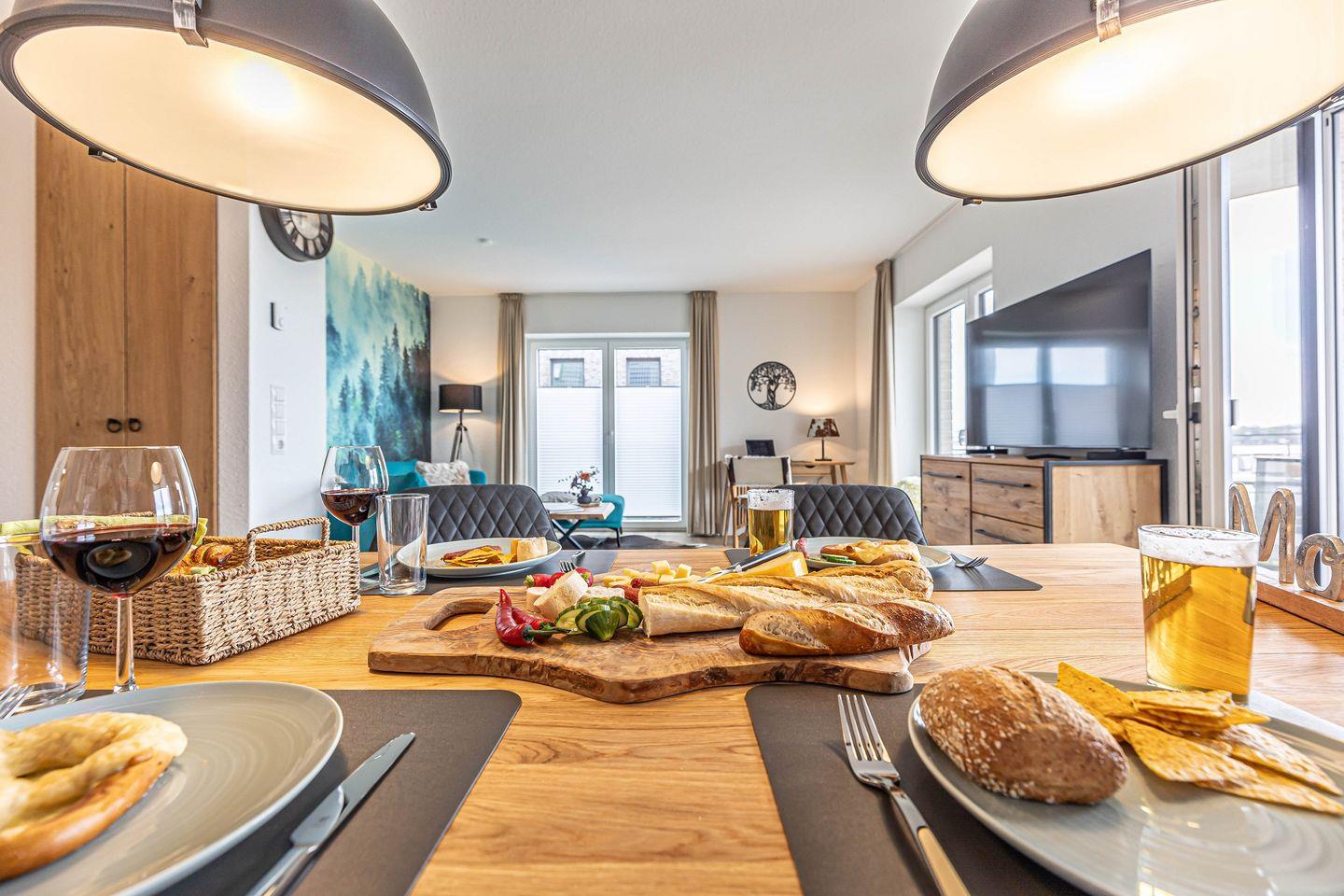 Die Wohnung verfügt über ein einladendes Wohnzimmer, dass durch seine offene Gestaltung zur Küche eine entspannte Atmosphäre ausstrahlt. Genießen Sie gemütliche Abende auf dem komfortablen Sofa oder einem Abendessen am Esstisch, der genügend Platz für gesellige Stunden bietet. Für Ihre Unterhaltung sorgt ein digitaler TV-Anschluss, und auch WLAN ist kostenfrei für Sie verfügbar.