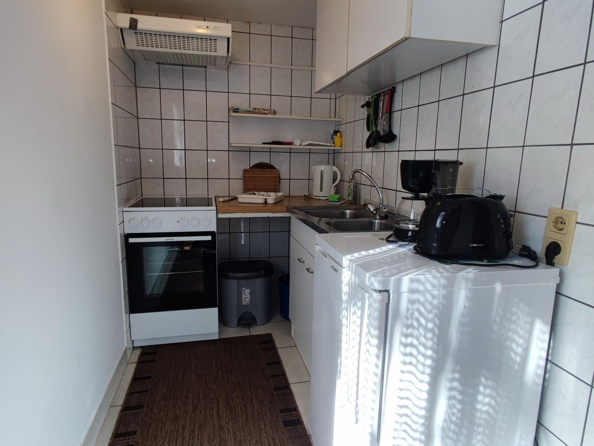 1 Schlafraum mit 1 Ehebett + 1 Schlafraum mit 2 Einzelbetten, Wohnraum mit Kabel-TV, W-LAN kostenfrei, Bad mit Waschtisch, Dusche und WC, Küche mit Herd (50cm,4 Platten + Backofen), Kühlschrank, Spüle, Toaster, Kaffeemaschine (1x4 Filter), Wasserkocher, Besteck, Porzellan und Gläser, großzügige Terrasse.