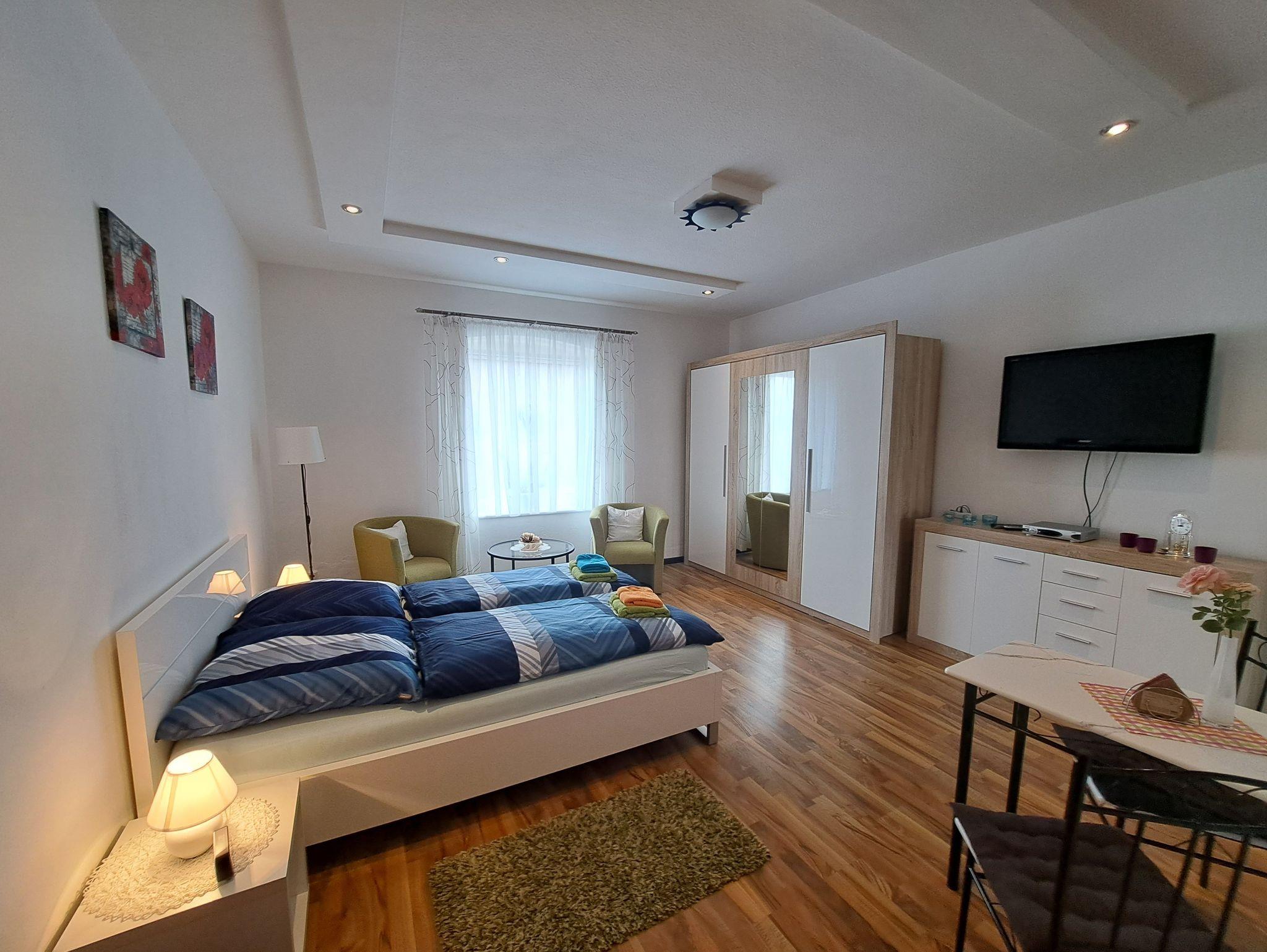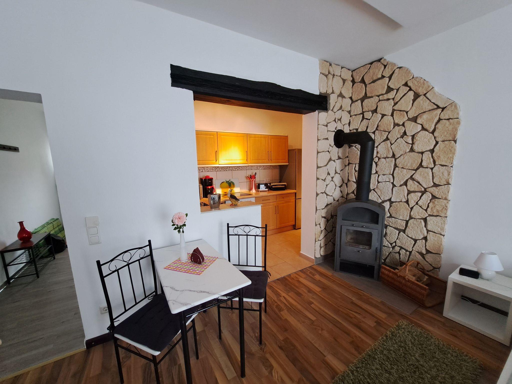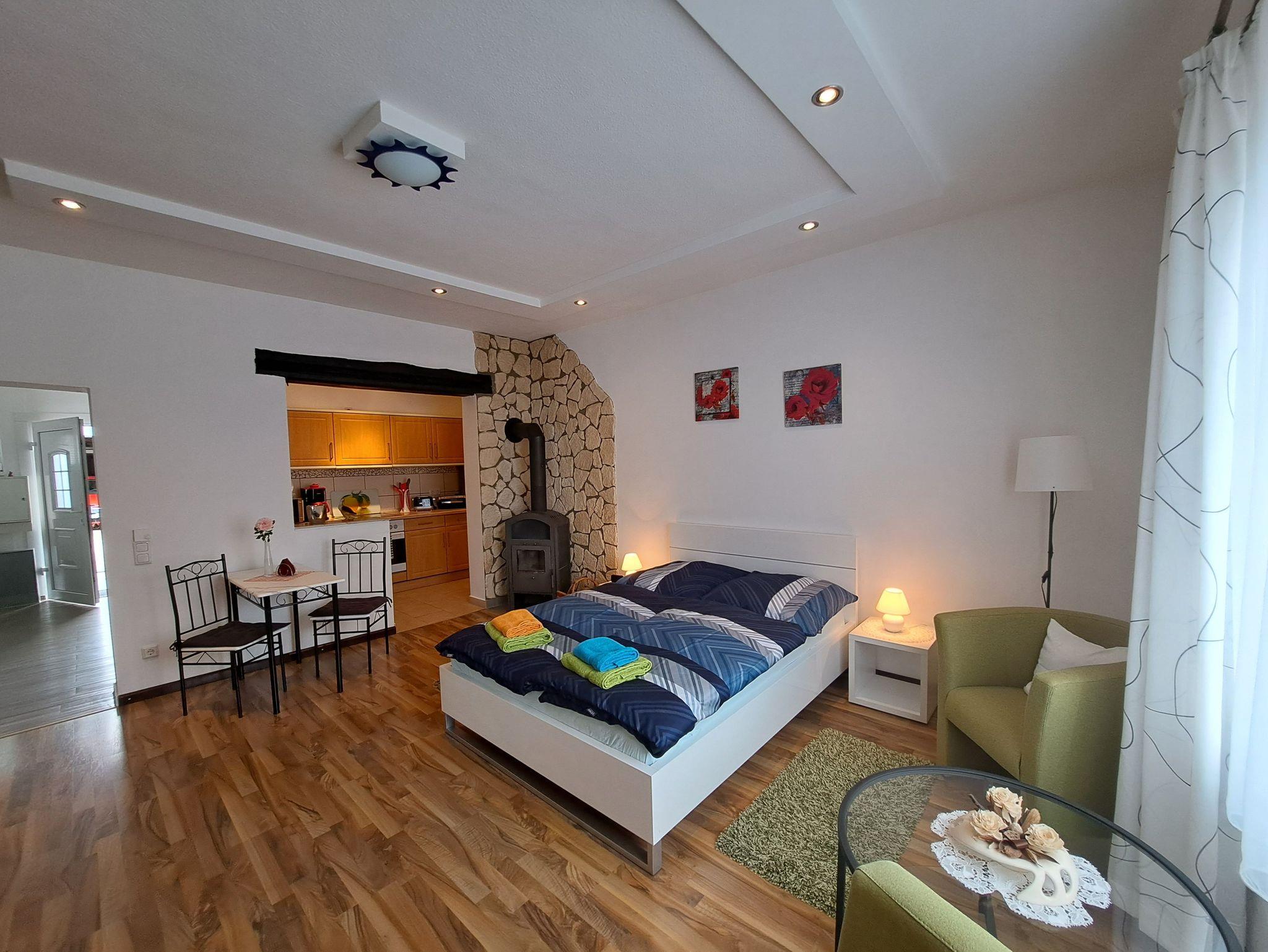 Die Ferienwohnung empfängt Sie mit großem Flur, einem Tageslicht-Badezimmer mit Dusche, Badewanne, Waschtisch und WC. Im kombinierten Wohn- und Schlafraum befindet sich ein Doppelbett mit einer 1,80 m Breite, kleinem Esstisch für 2 Personen, 2 Sessel mit Couchtisch, Kamin und Flach-TV. Eine Aufbettung (Schlafsessel) kann für ein 1 Kind bis 14 Jahre nach Absprache dazu gestellt werden. Die Einbauküche ist offen zum Wohn-Schlafraum und komplett ausgestattet. Die Ausstattung der Wohnung ist sehr gepflegt, hell und freundlich. Zur Gastgeberfamilie gehört ein kleiner Jack Russel. Für Angler steht ein Boot am Torgelower See nach Absprache zur Verfügung (kostenpfl.). Der See ist ca. 3,5 km entfernt.