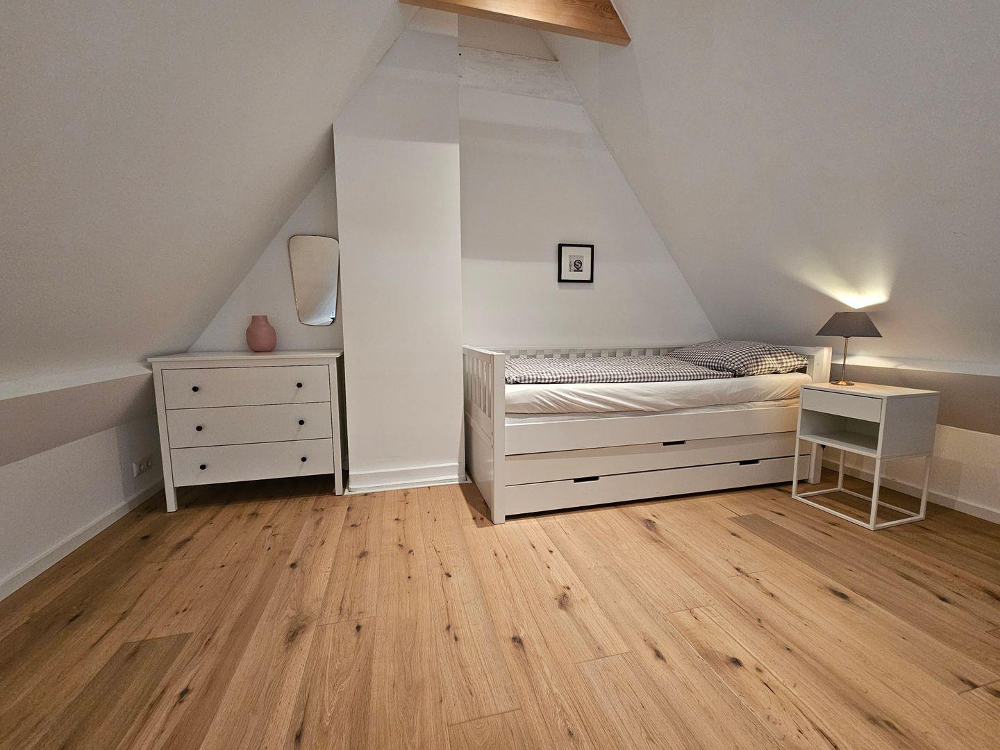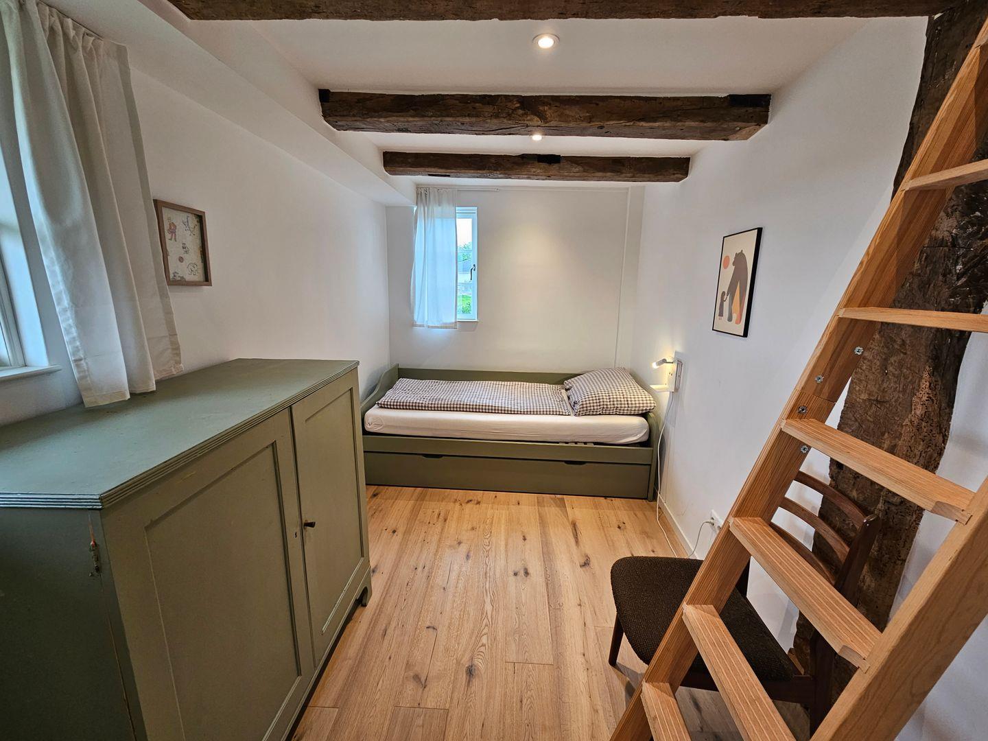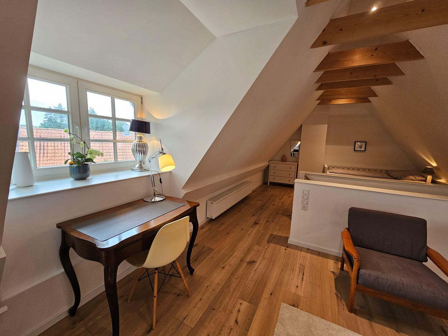 Über eine Holztreppe gelangt man in das Obergeschoß, welches zu einem weiteren offenen Wohn- und Schlafbereich ausgebaut wurde. Dänische Holzfenster und Türen runden das originalgetreue Gesamtbild dieses besonderen Objektes ab. Im Obergeschoss des Hauses befindet sich ein Fernseher (dieser verfügt lediglich über die Möglichkeit für Streamingdienste, reguläre Sender sind nicht vorhanden (kein SAT-TV, kein Kabel-TV)).