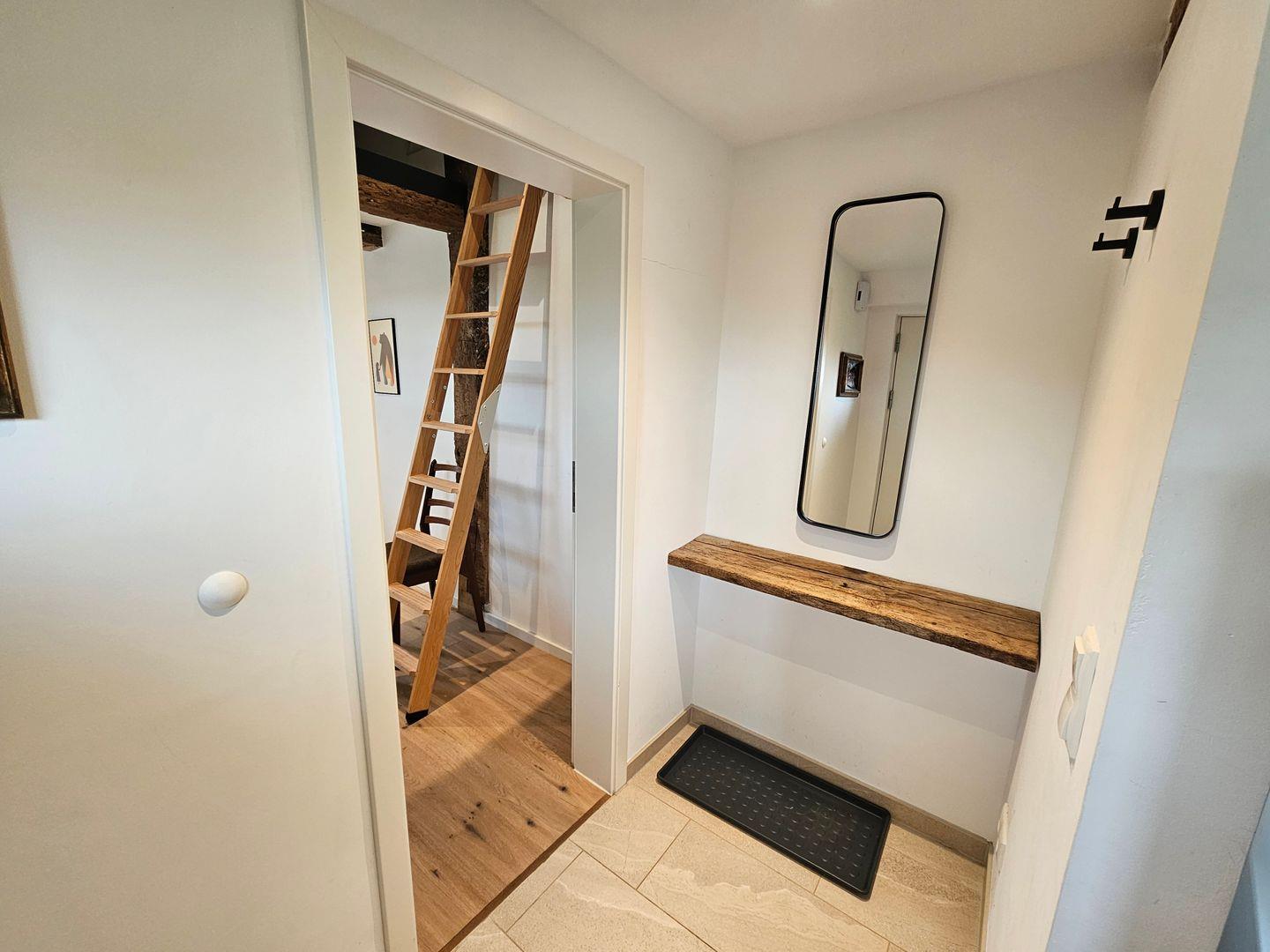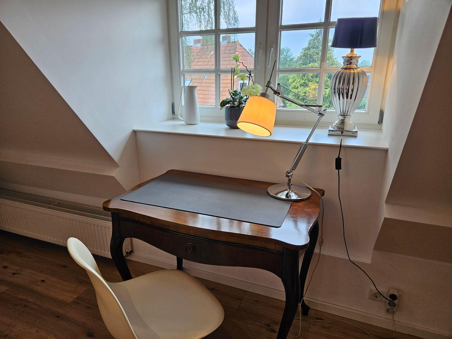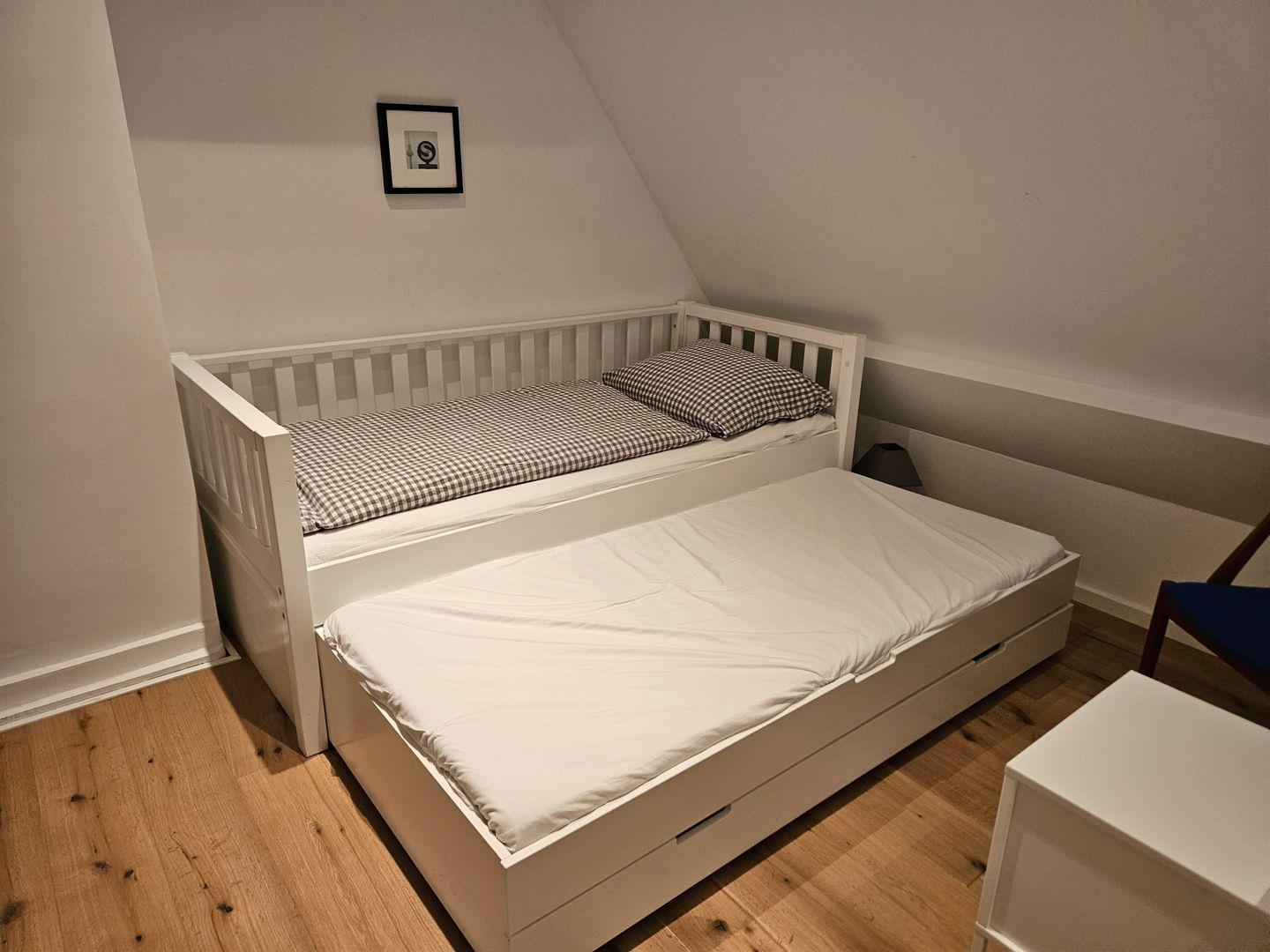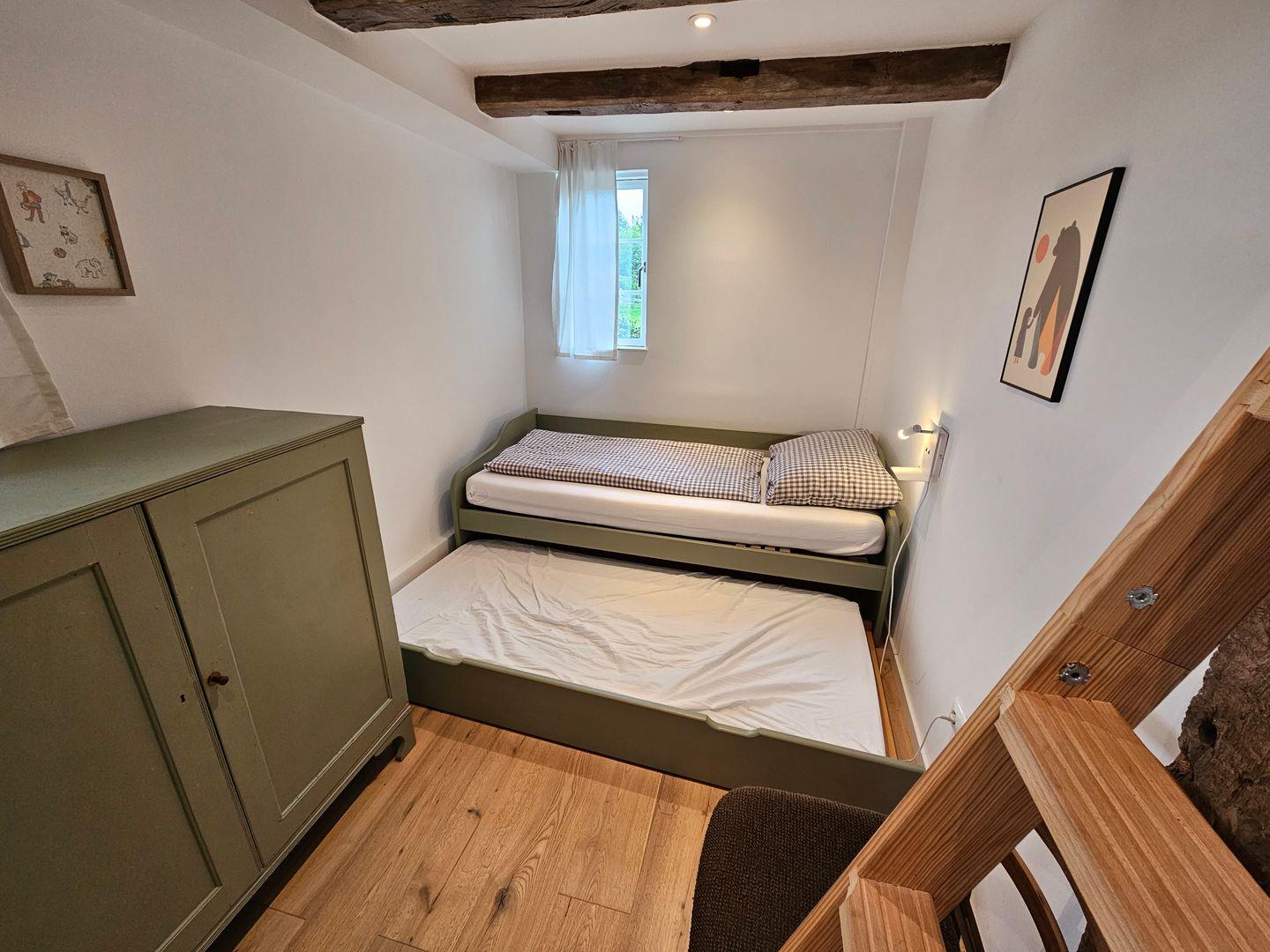 Über eine Holztreppe gelangt man in das Obergeschoß, welches zu einem weiteren offenen Wohn- und Schlafbereich ausgebaut wurde. Dänische Holzfenster und Türen runden das originalgetreue Gesamtbild dieses besonderen Objektes ab. Im Obergeschoss des Hauses befindet sich ein Fernseher (dieser verfügt lediglich über die Möglichkeit für Streamingdienste, reguläre Sender sind nicht vorhanden (kein SAT-TV, kein Kabel-TV)).