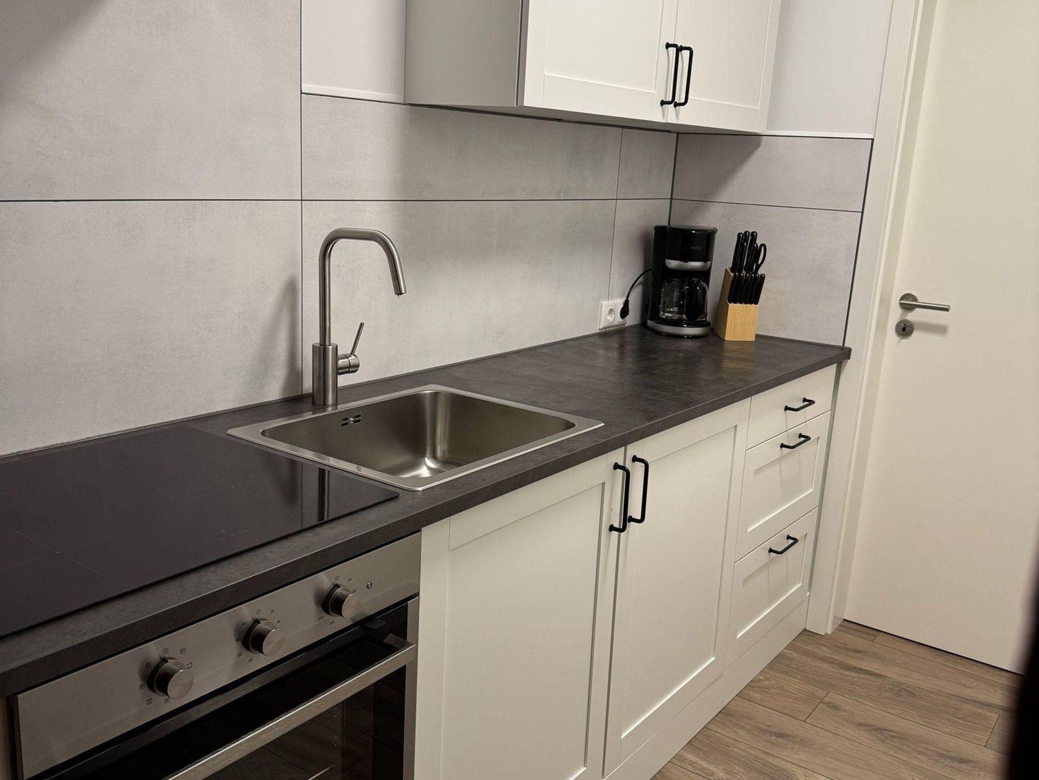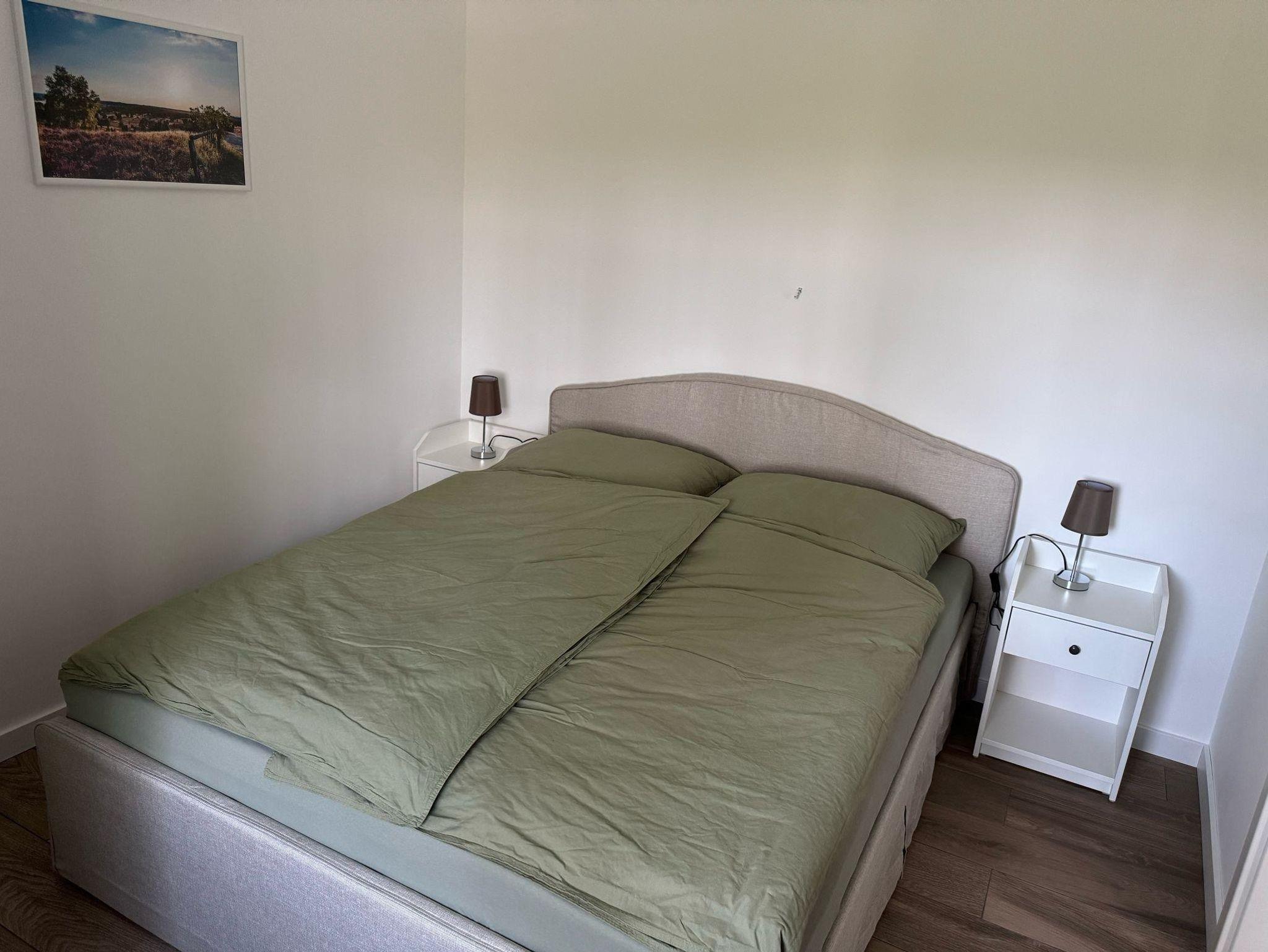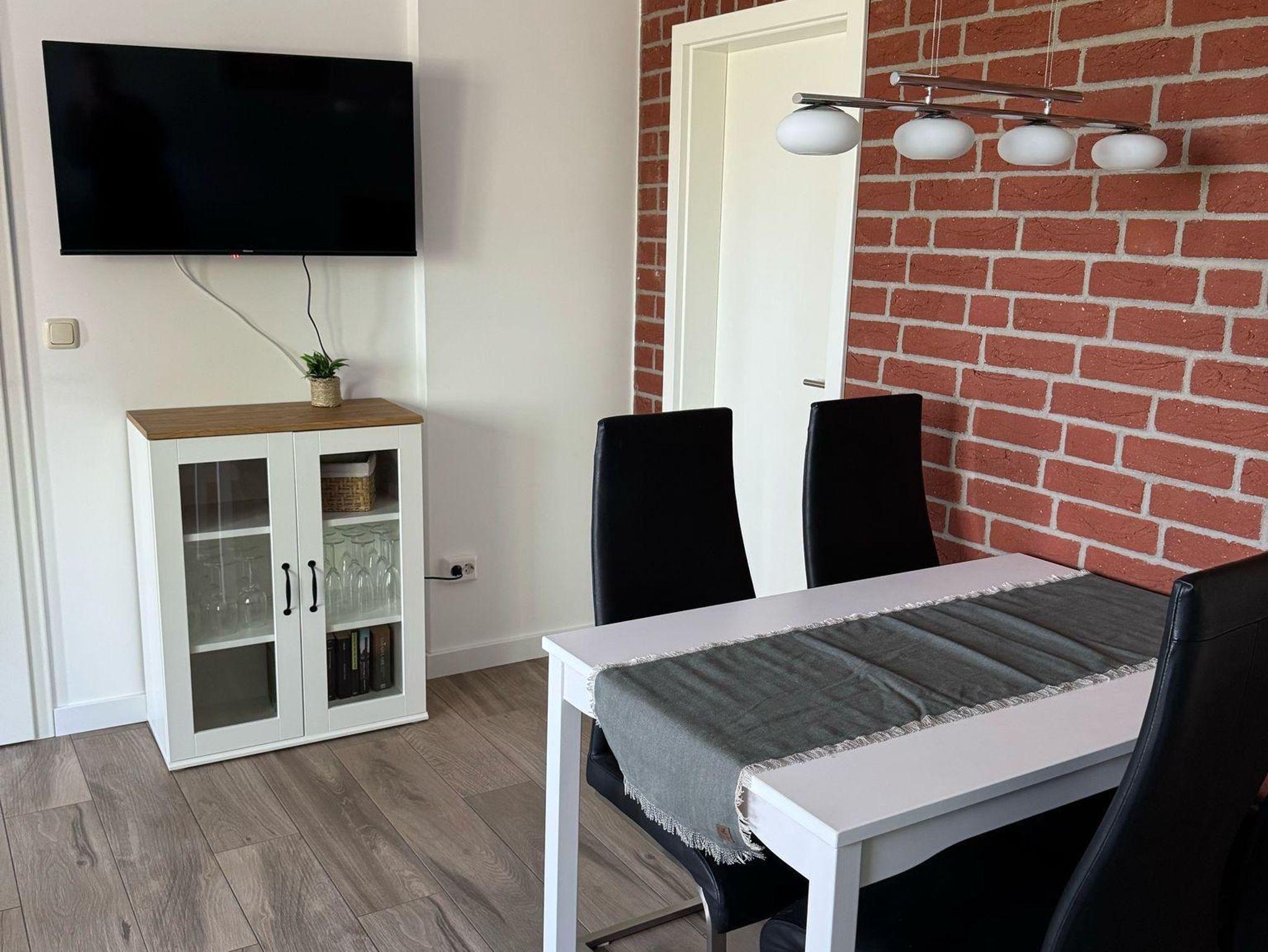 Die hell und modern eingerichtete Ferienwohnung verfügt über eine Wohnküche mit Essgelegenheit, zwei Schlafzimmer mit Doppelbetten sowoe ein Bad mit Dusche und WC.