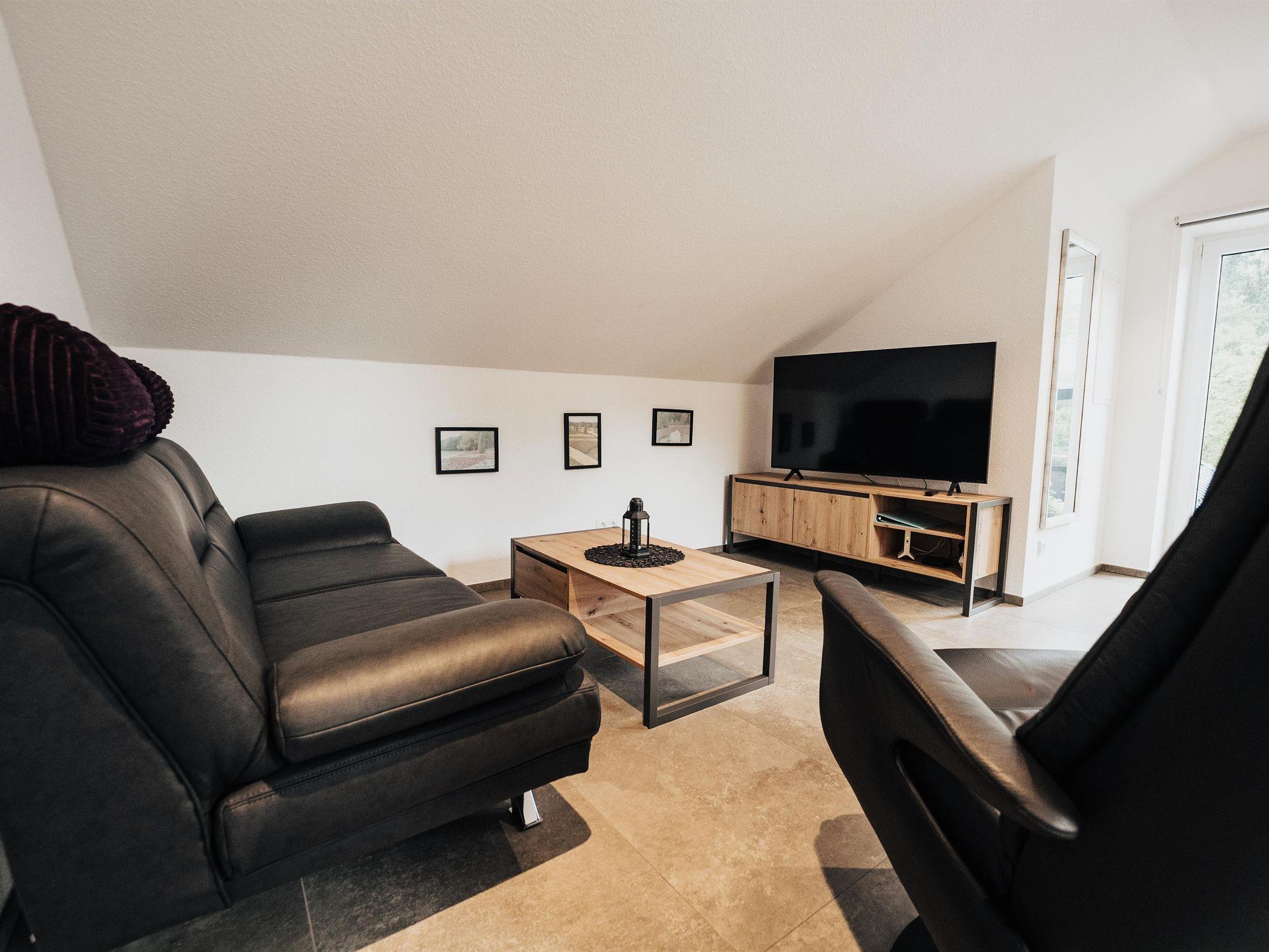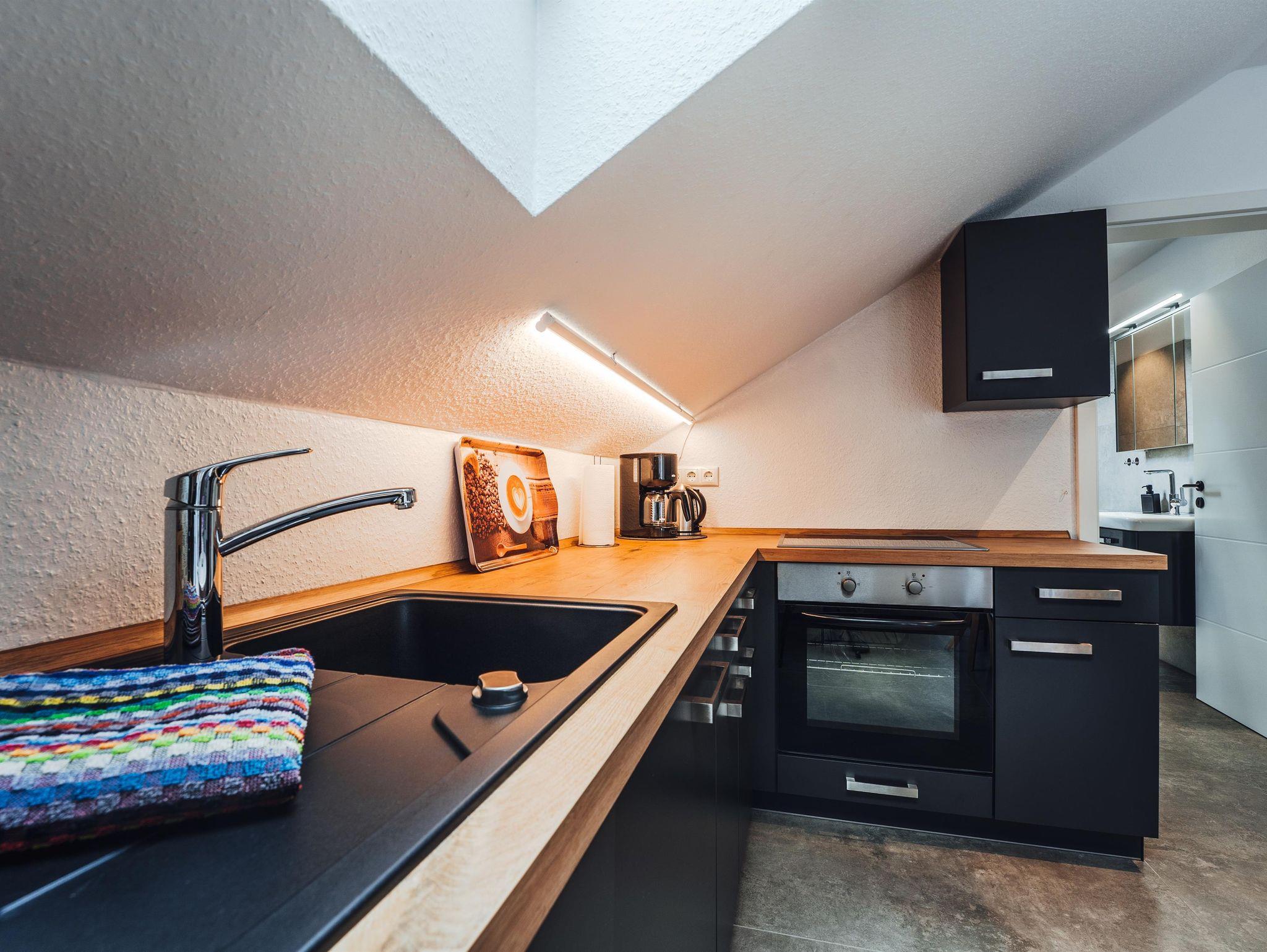 Die hell und modern eingerichtete Ferienwohnung für zwei Personen, befindet sich im Obergeschoss des Ferienhauses. Sie verfügt über eine komplett eingerichtete Küchenzeile im Wohn-Essbereich, ein Schlafzimmer mit einem Doppelbett sowie ein Bad mit WC und Dusche. Genießen Sie die Ruhe und Sonne auf der möblierten Dachterrasse.