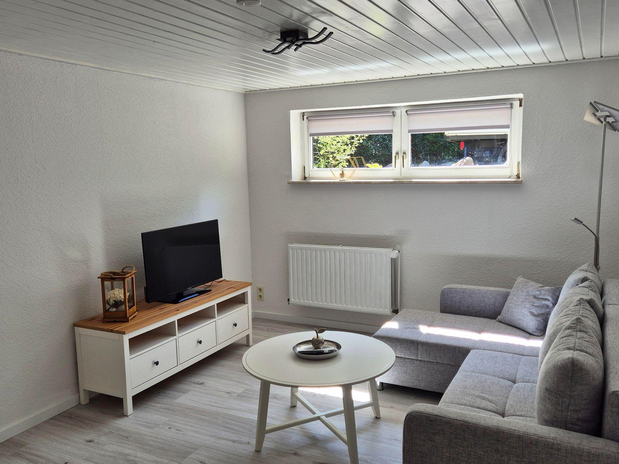 Die 55m² große Ferienwohnung für bis zu 3 Personen befindet sich im Souterrain. Sie ist hell und modern eingerichtet und verfügt über einen Flur mit Garderobe, eine gut ausgestattete Küche, ein Wohnzimmer mit einer Schlafcouch für die dritte Person, ein Schlafzimmer mit zwei Einzelbetten, welche auf Wunsch zusammengestellt werden können. Im Schlafzimmer befindet sich ein zusätzlicher Flachbildfernseher. Das Bad ist mit einer Dusche und einem WC ausgestattet.