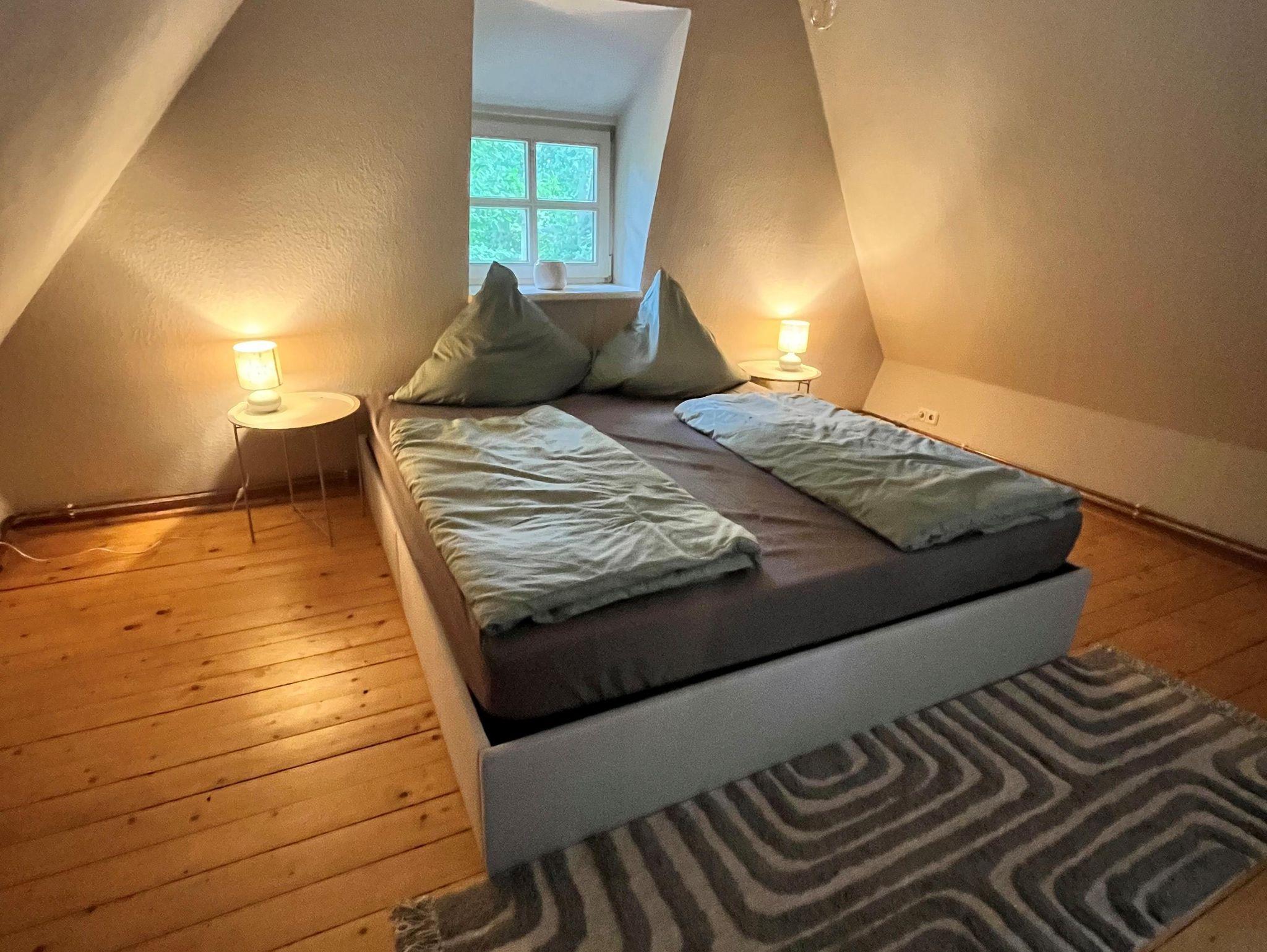 Das Obergeschoss ist über eine schmale Treppe erreichbar. Dort befinden sich die Schlafzimmer, eins mit einem Doppelbett und eins mit zwei Einzelbetten, die jedoch auch zusammengestellt werden können.