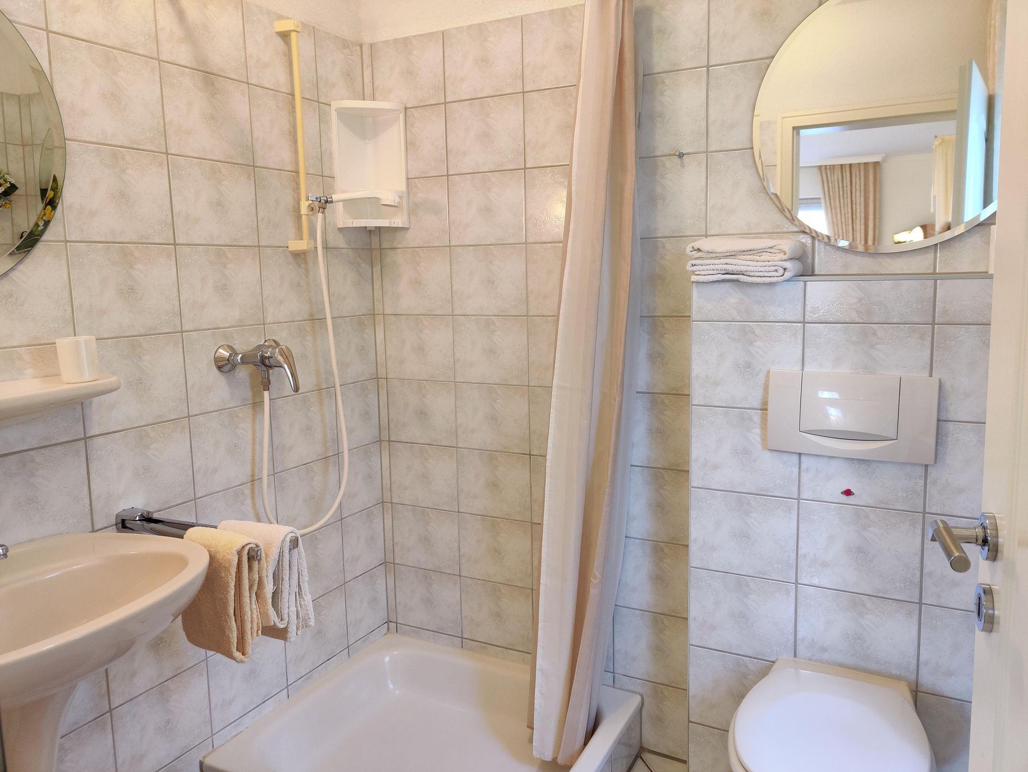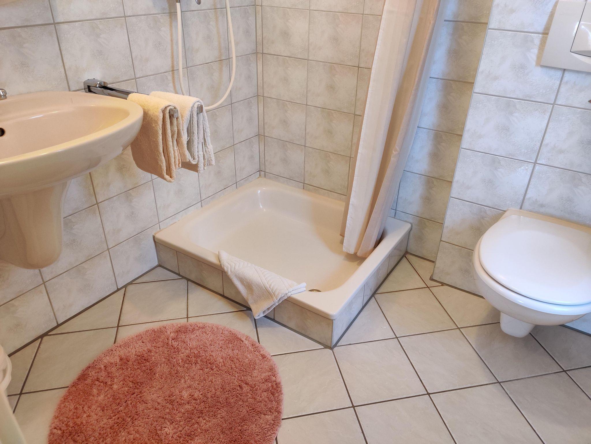 Hell und freundlich eingerichtetes Doppelzimmer mit Dusche und WC sowie Balkon.