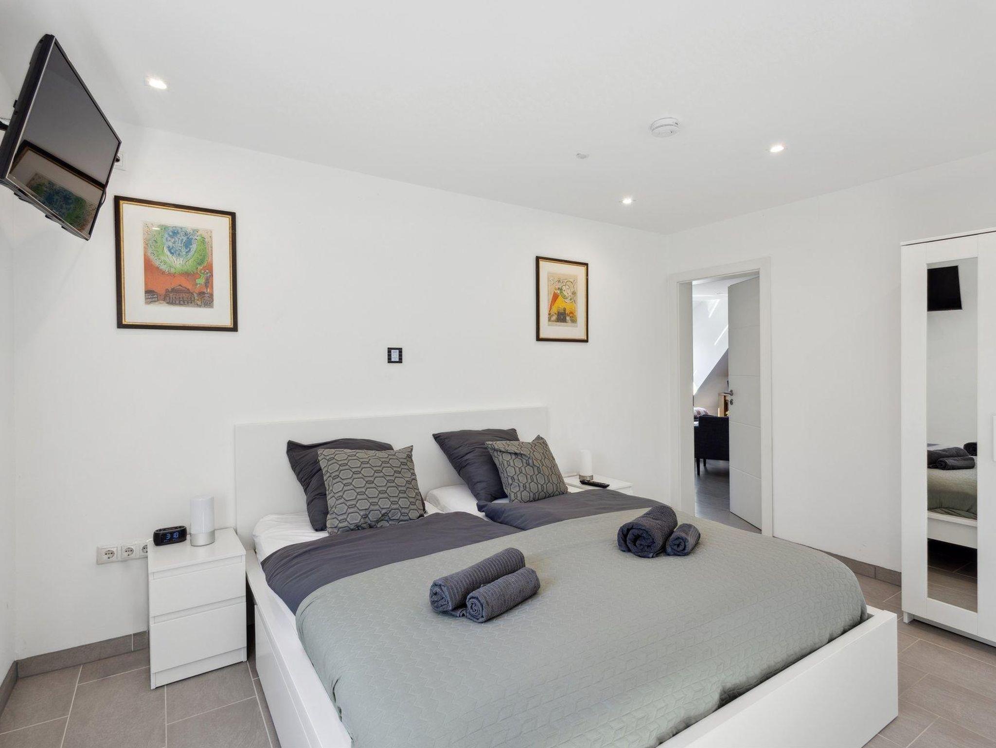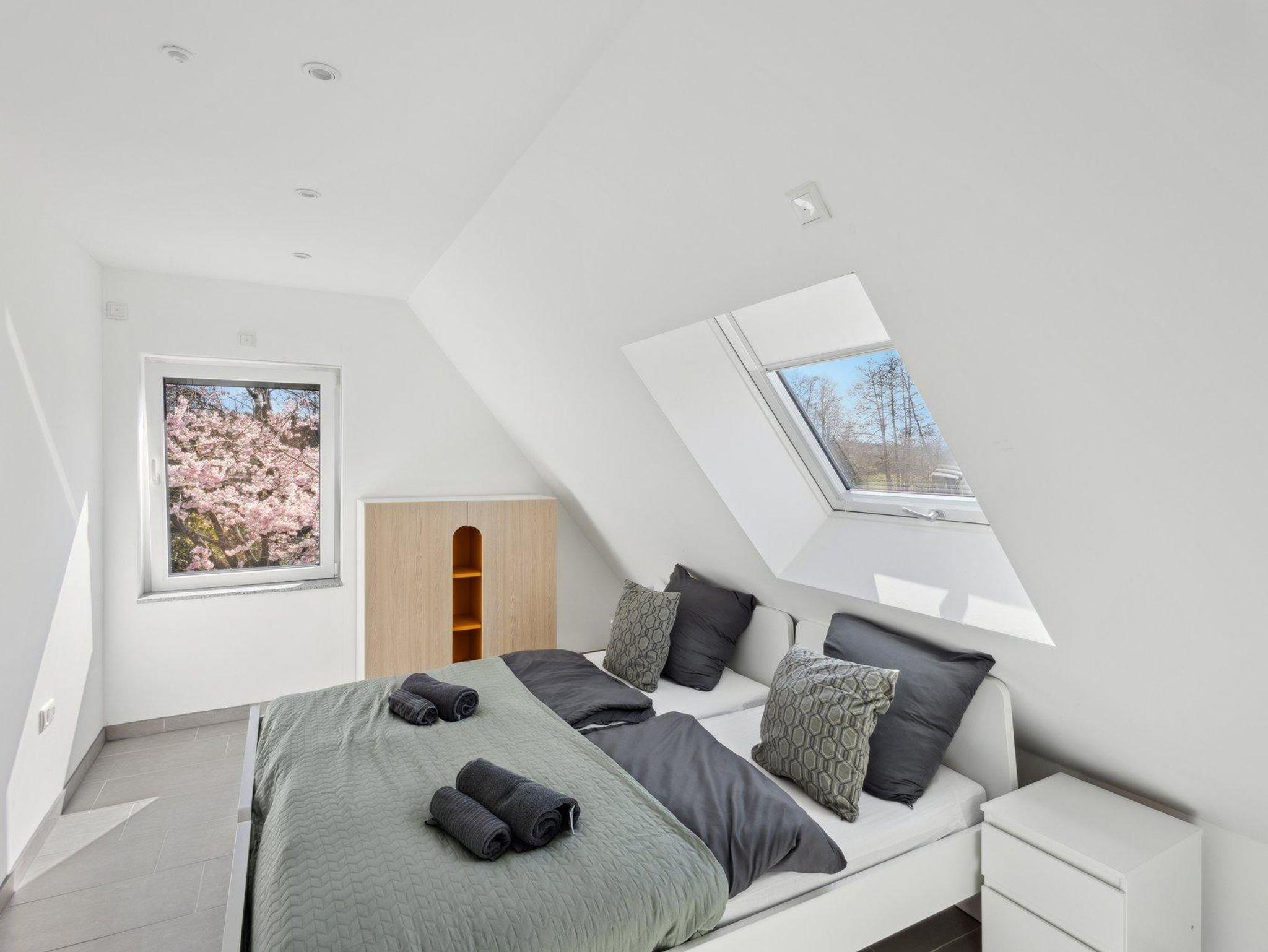 Es stehen zwei separate Schlafzimmer zur Verfügung: eines mit einem Doppelbett, das andere mit zwei Einzelbetten.
