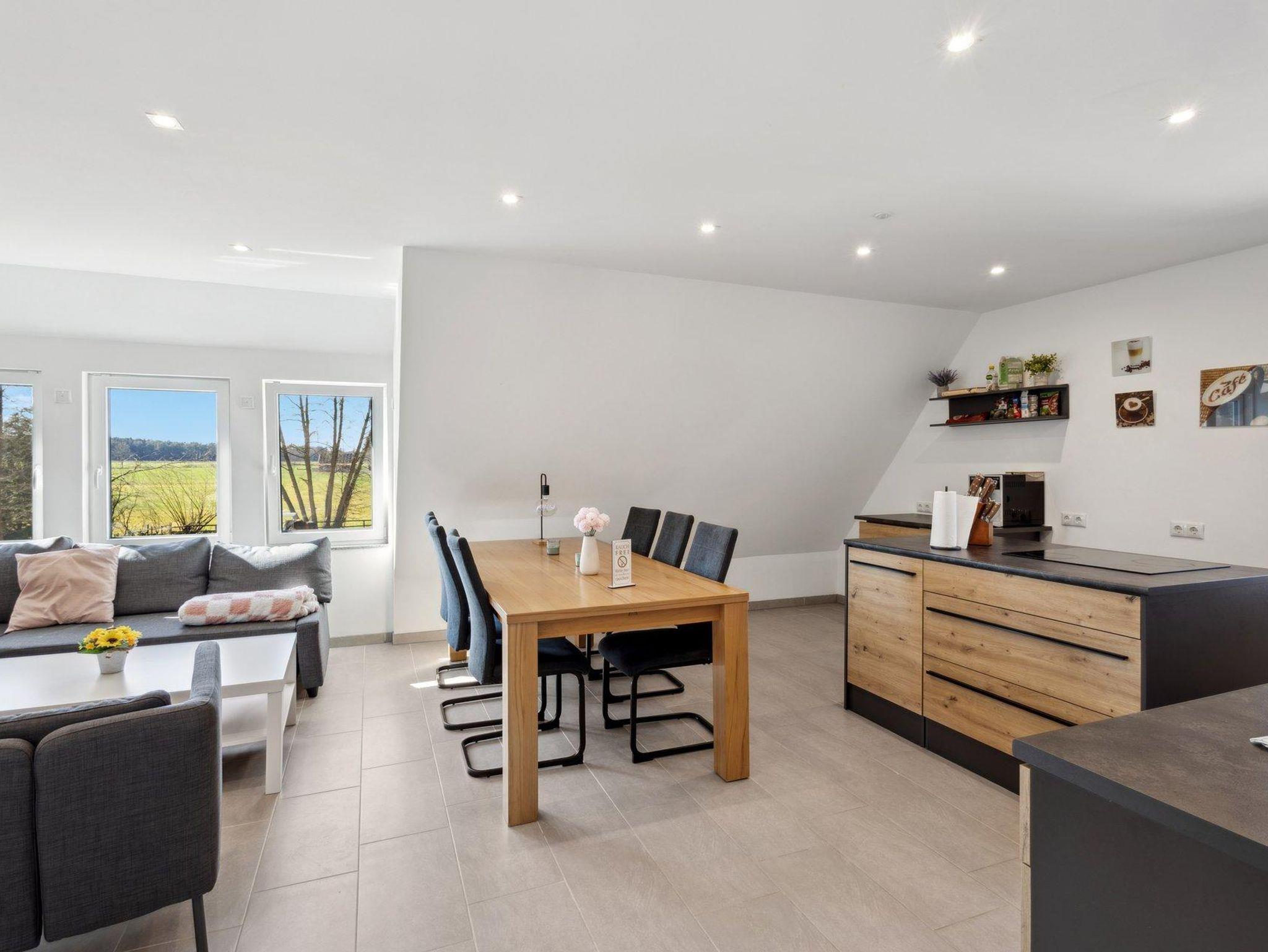 Diese Ferienwohnung bietet Komfort für bis zu 6 Personen. Der zentrale Wohnbereich vereint Wohnzimmer und Küche zu einer großzügigen Wohnküche – ausgestattet mit einem Kaffeevollautomat, einer Geschirrspülmaschine und einem gemütlichen Essbereich. Ein Flachbild-TV sowie ein Sofa, das sich in eine Schlafgelegenheit für die 5. und 6. Person umwandeln lässt.