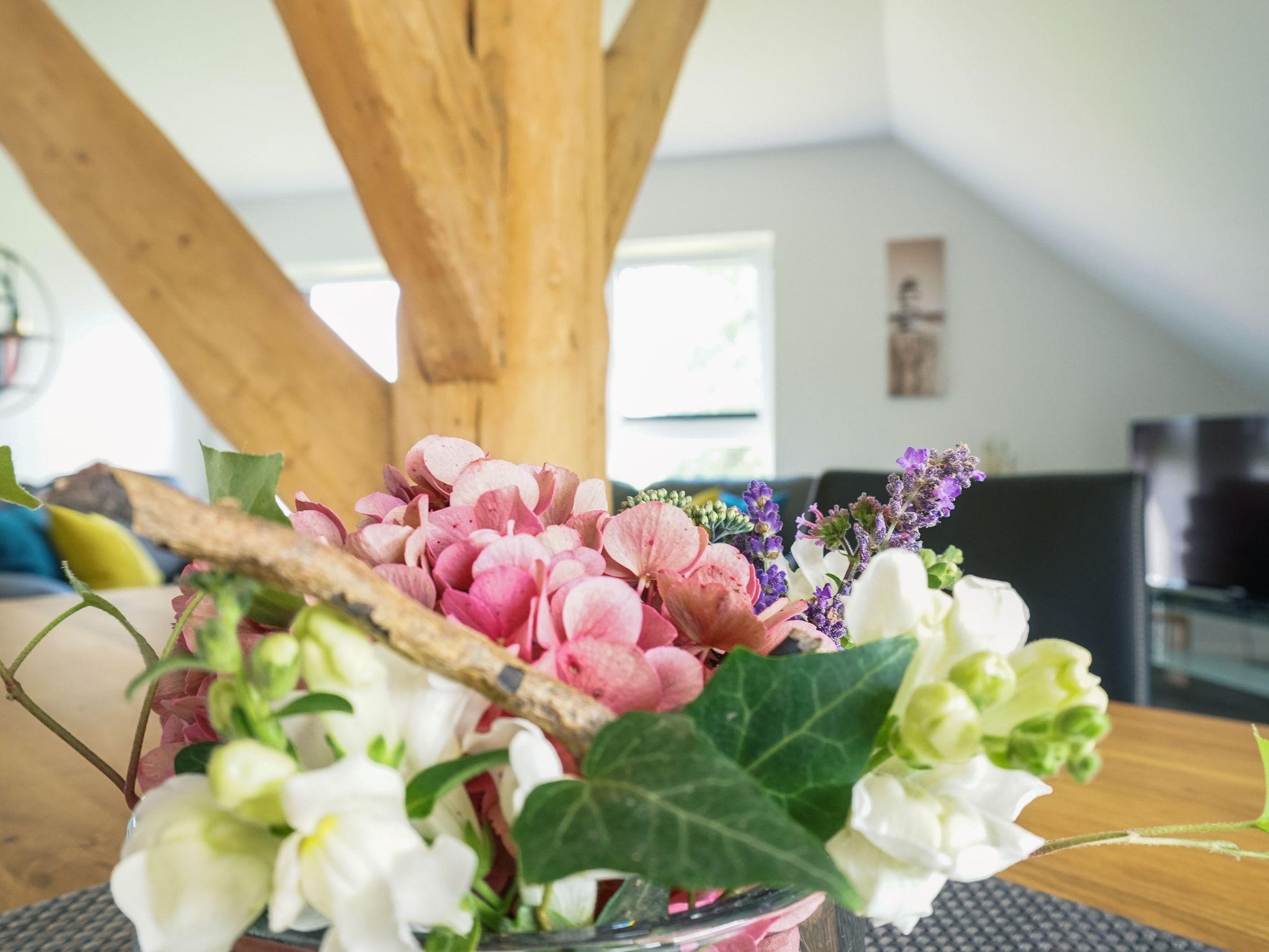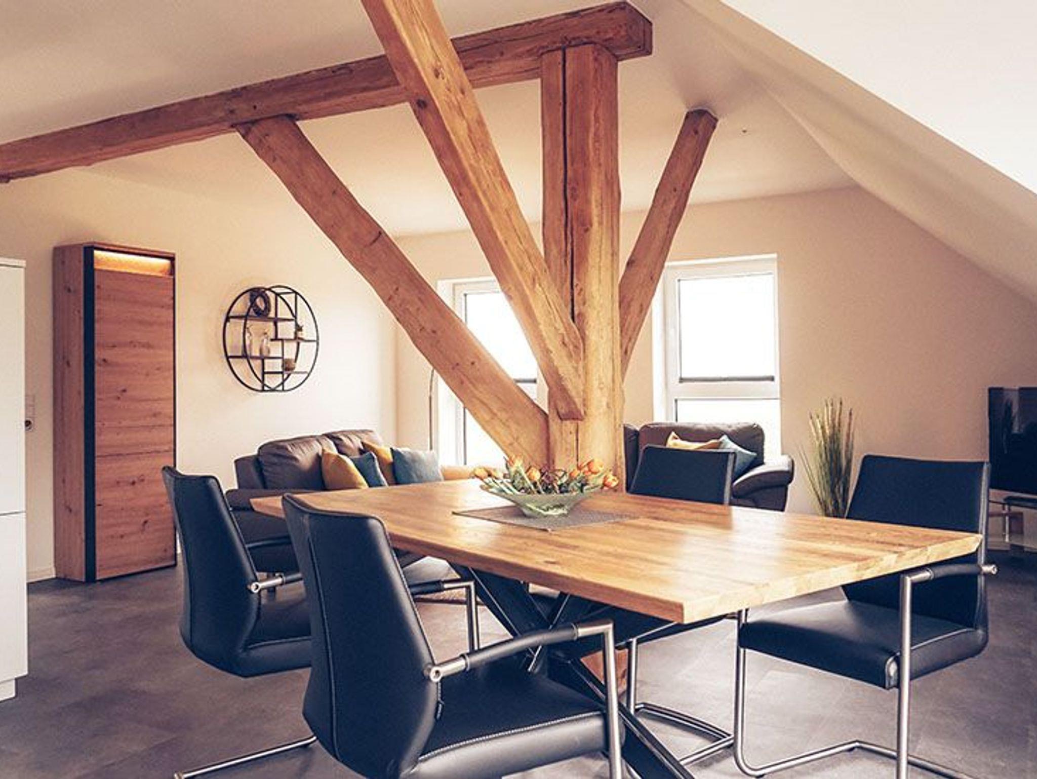 Besonderes Flair entsteht auch hier durch das offene Gebälk des alten Bauernhauses, welches optische Akzente setzt und zur gemütlichen Atmosphäre der Wohnung beiträgt. Bis zu 4 Personen können in dieser Wohnung den Urlaub genießen. Hierfür steht neben einem Schlafzimmer mit einem Doppelbett noch ein kleines Zimmer mit zwei Einzelbetten zur Verfügung. Ebenfalls gehört zu dieser Wohnung auch ein Balkon der Ihnen z. B. in den Abendstunden einen herrlichen Rückzugsort mit Blick auf die Weser bietet.