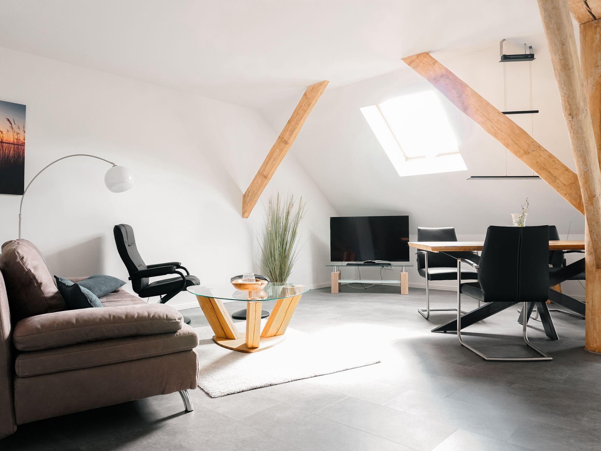 Modern und gemütlich! Diese 65m² große Ferienwohnung, davon 42m² Wohn- und Essbereich mit vollständig ausgestatteter Küchenzeile überzeugt durch die besondere Architektur mit freiliegenden Balken des alten Bauernhauses und erzeugt einen besonderen Charme in dem Sie sich wohlfühlen werden! Neben dem Badezimmer, einem großzügigem Schlafzimmer mit einem Doppelbett, einem kleinen Zimmer mit einem Einzelbett und einem Schlafsofa im Wohnzimmer gehört zu dieser Wohnung auch ein Balkon der Ihnen den Ausblick auf den denkmalgeschützten Leuchtturm sowie die vorbeiziehenden Schiffe auf der Weser gewährt.