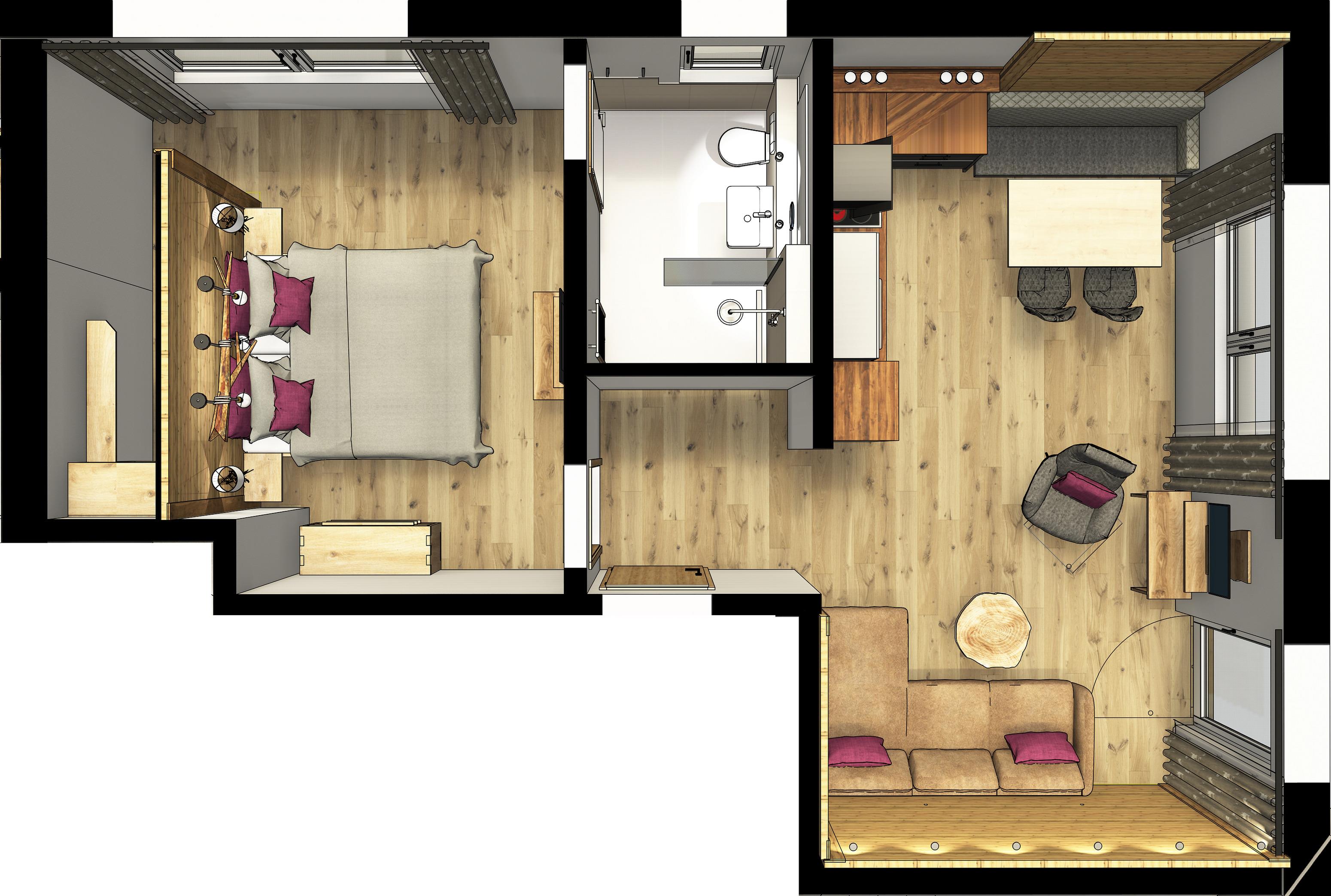 Mit 50-60 m² ist das Standard Maximilian Appartement unsere kleinste Kategorie mit einer voll ausgestatteten Wohnküche, ein gemütliches Sofa mit Schlaffunktion und ein zusätzlicher Loungesessel zum Entspannen. Ein gemütliches Schlafzimmer mit Boxspringbett und ein geräumiges Bad mit begehbarer Regendusche runden den Wohlfühlfaktor ab.