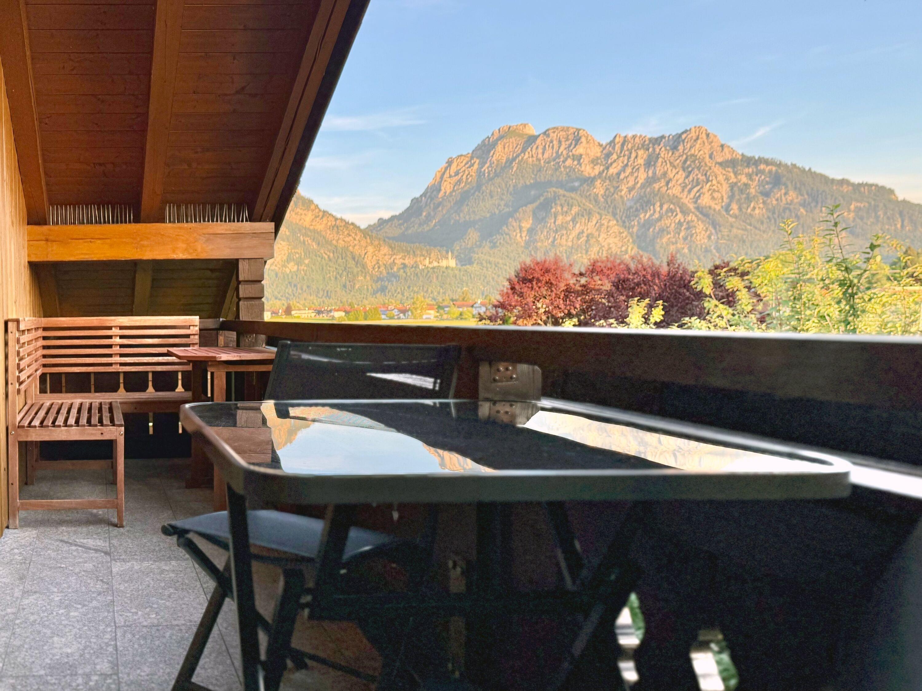 Genießen Sie den königlichen Schloss- und Alpenblick vom Süd-Westbalkon aus, direkt auf das Schloss Neuschwanstein.