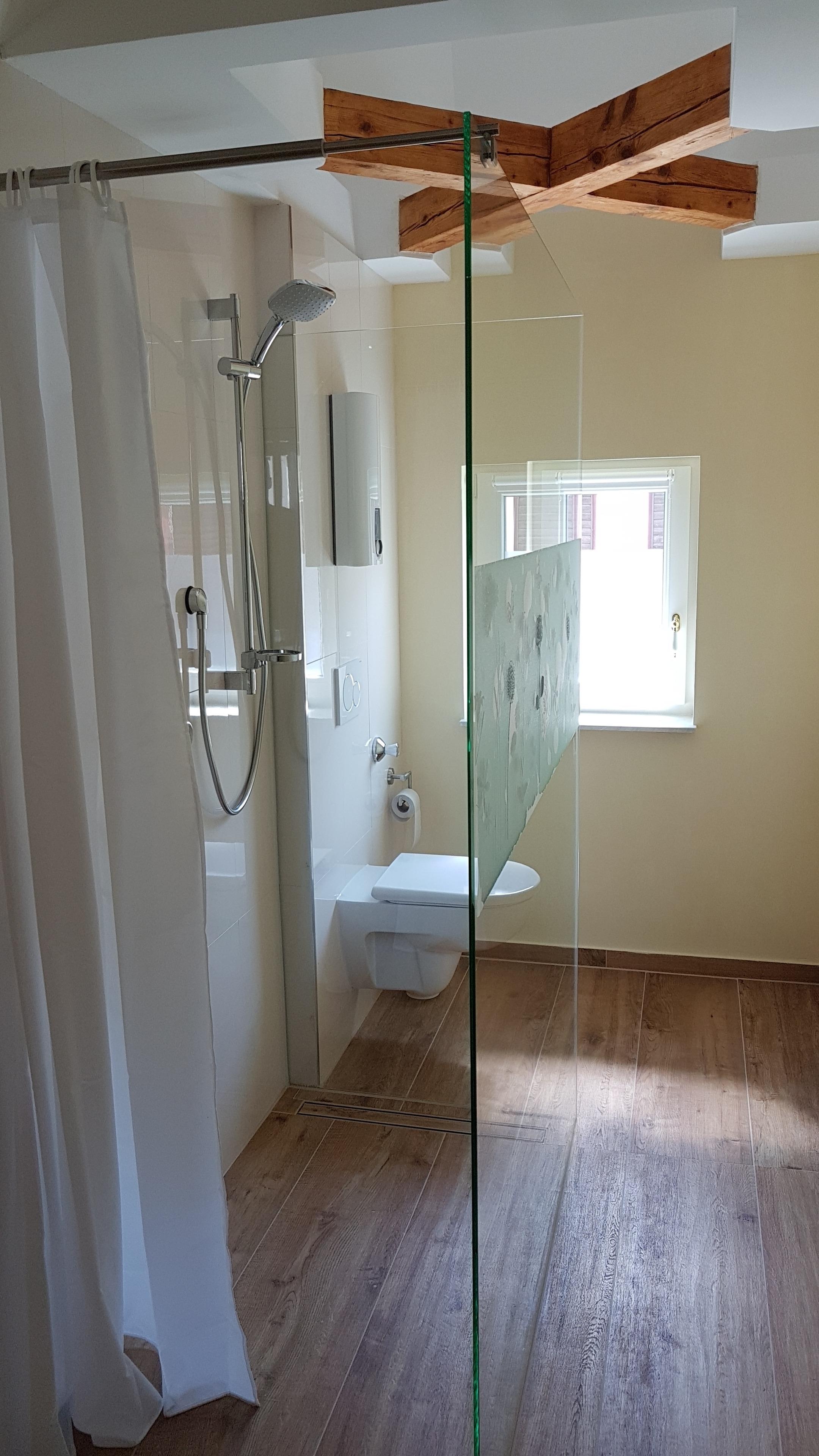 Separates Duschbad mit WC, Fön, Ablage.