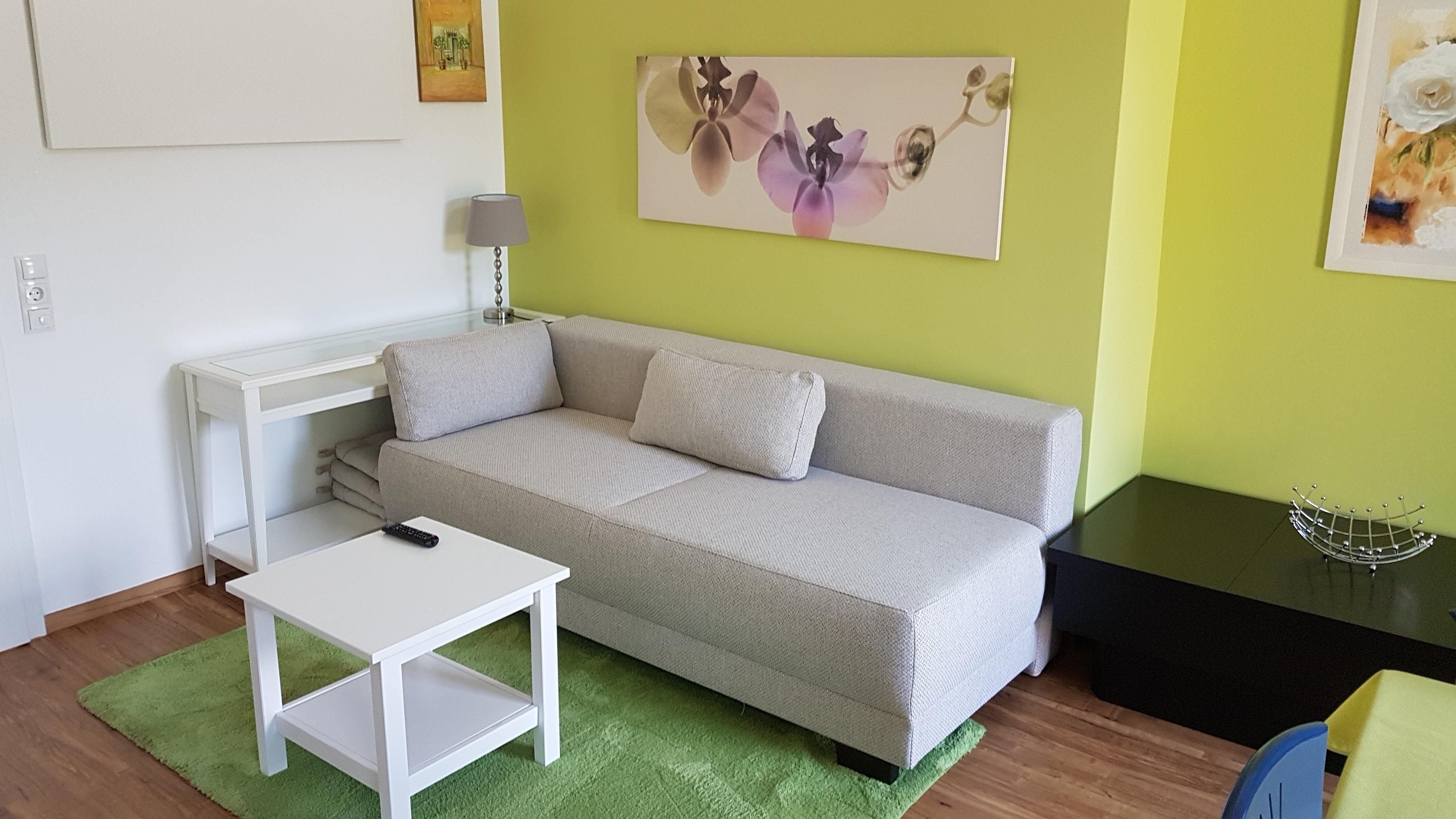 Schreibtisch, Ablage, Stuhl, Schlafcouch (für 3. Person), Couchtisch, Sessel, Flachbild-TV, WLAN-Anschluß, Stehlampe