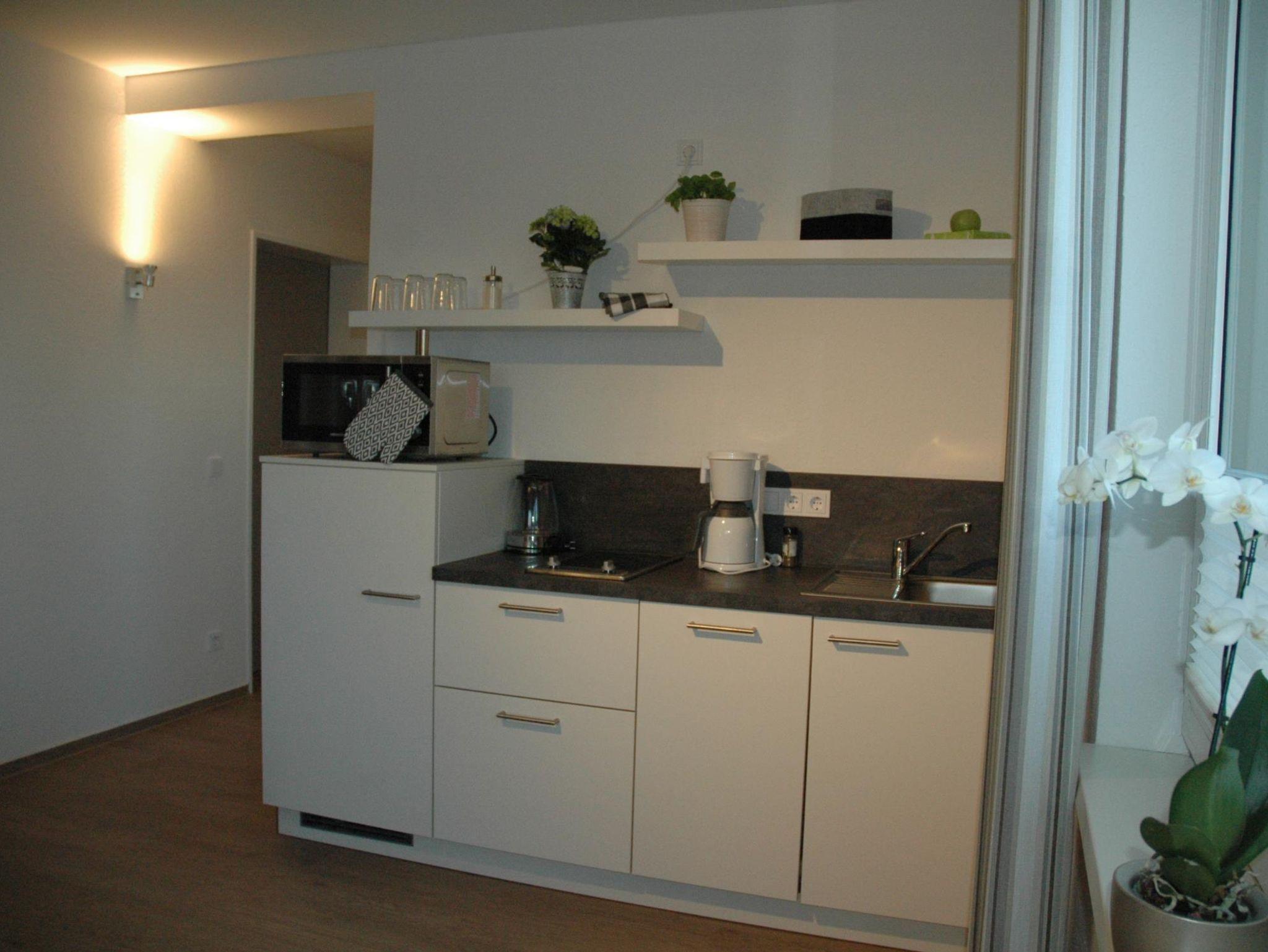 Moderne Küchenzeile und Badezimmer.