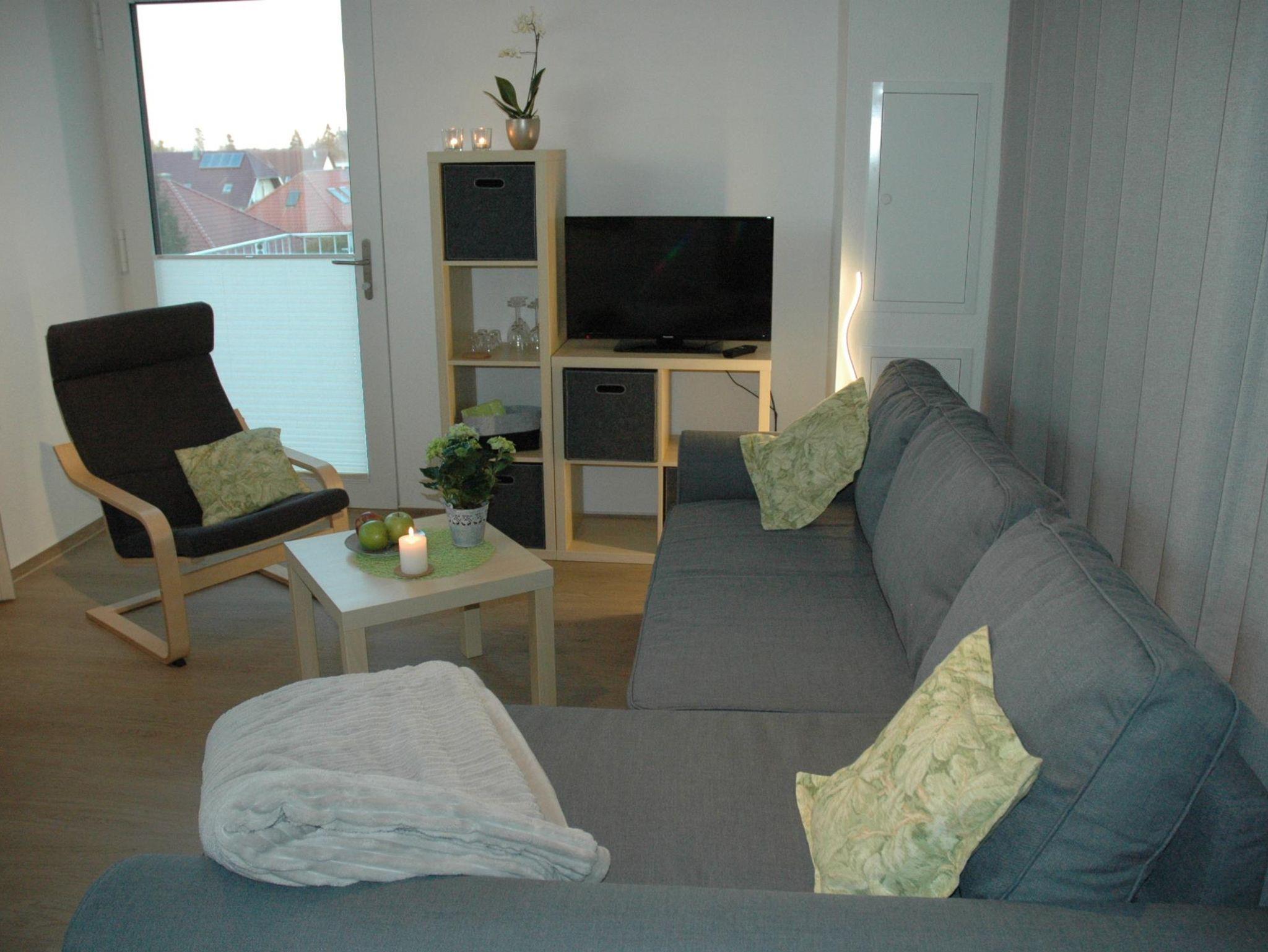 Gemütlich eingerichtete Einzimmerwohnung. Das bequeme Sofa lädt zum Entspannen vor dem Fernseher ein und kann abends mit ein paar Handgriffen zum Schlafplatz umgebaut werden.