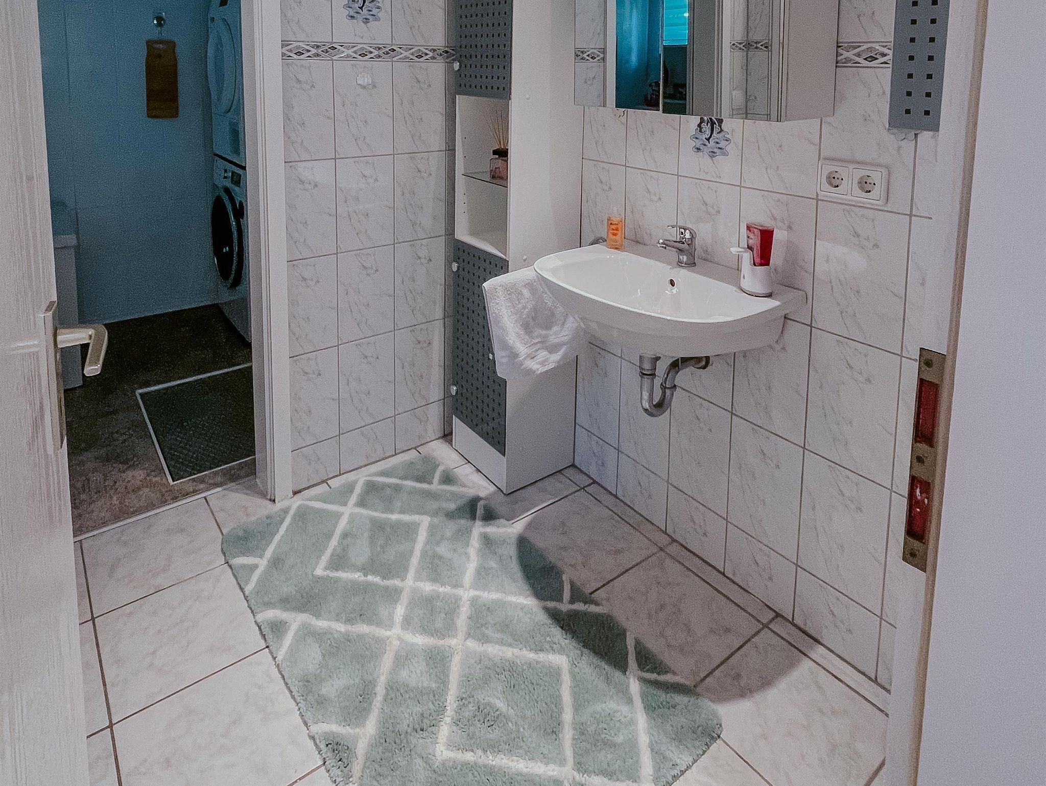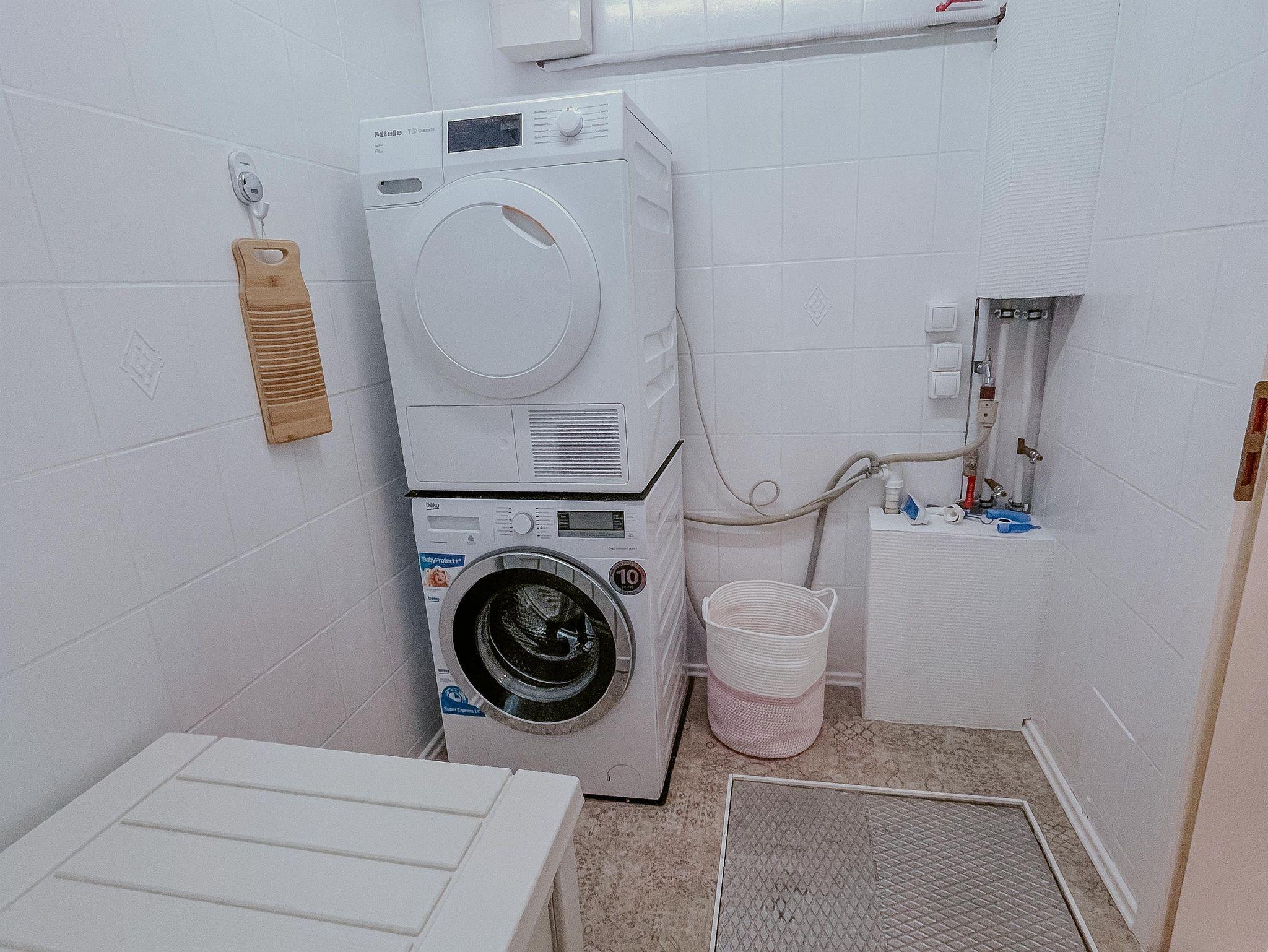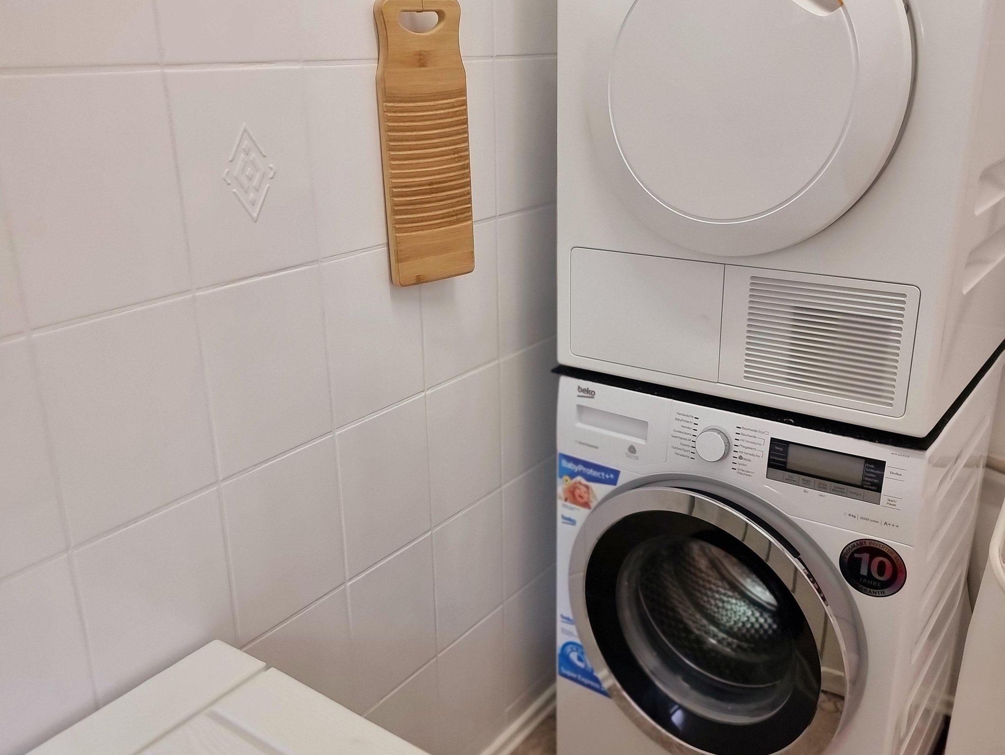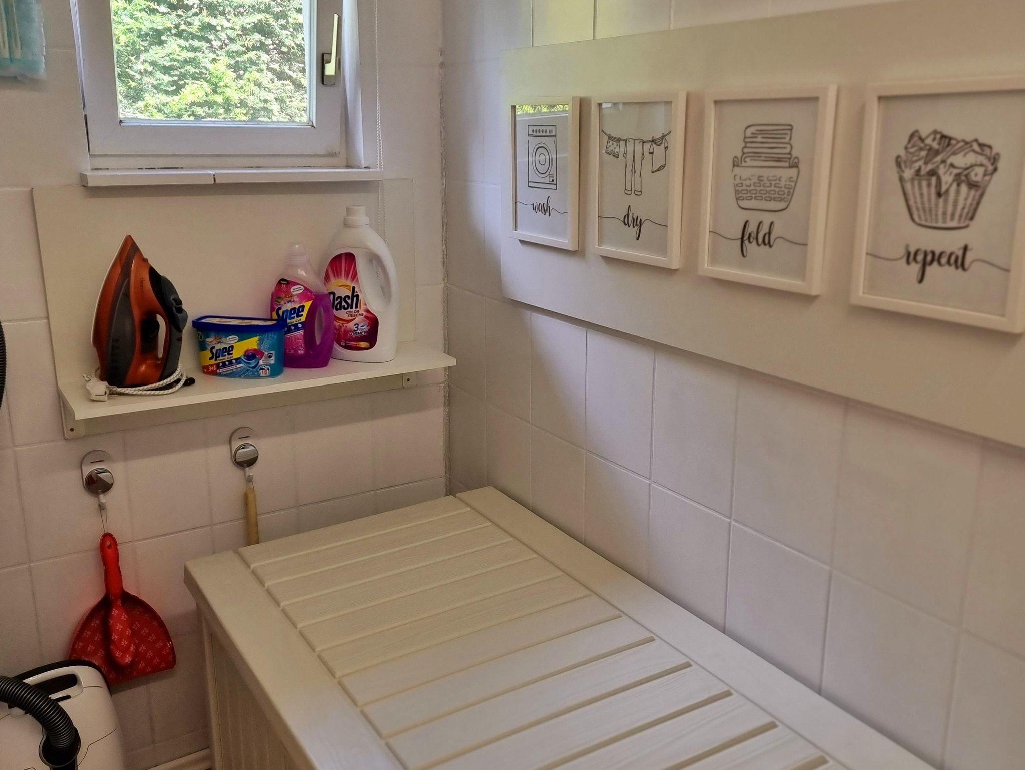 Waschmaschine und Trockner findet Ihr in einem separat im Gästehaus befindlichem Waschraum. Eine rustikale Waschtischplatte zaubert eine behagliche Atmosphäre und kann zum Waschen einzelner Kleidungsstücke verwendet werden.
