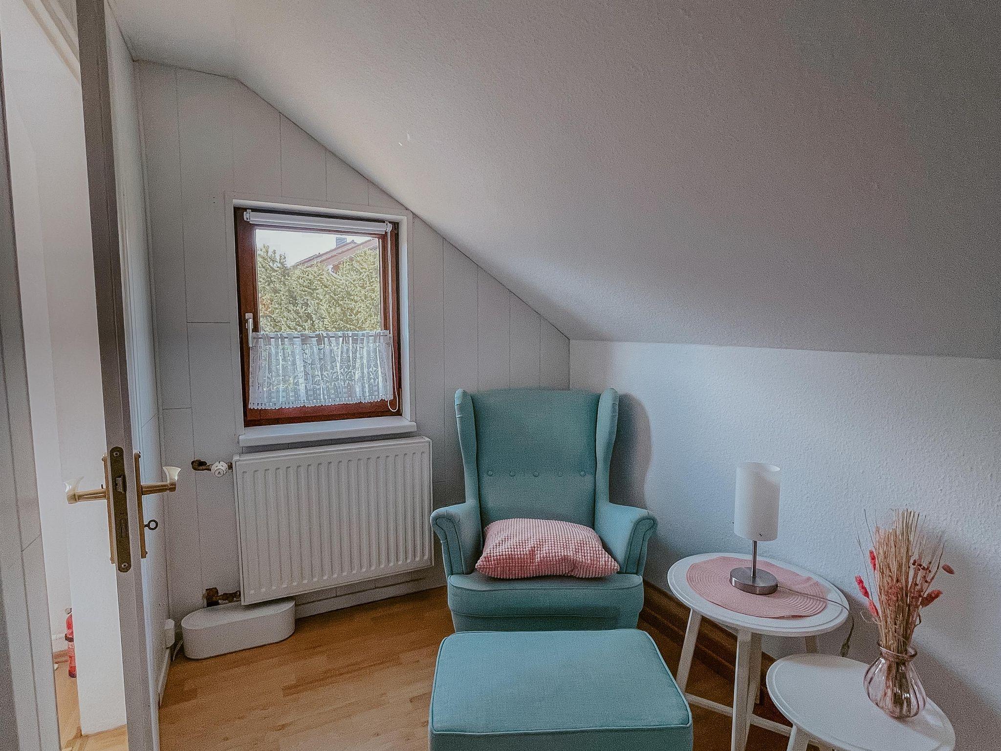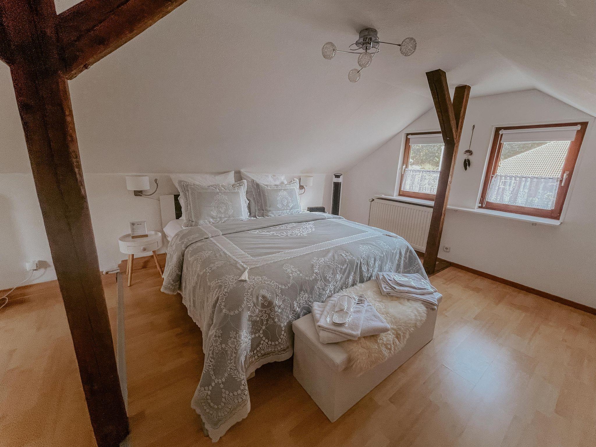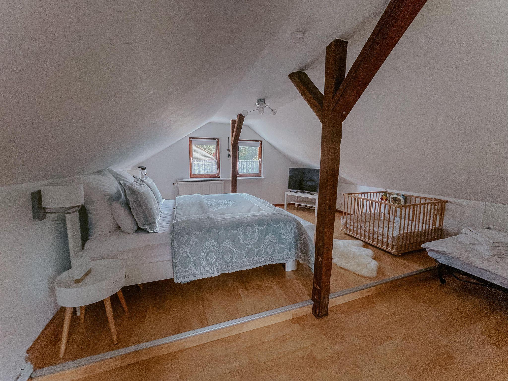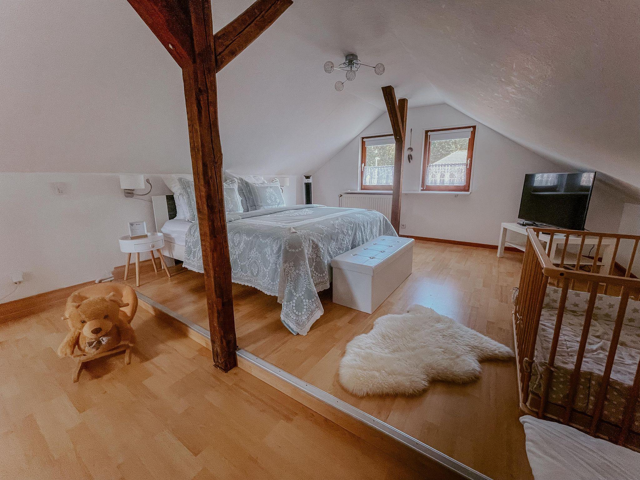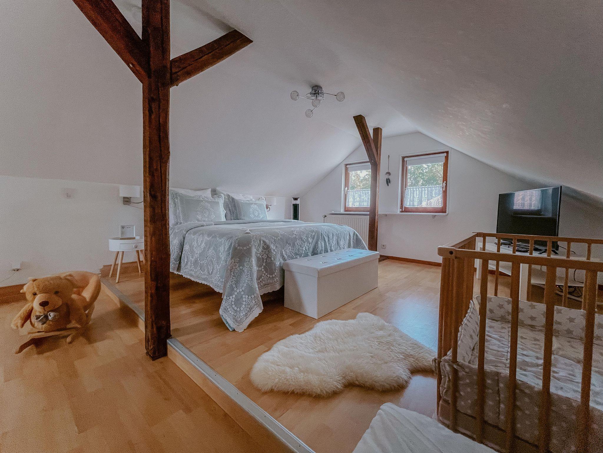 Durch die Treppe gelangt Ihr ins Obergeschoss, welches ebenfalls mit TV ausgestattet ist. Das gemütliche King Size Bett bringt Euch in das Land der Träume. Des Weiteren findet Ihr hier ein