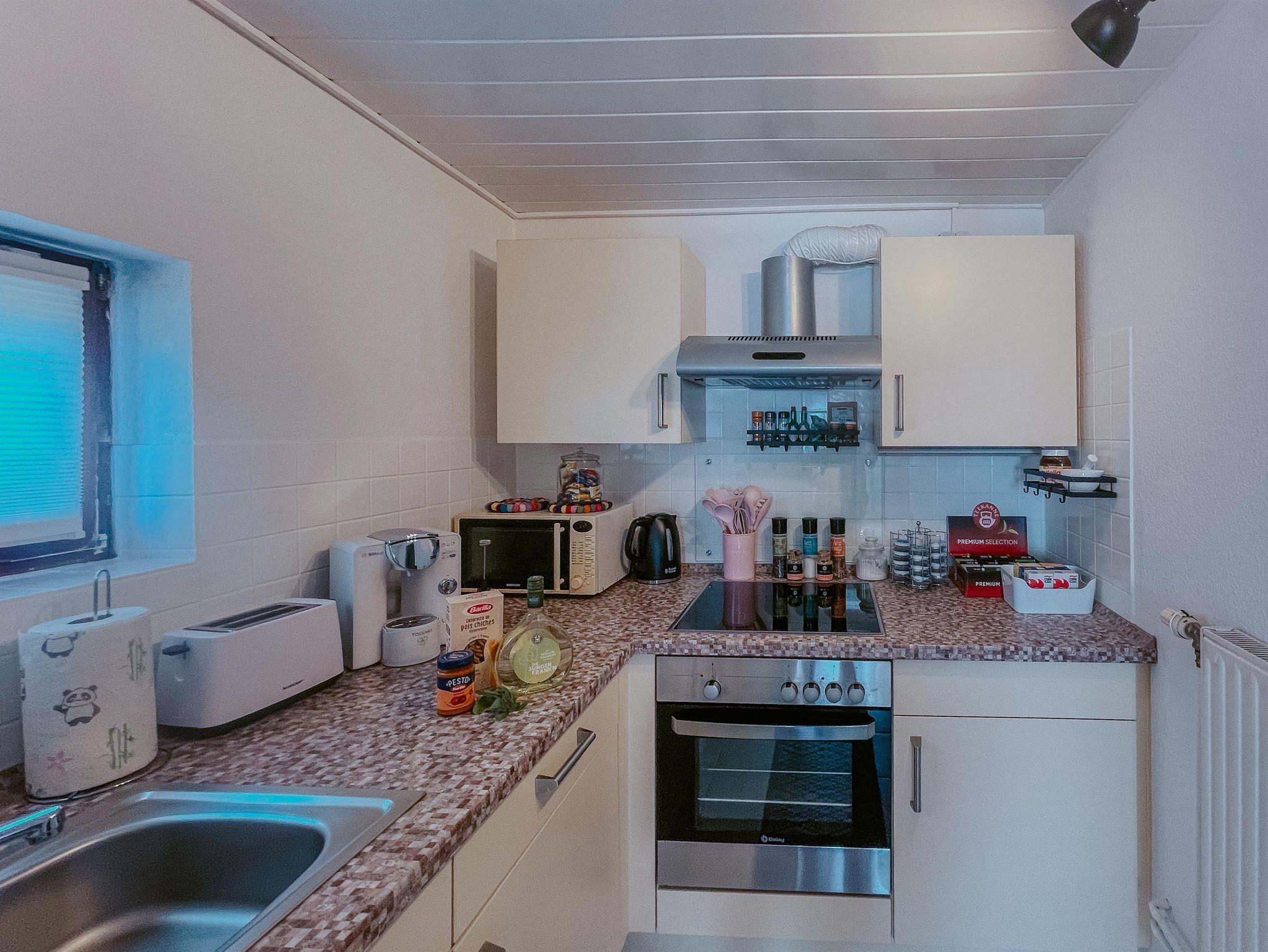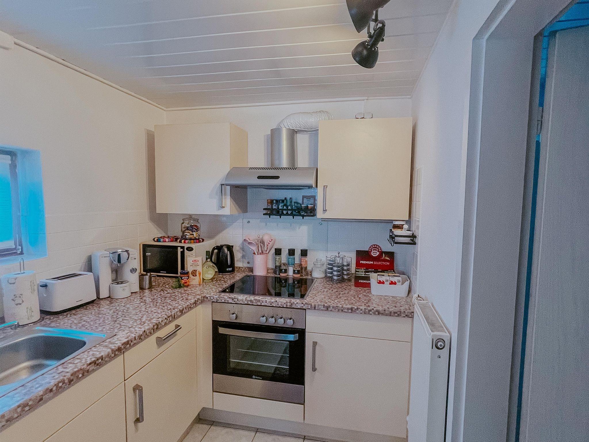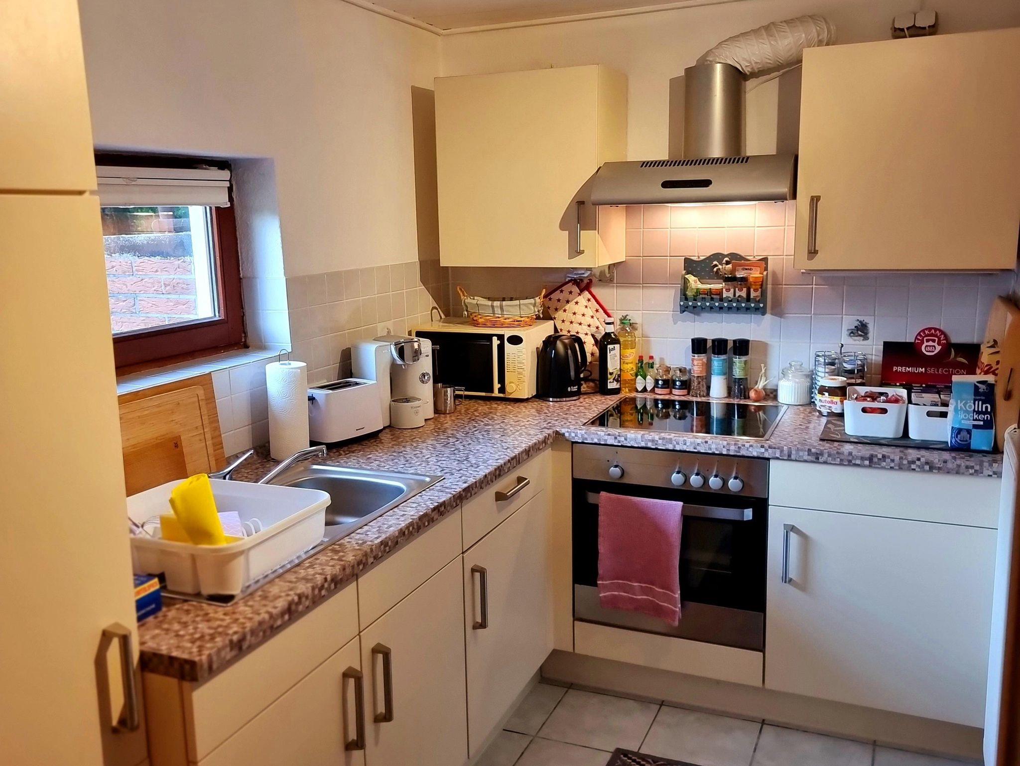 Die Küche ist perfekt ausgestattet. Besteck, Geschirr, Gläser, Töpfe und sämtliche Kochutensilien sind selbstverständlich. Hier punktet die Schwarmstedter Gastfreundschaft. Ein Kühlschrank, ein Backofen, ein Induktionskochfeld, ein Toaster, ein Wasserkocher und eine Mikrowelle für schnelle Gerichte dürfen nicht fehlen.