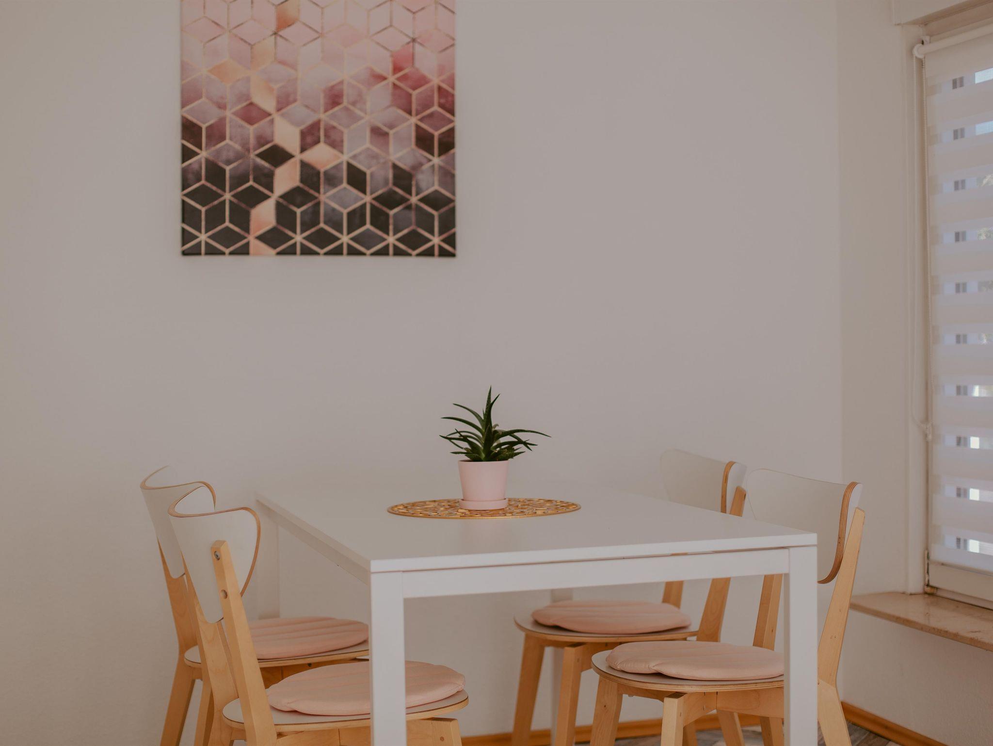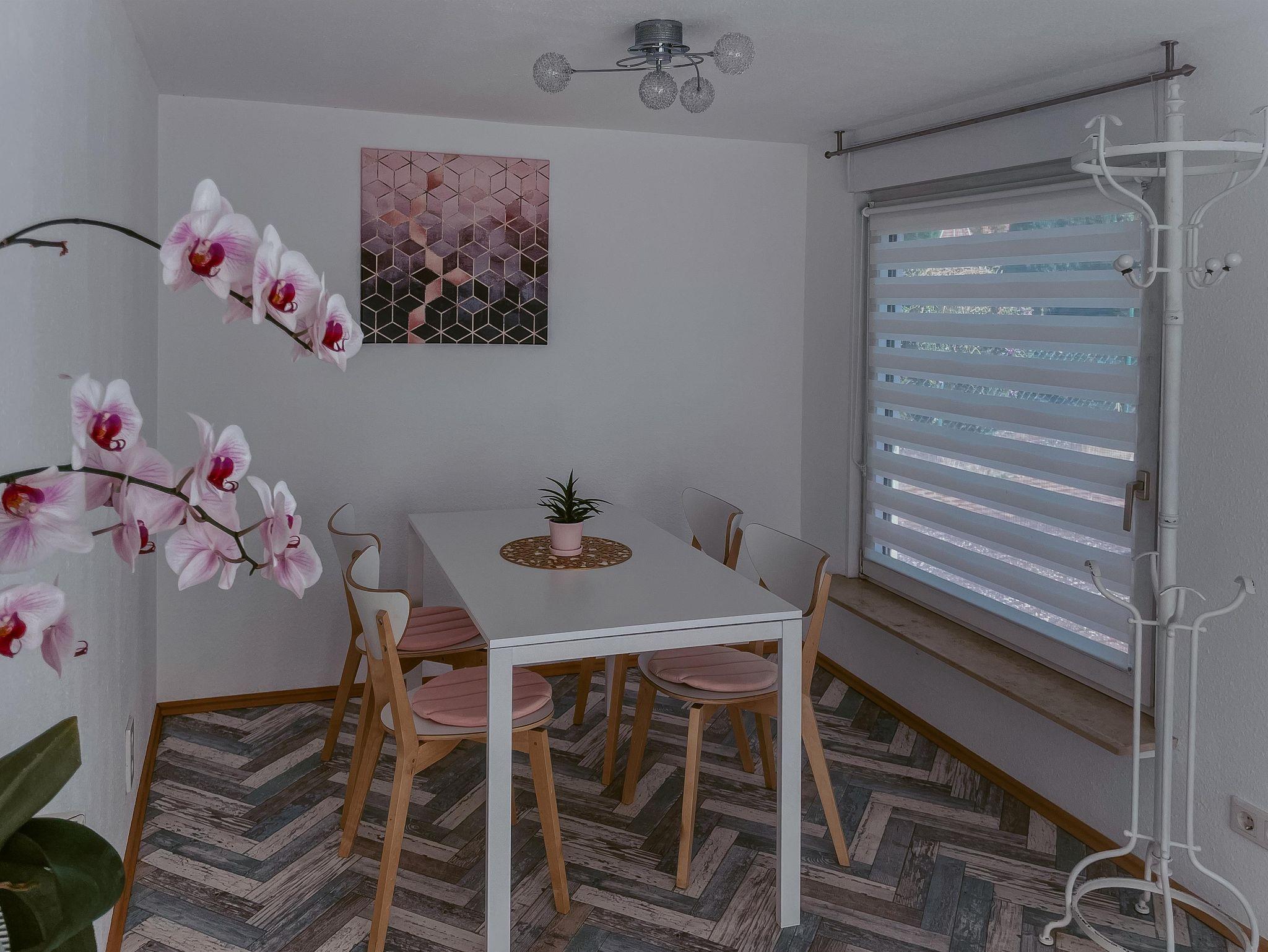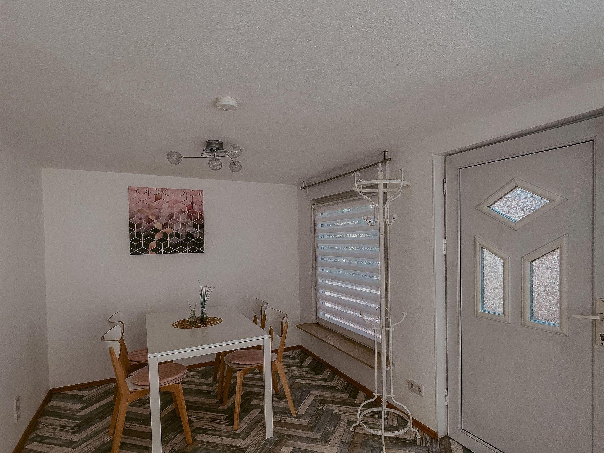 In unserem sogenannten „Wintergarten“ befindet sich der Eingangsbereich mit Garderobe und angrenzender Essecke. Durch die großen Fenster genießt Ihr den Blick nach draußen ins Grüne.