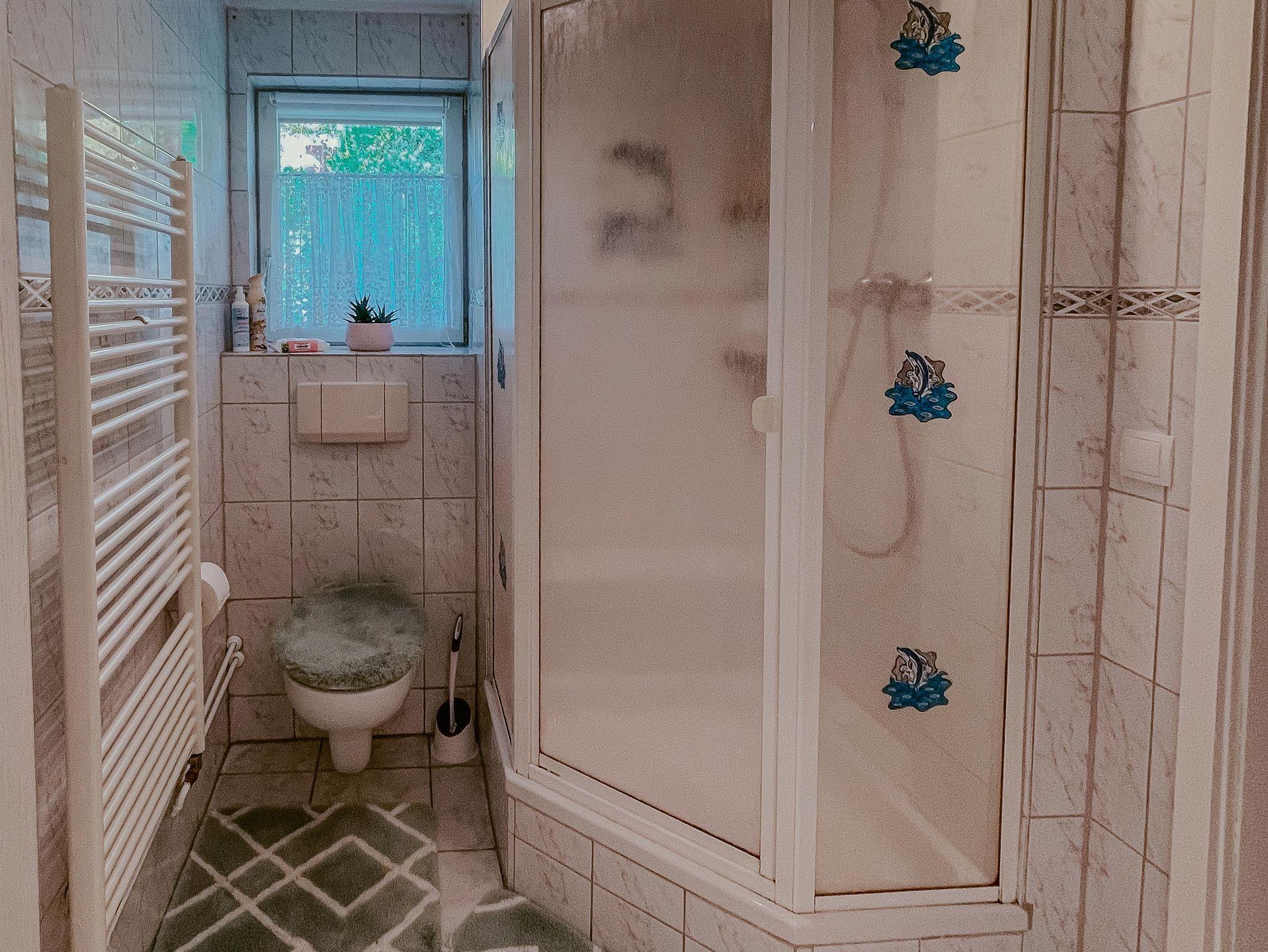Das geräumige Badezimmer verfügt über eine große Dusche mit Sitzmöglichkeit, die zum Entspannen einlädt.
