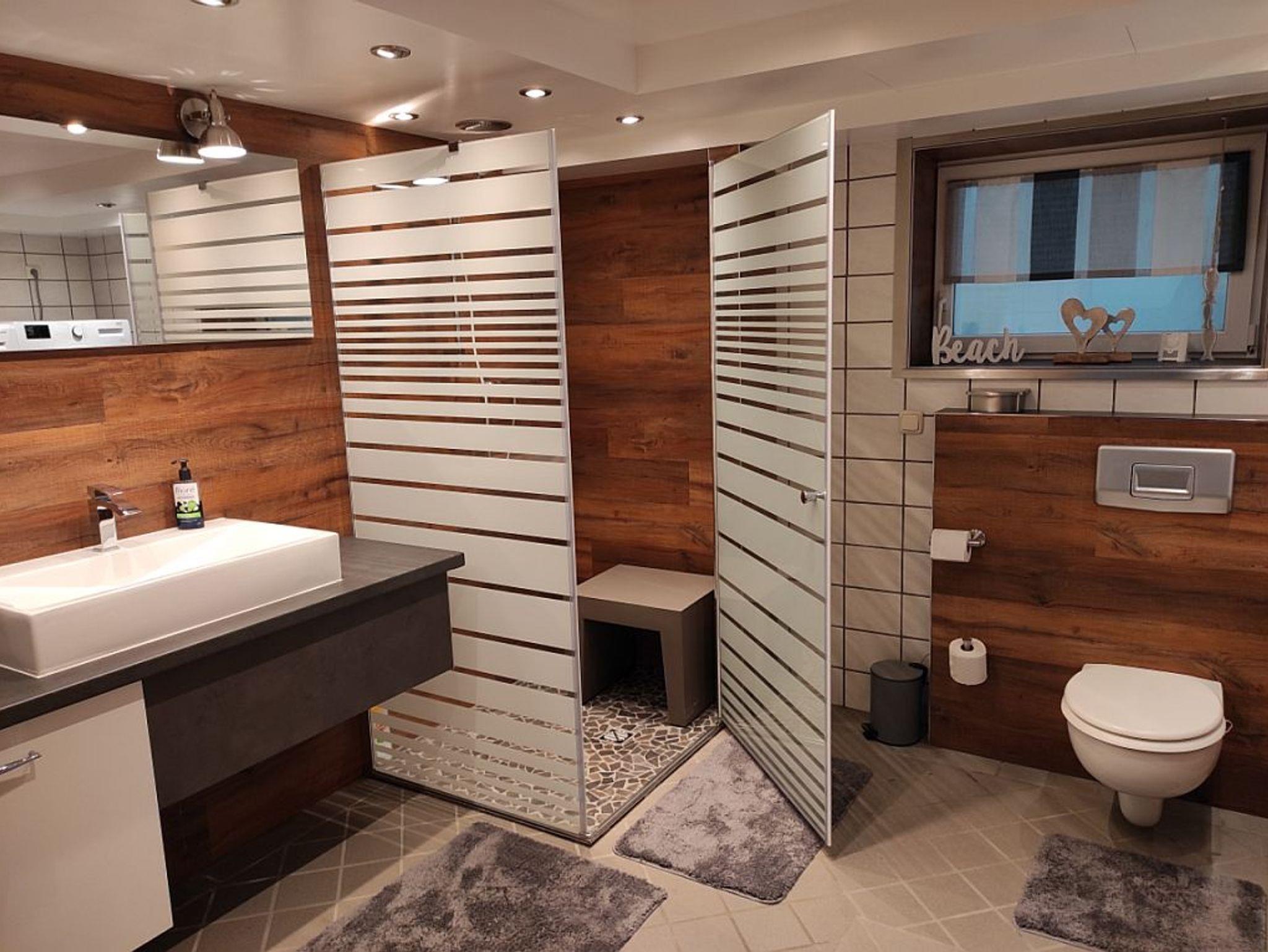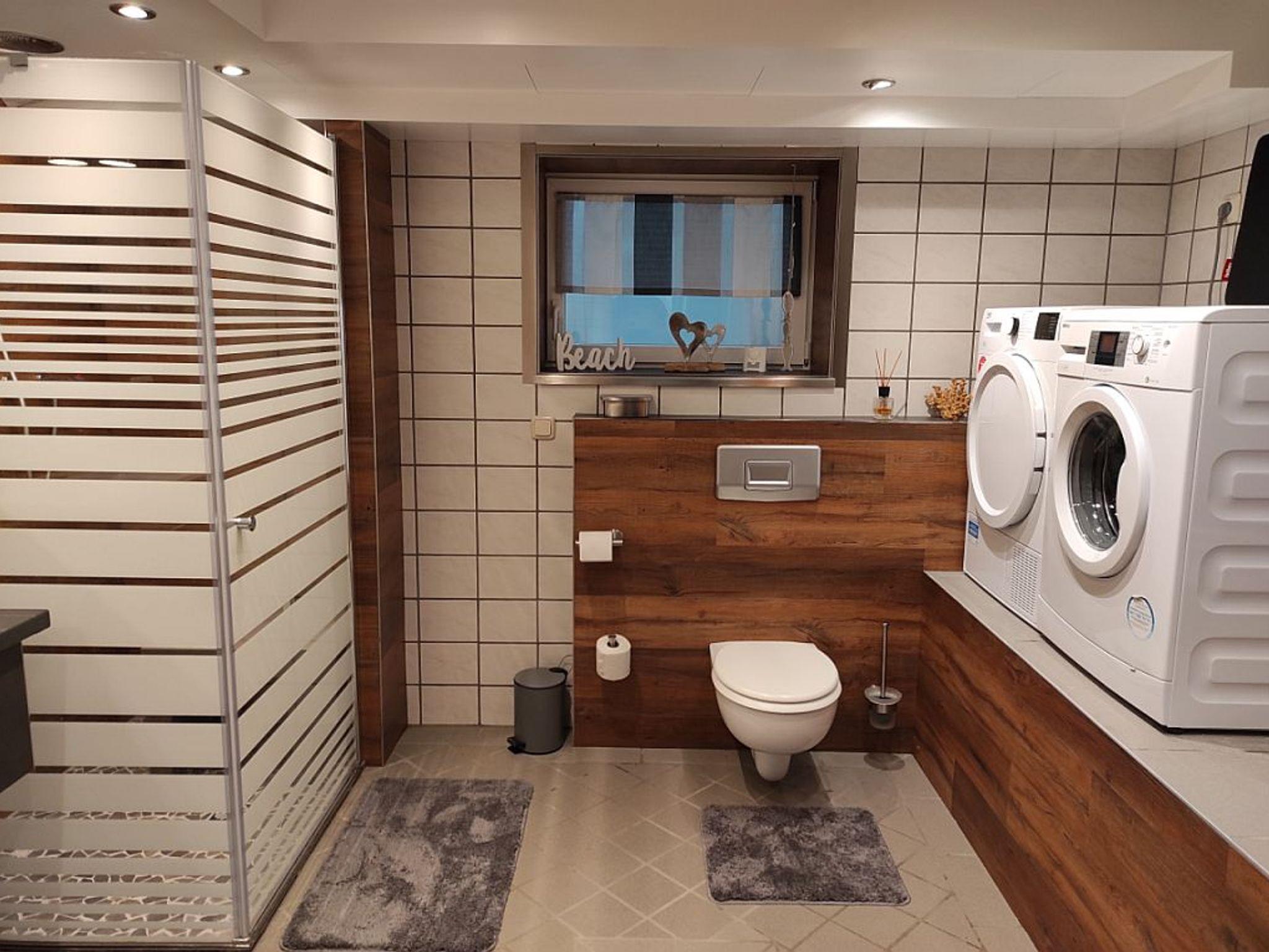 Das freundliche Badezimmer ist modern ausgestattet und bietet neben dem WC eine große Dusche mit flachen Einstieg und Sitzgelegenheit, sowie einen Waschtisch mit Unterschrank. Weiterhin besteht die Möglichkeit die Waschmaschine und den Trockner zu nutzen. Handtücher stehen ausreichend zur Verfügung.